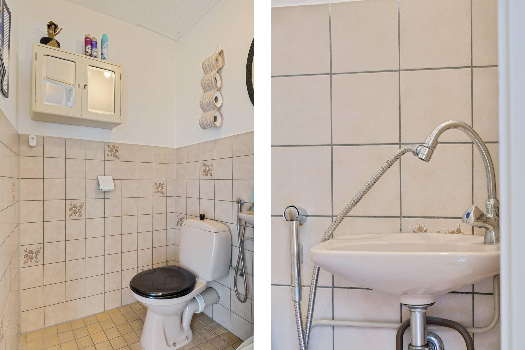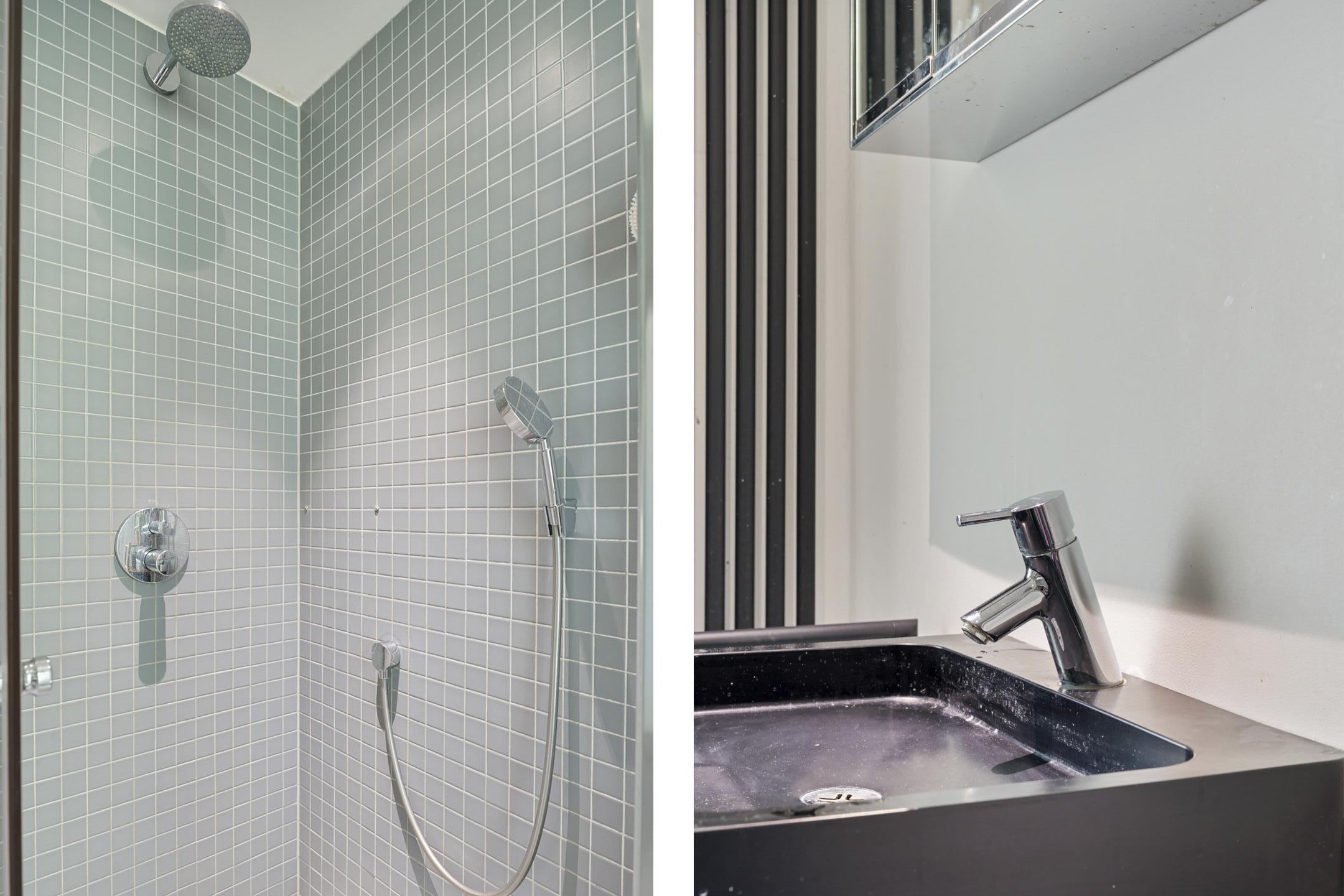 Ook de volledig betegelde badkamer ligt op deze verdieping, voorzien van een douche, wastafel en tweede toilet (Sanibroyeur). Vanuit hier loop je eveneens het balkon op, dat uitzicht biedt over de groene straat met volwassen bomen.