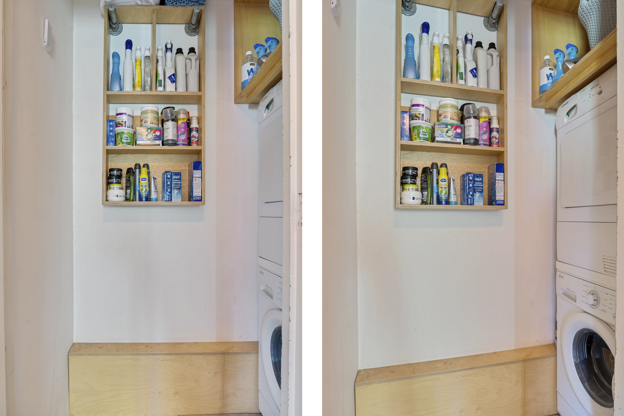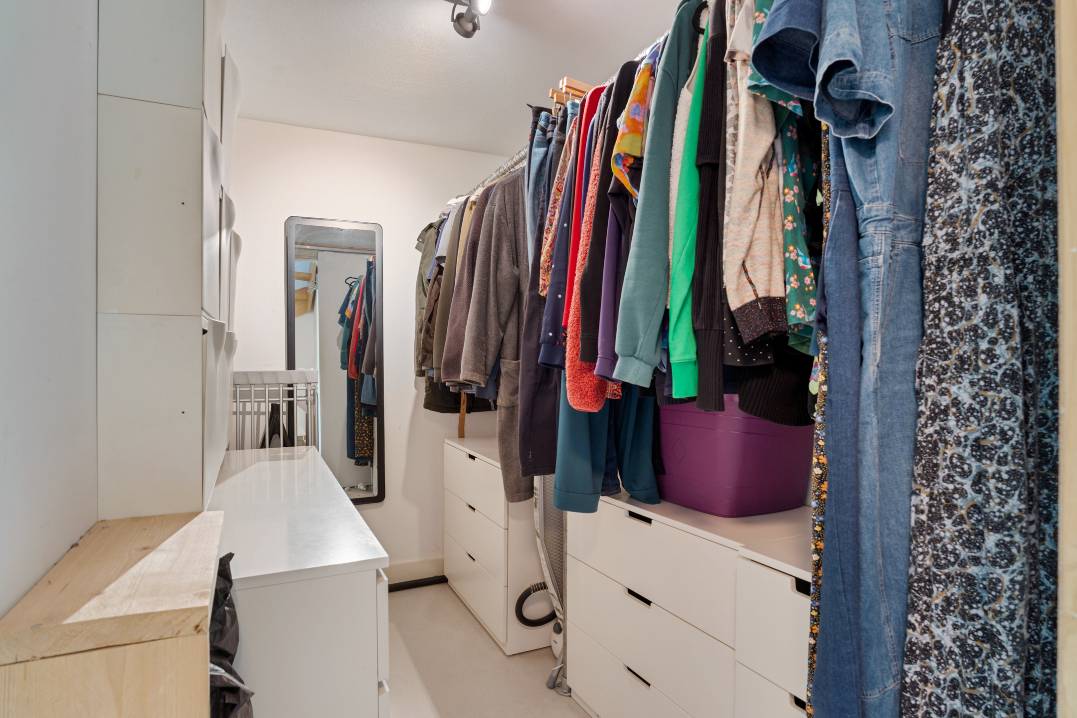 Op de halve derde verdieping vind je een overloop met vaste trap naar de zolderverdieping. Hier bevinden zich een ruime inloopkast, een vaste kast met aansluiting voor de wasmachine, en een slaapkamer aan de voorzijde met toegang tot het balkon.
