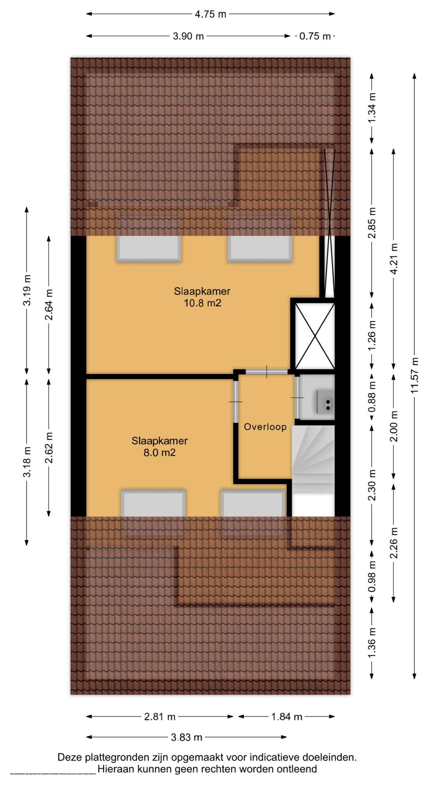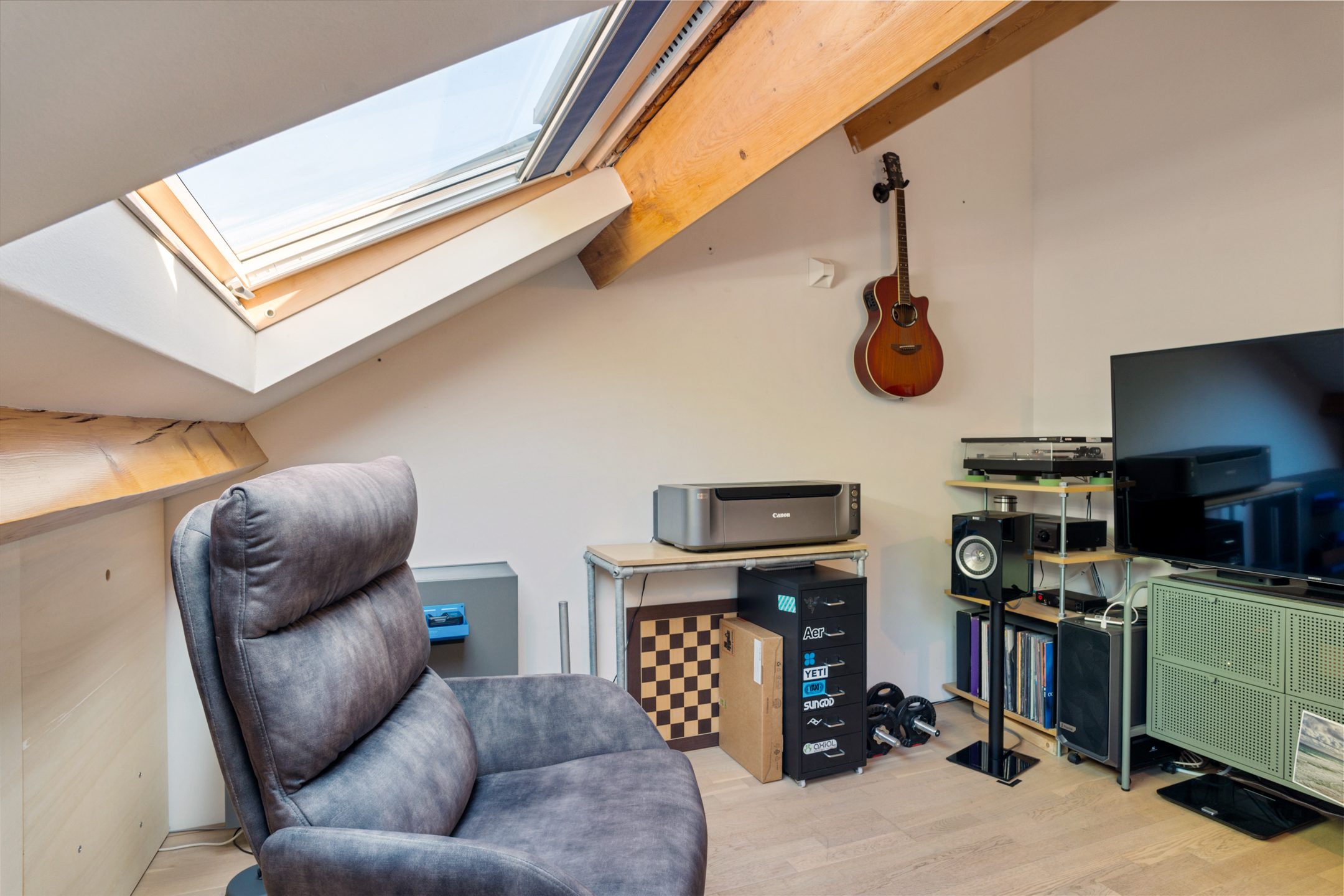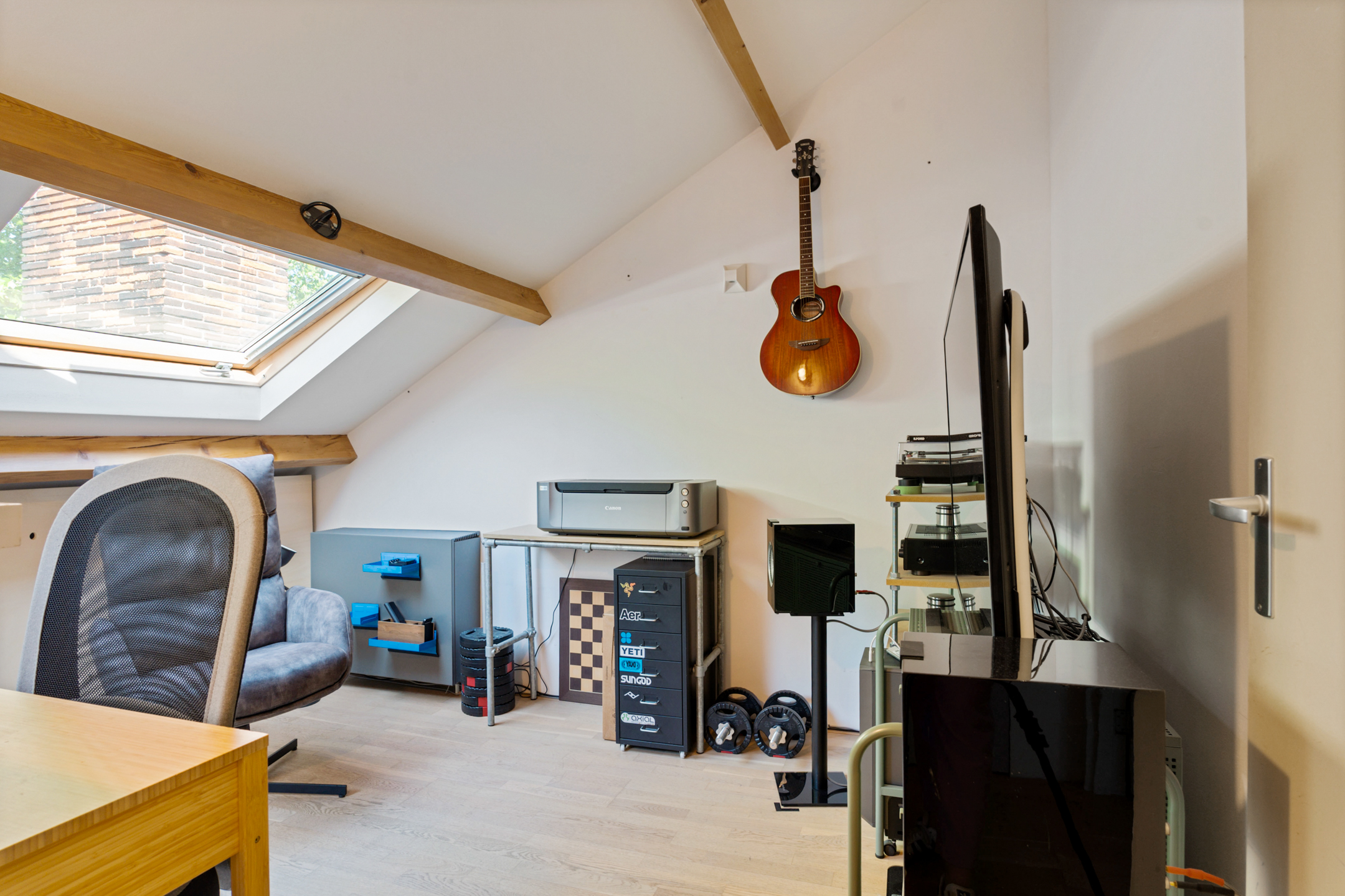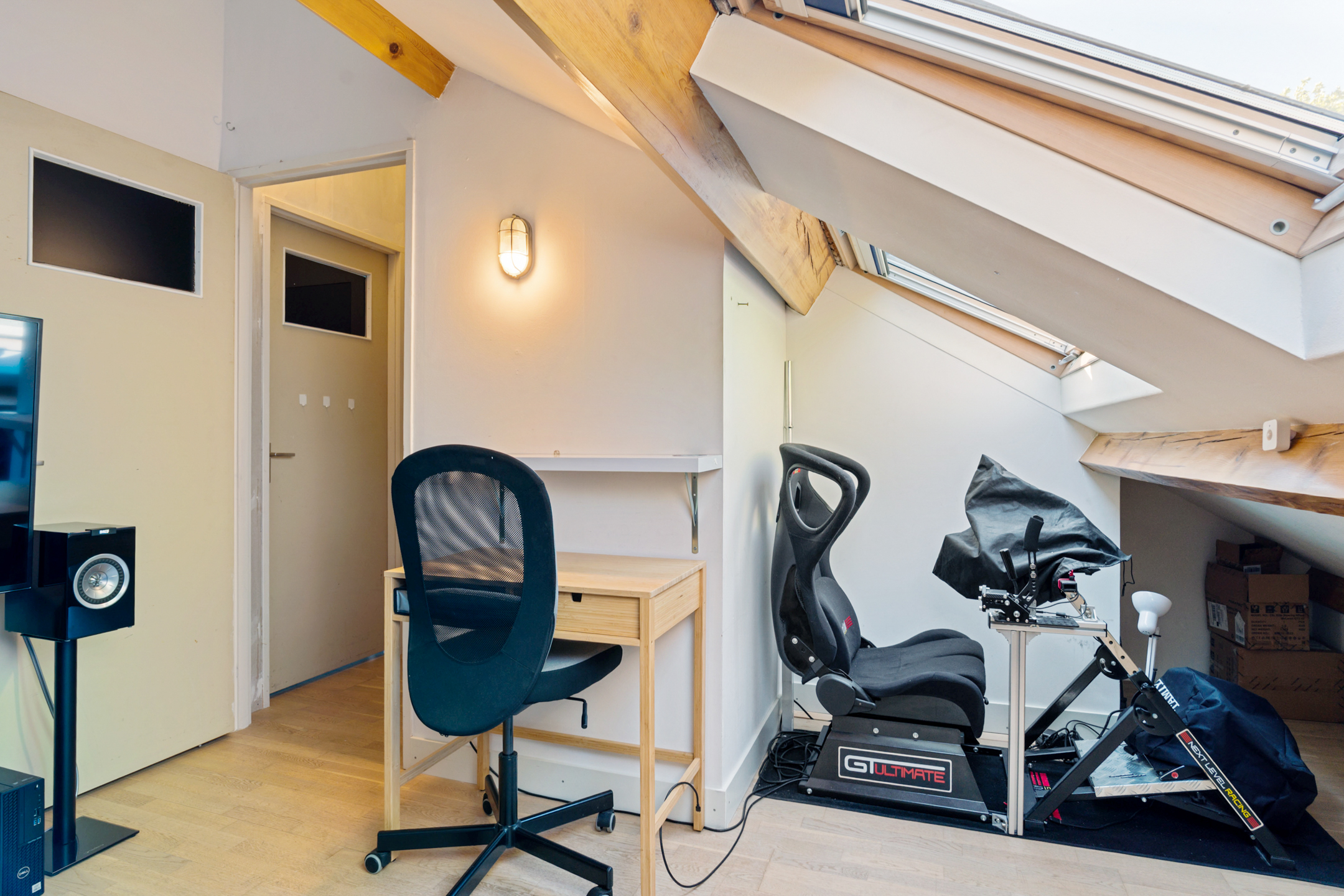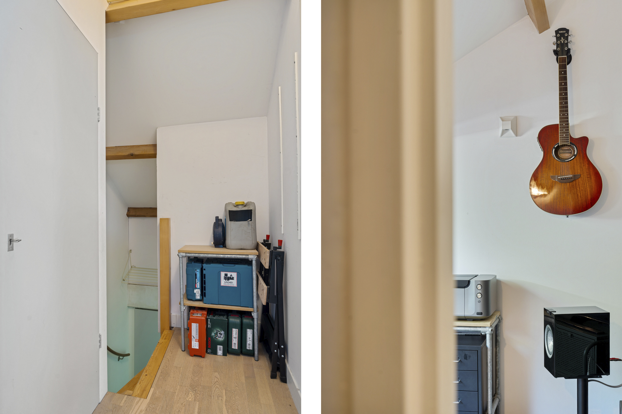 De zolderverdieping beslaat de volledige bovenste etage en is verrassend ruim. Je vindt hier een overloop met vaste kast, waarin de nieuwe cv-ketel (2024) is geplaatst. Aan de voorzijde is een slaapkamer met twee dakvensters. Aan de achterzijde ligt nog een slaapkamer, eveneens voorzien van twee dakramen en handige bergruimte achter de knieschotten.