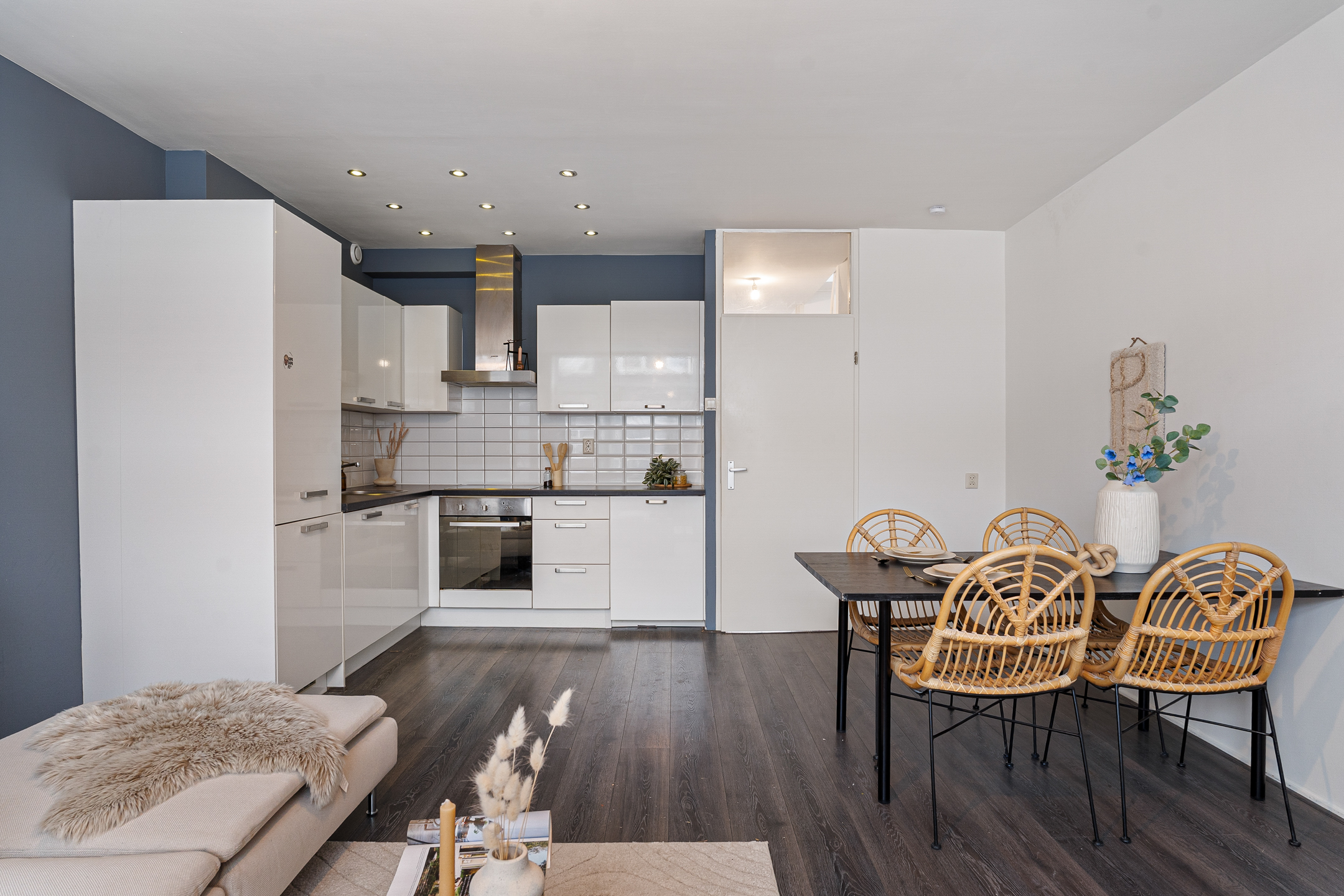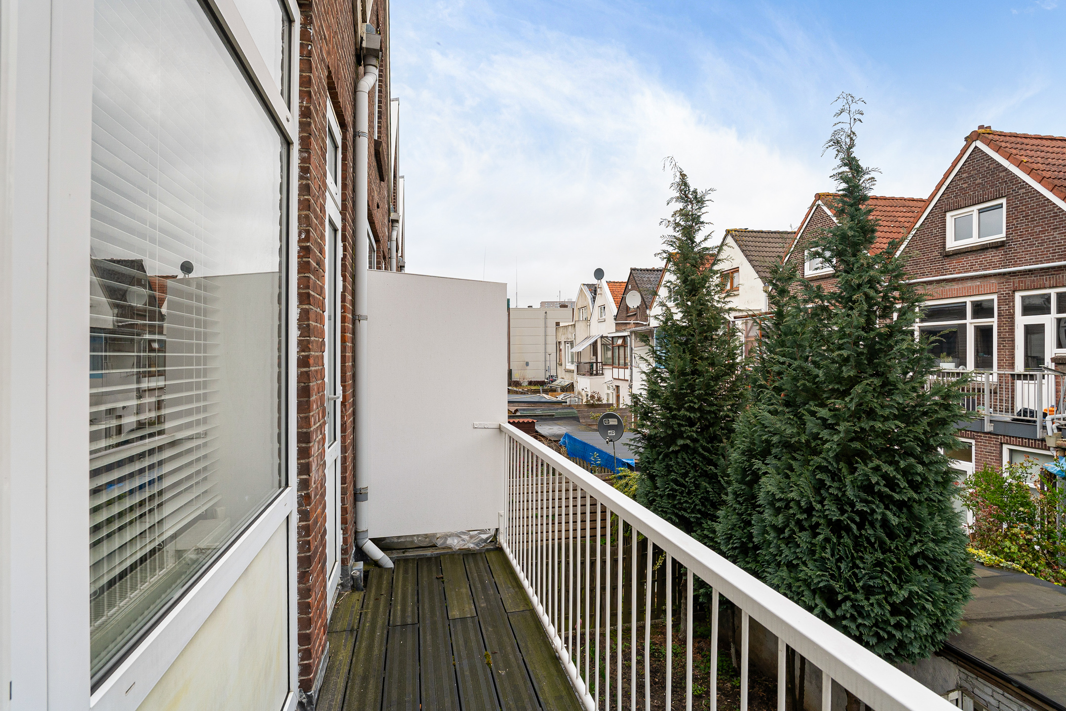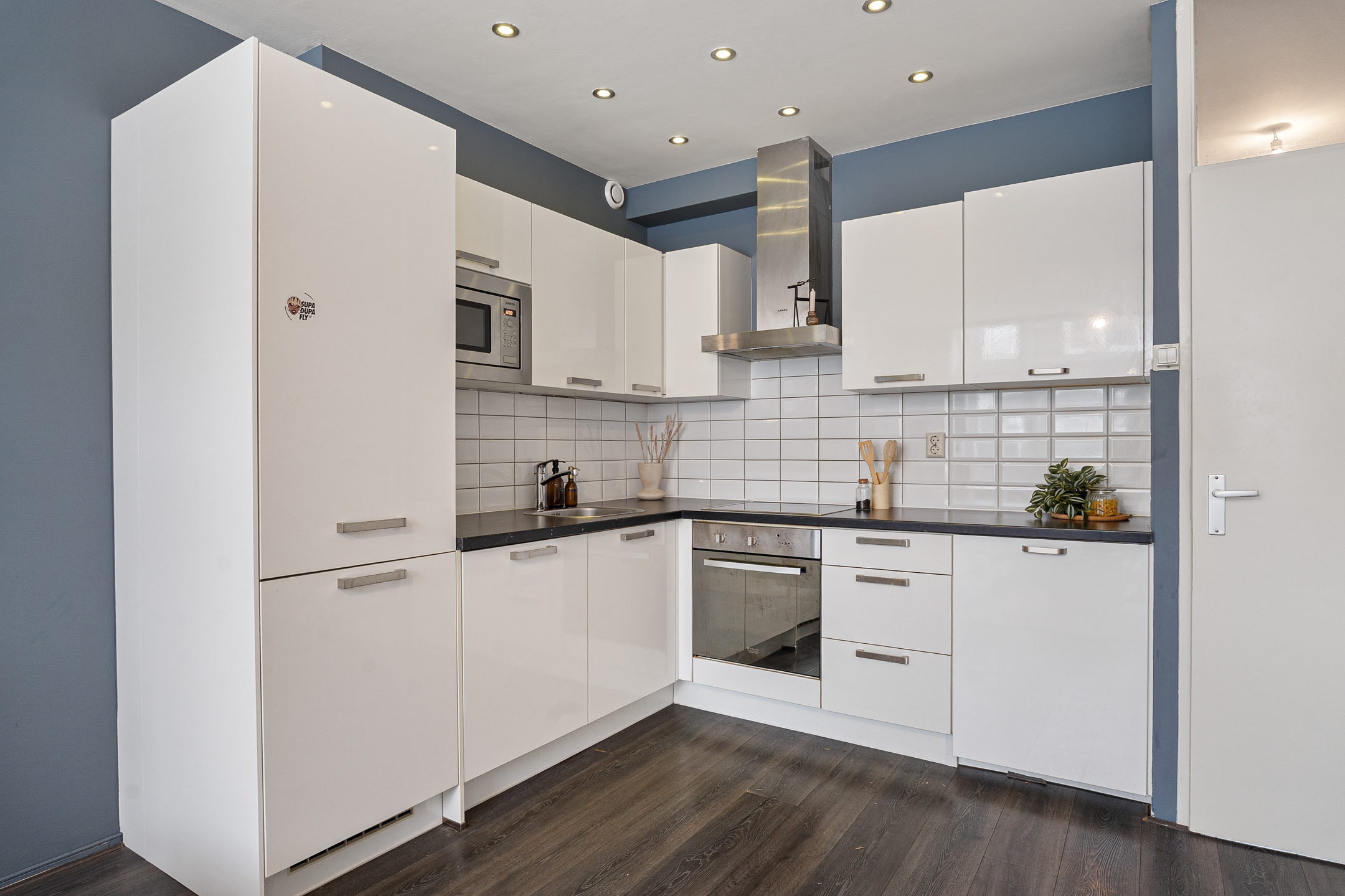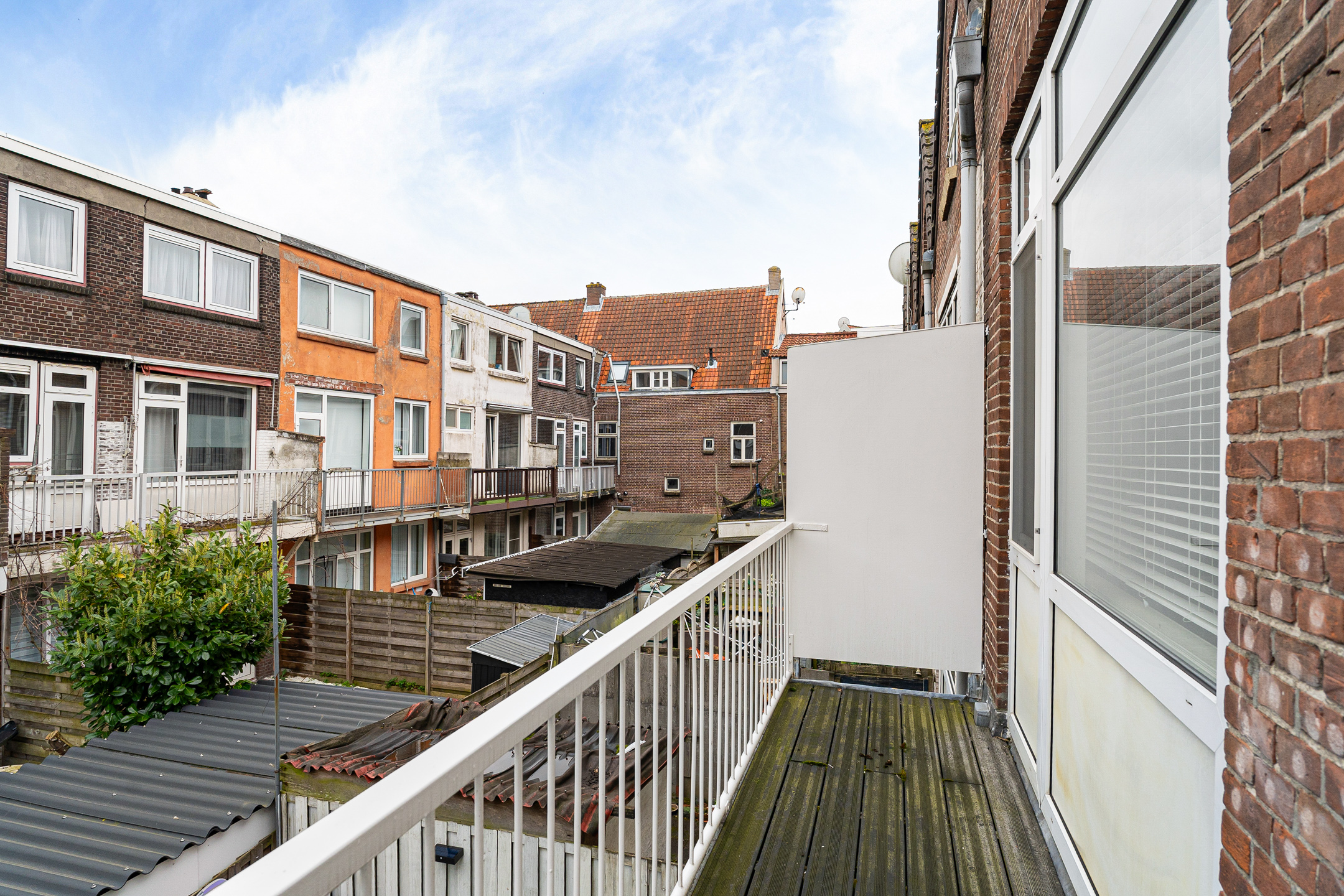 Grenzend aan de woonkamer vind je het balkon, een fijne plek waar je even naar buiten stapt voor wat frisse lucht of een kop koffie in de zon. Het balkon biedt voldoende ruimte voor een zitje en kijkt uit over de omliggende bebouwing, wat zorgt voor een levendig maar toch prettig uitzicht.