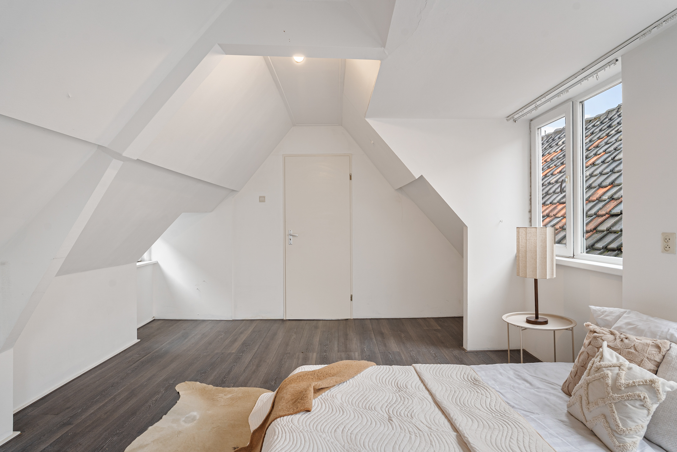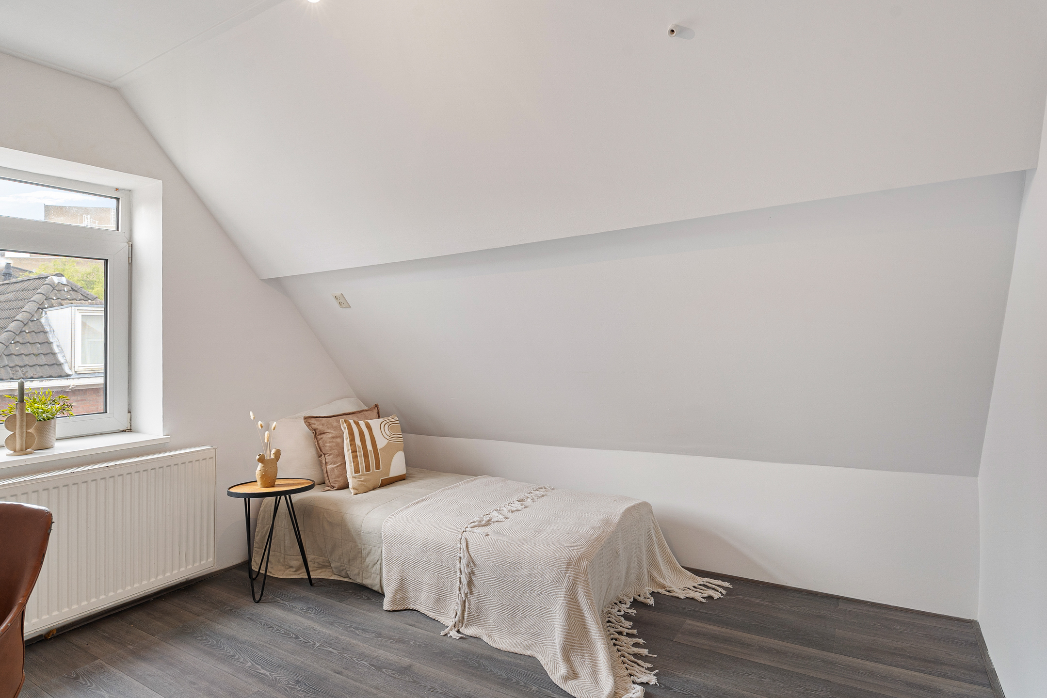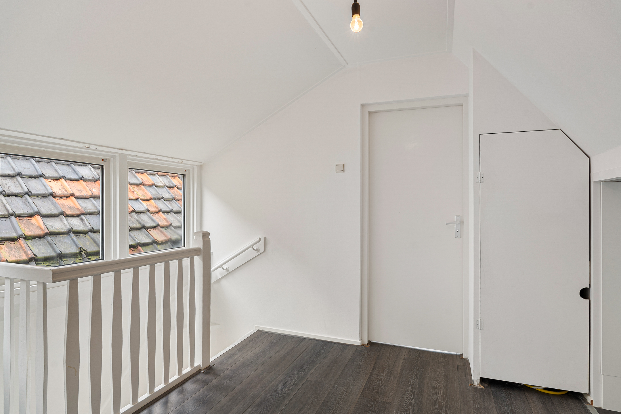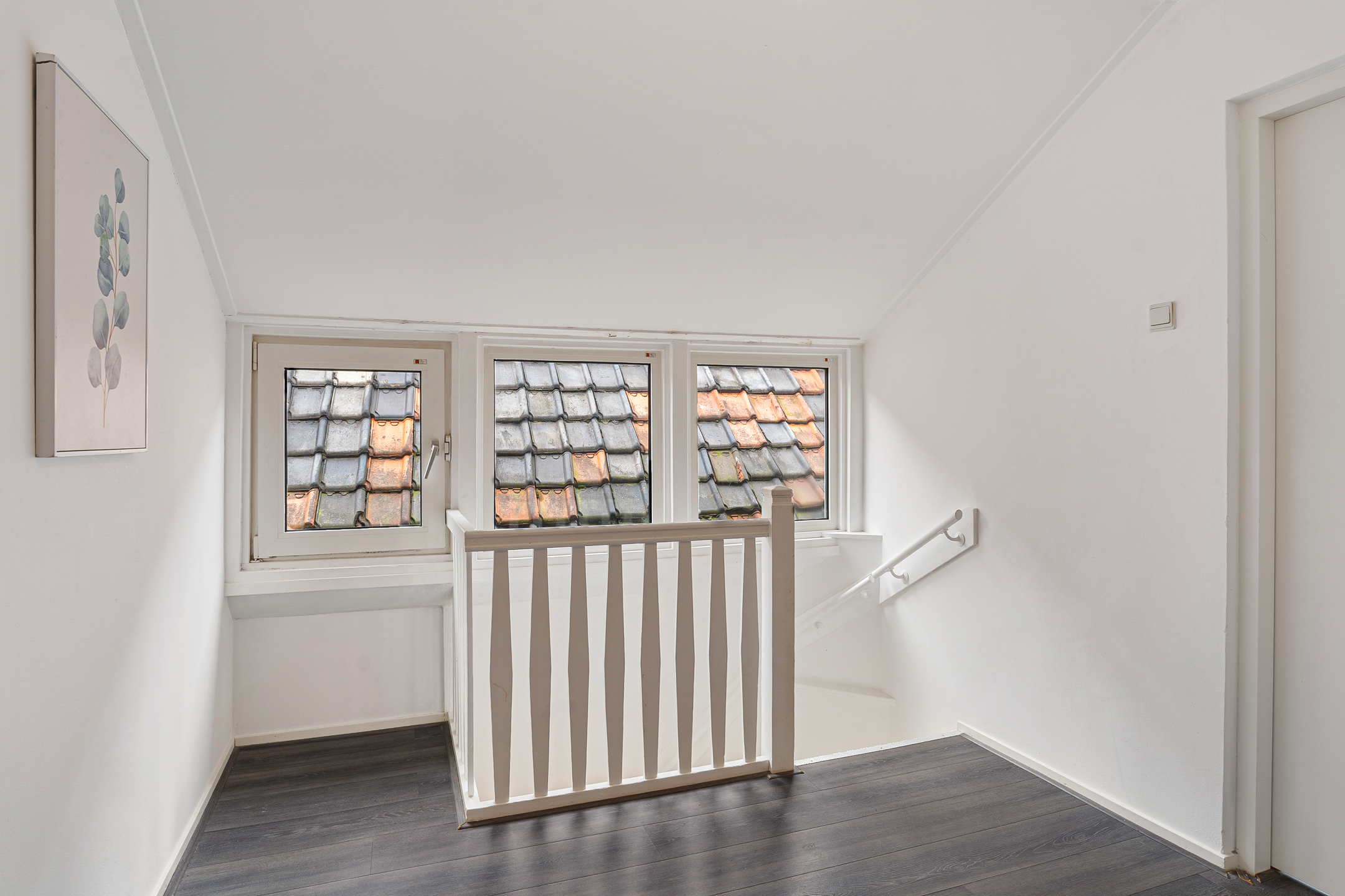 Via de vaste trap kom je op de tweede verdieping. Deze verdieping verrast direct door de speelse indeling en het karakteristieke schuine dak. Deze verdieping heeft twee volwaardige slaapkamers; een aan de voorzijde en een aan de achterzijde.