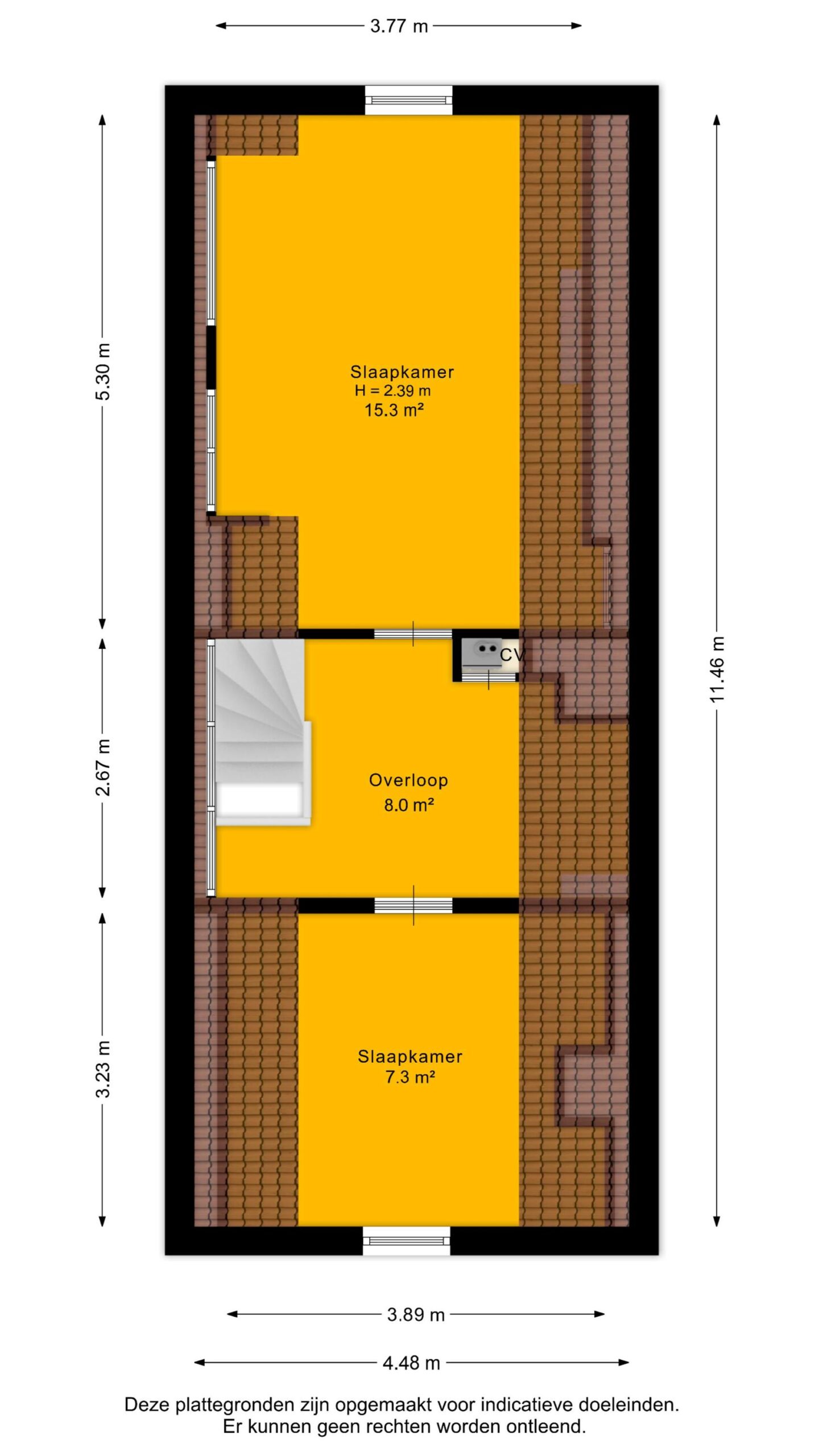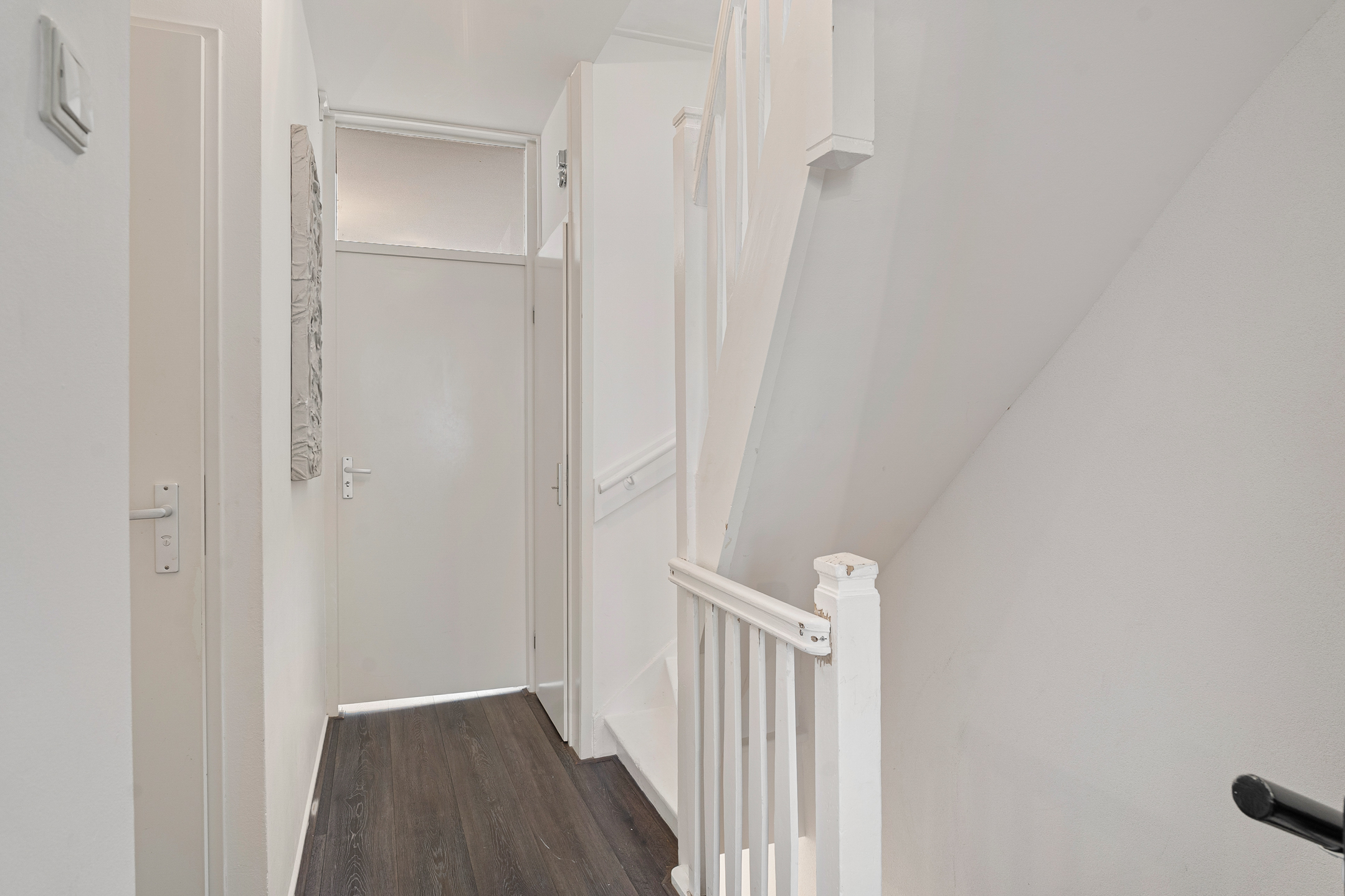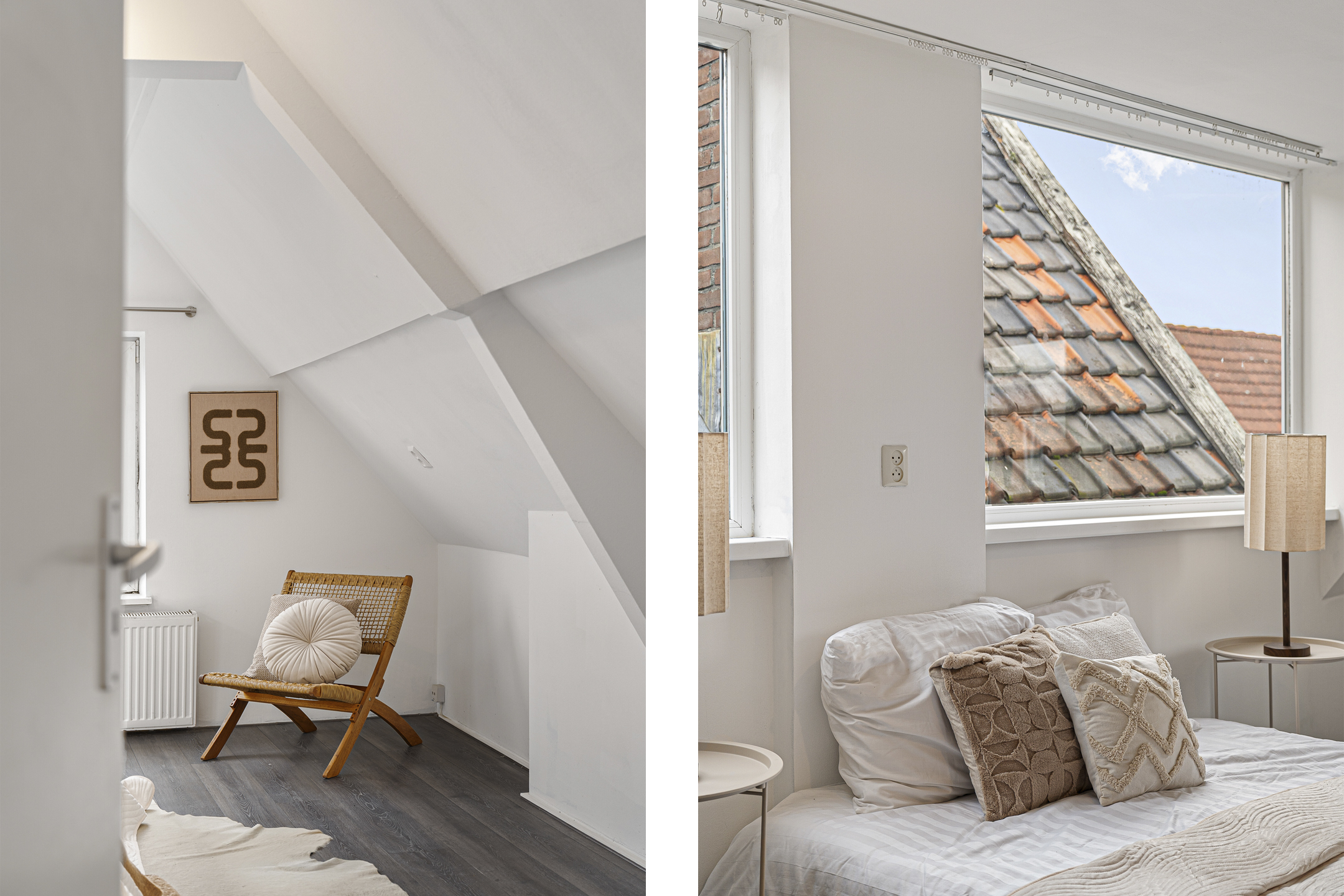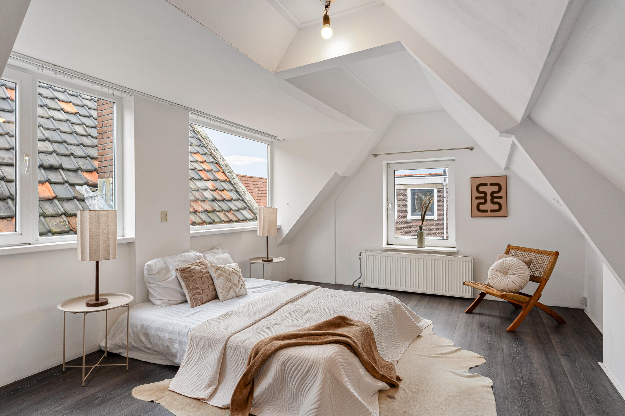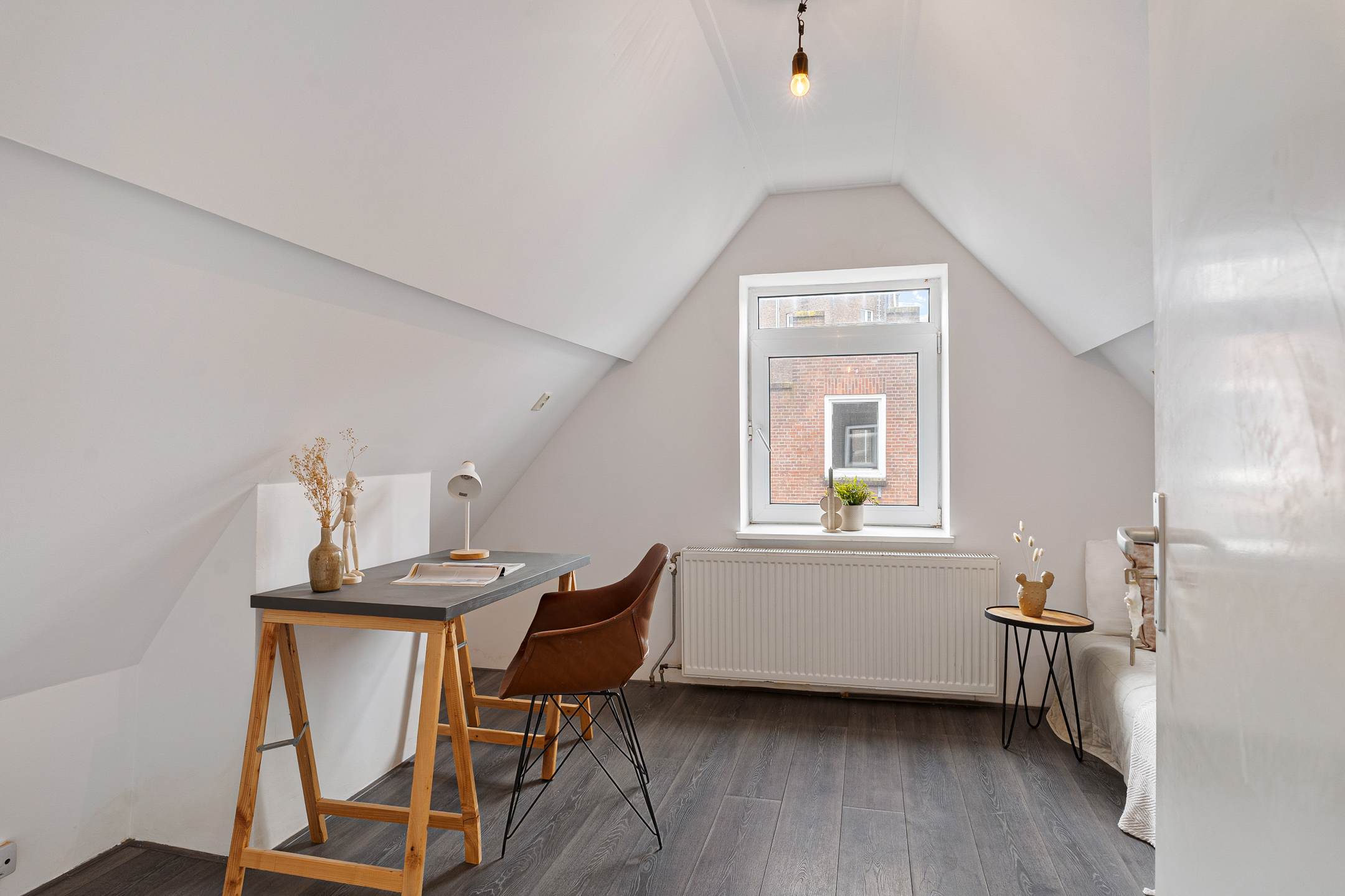 Via de vaste trap kom je op de tweede verdieping. Deze verdieping verrast direct door de speelse indeling en het karakteristieke schuine dak. Deze verdieping heeft twee volwaardige slaapkamers; een aan de voorzijde en een aan de achterzijde.