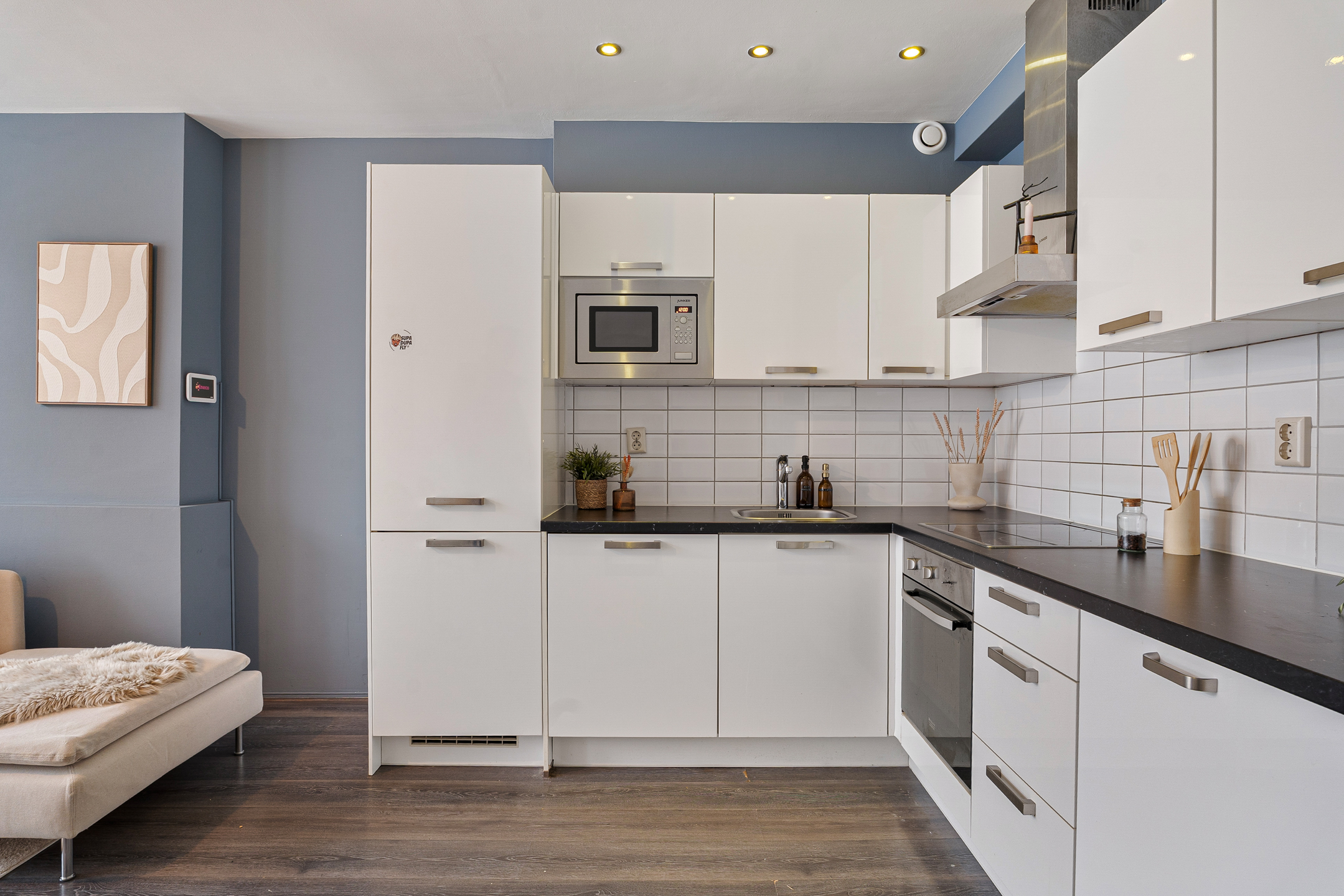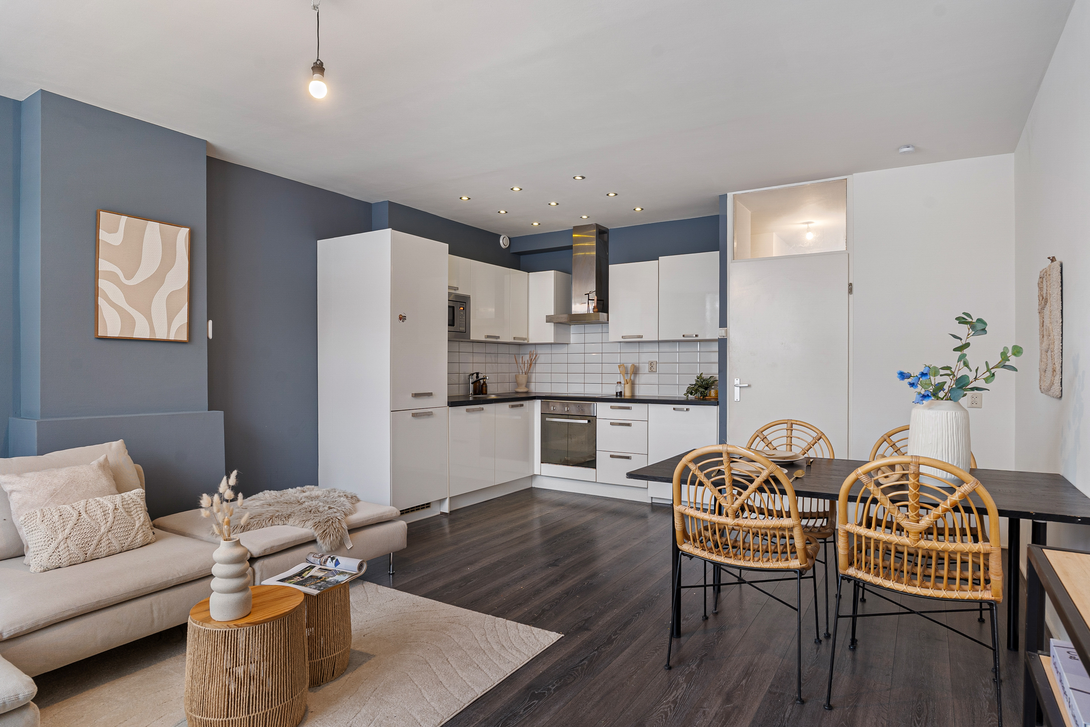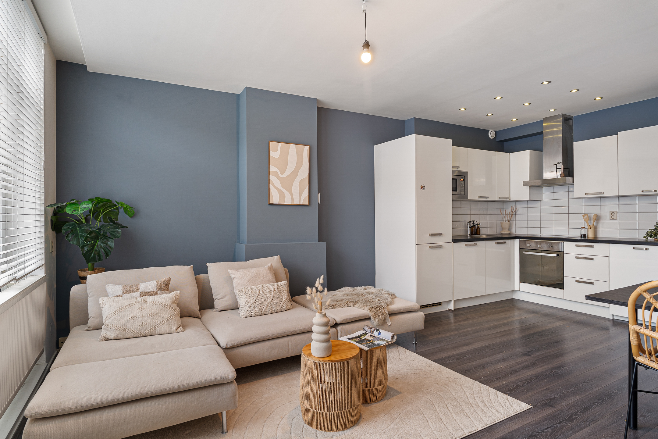 Je komt binnen via de verzorgde entree en bereikt het appartement. De hal voelt direct netjes en verzorgd aan en geeft toegang tot de verschillende vertrekken. De afwerking is neutraal, waardoor je hier eenvoudig je eigen stijl aan kunt toevoegen. Vanuit de hal loop je door naar de leefruimte, waar het appartement zich echt laat zien. De woonkamer is een echte eyecatcher: ruim, licht en modern afgewerkt. Dankzij de grote raampartijen valt er veel daglicht naar binnen, wat zorgt voor een prettige en open sfeer. De donkere vloer in combinatie met de lichte wanden geeft het geheel een eigentijdse uitstraling. De ruimte is praktisch ingedeeld en biedt voldoende plek voor zowel een comfortabele zithoek als een gezellige eethoek. De open keuken sluit hier naadloos op aan en is strak uitgevoerd met moderne apparatuur en veel kastruimte. Hierdoor wordt koken niet alleen praktisch, maar ook gezellig, omdat je altijd in contact blijft met je gasten.
