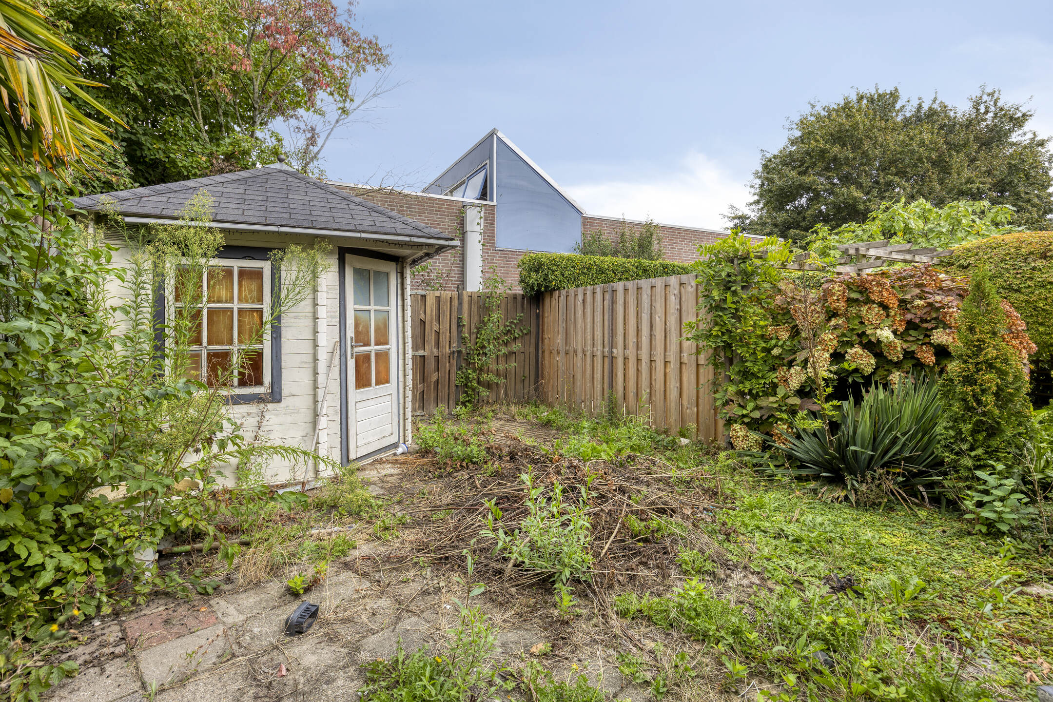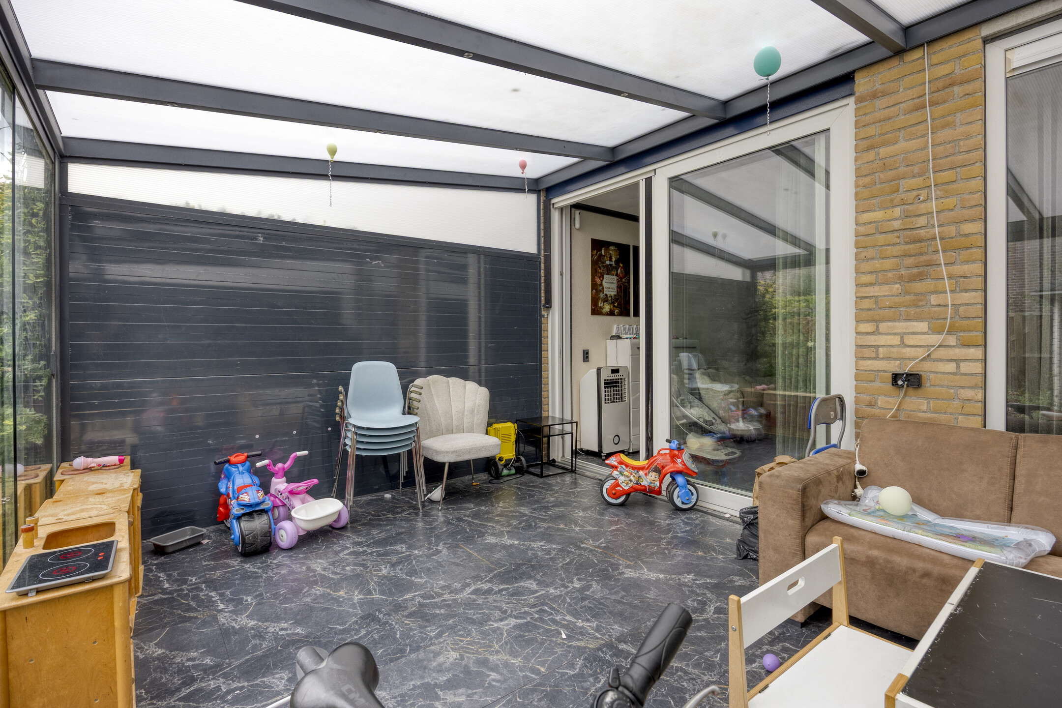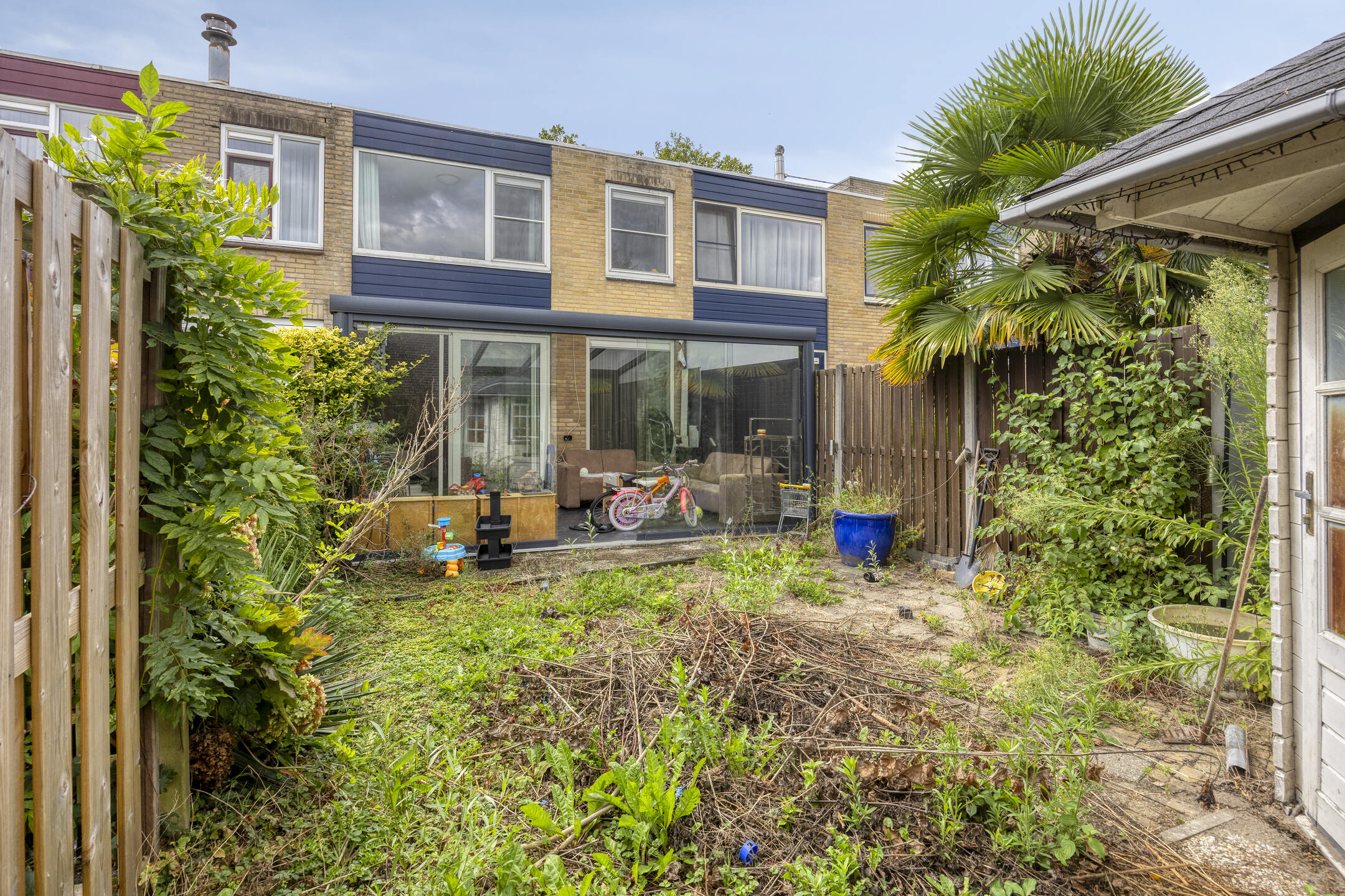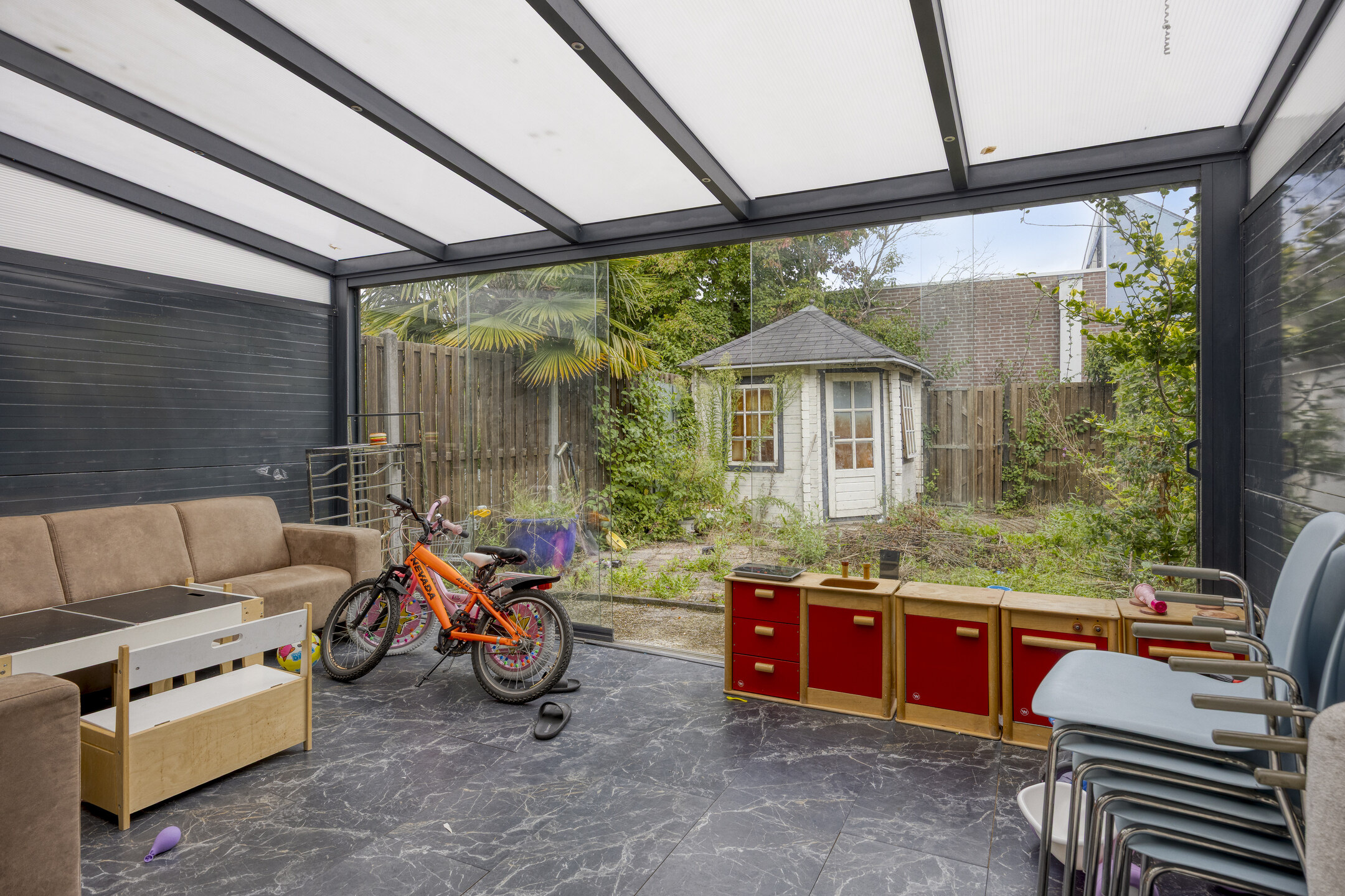De achtertuin beschikt over een achterom en een houten fietsenberging. De aangebouwde serre verlengt de woonkamer en maakt het mogelijk om het hele jaar door van de tuin te genieten.