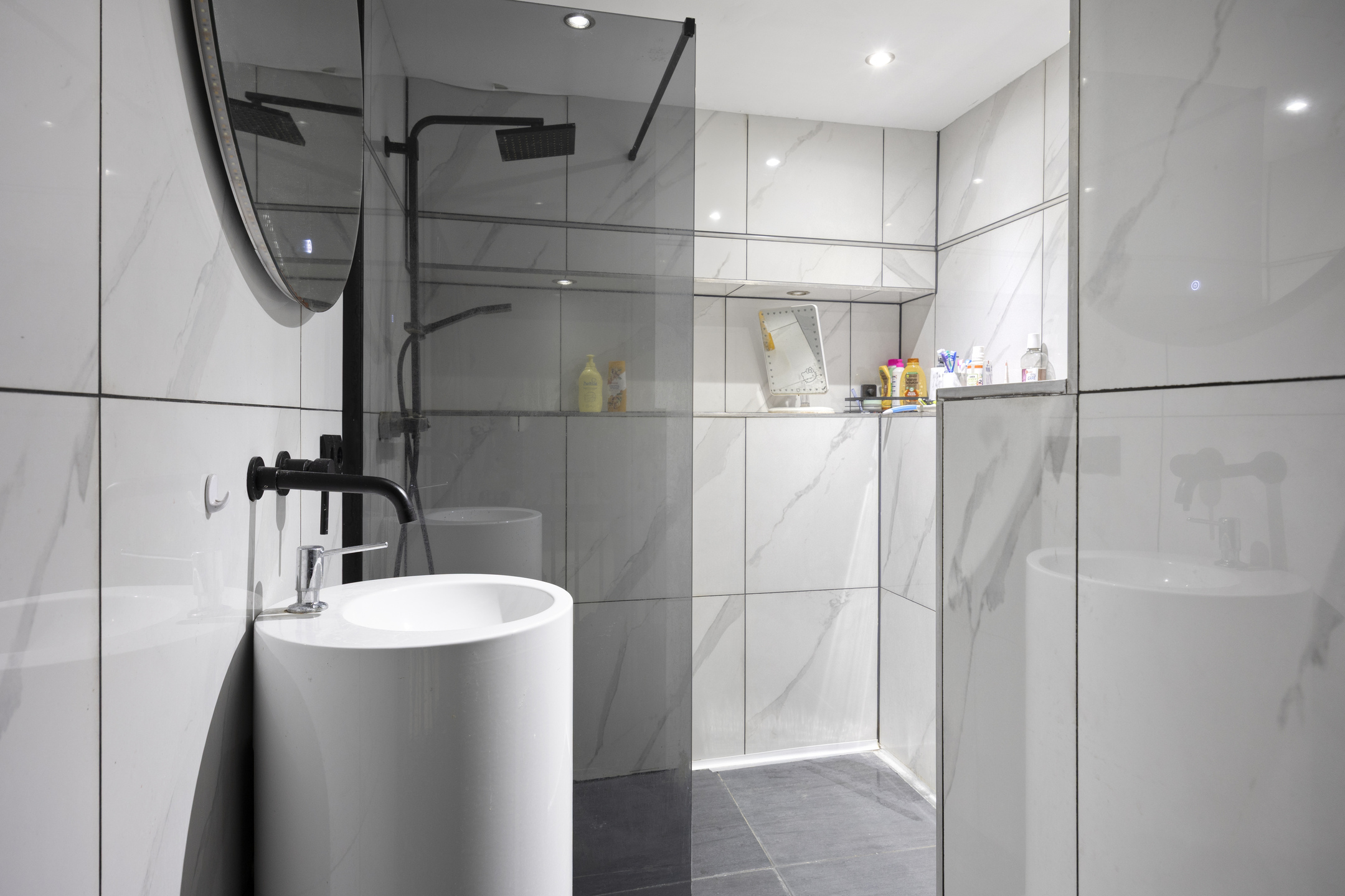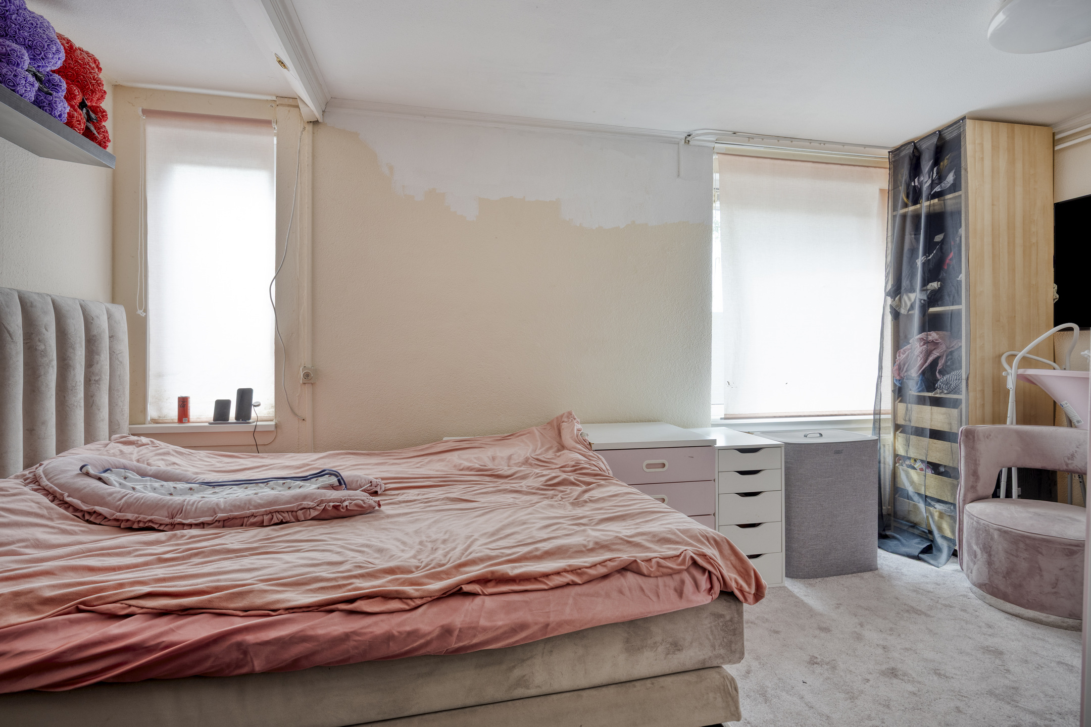Op de eerste verdieping bevindt zich de overloop met bergkast en cv-kast (Remeha). De hoofdslaapkamer ligt aan de voorzijde. Aan de achterzijde bevinden zich nog twee slaapkamers, bereikbaar via een tussenhal. De badkamer is uitgerust met een wastafel, douche en hangtoilet.