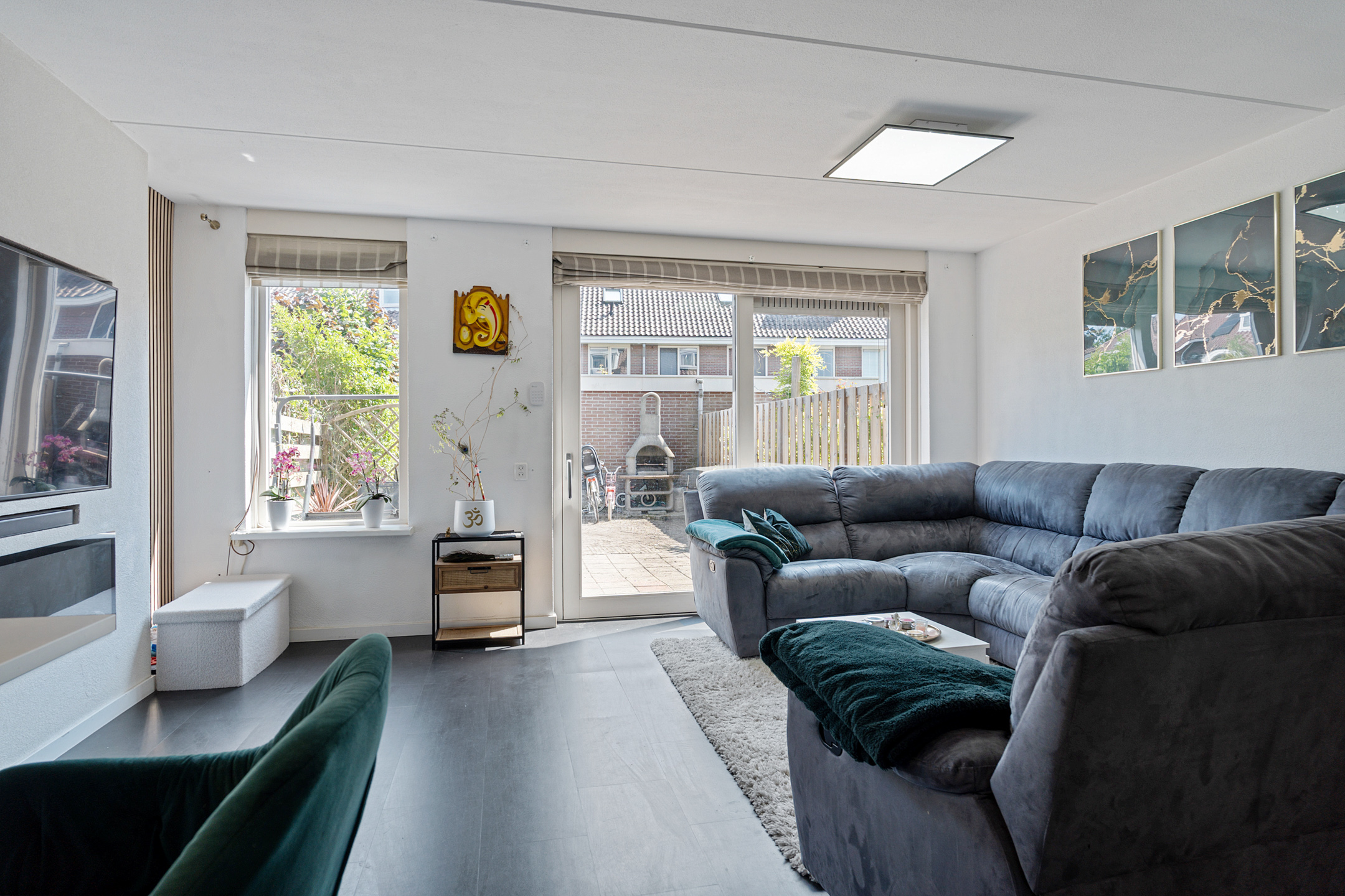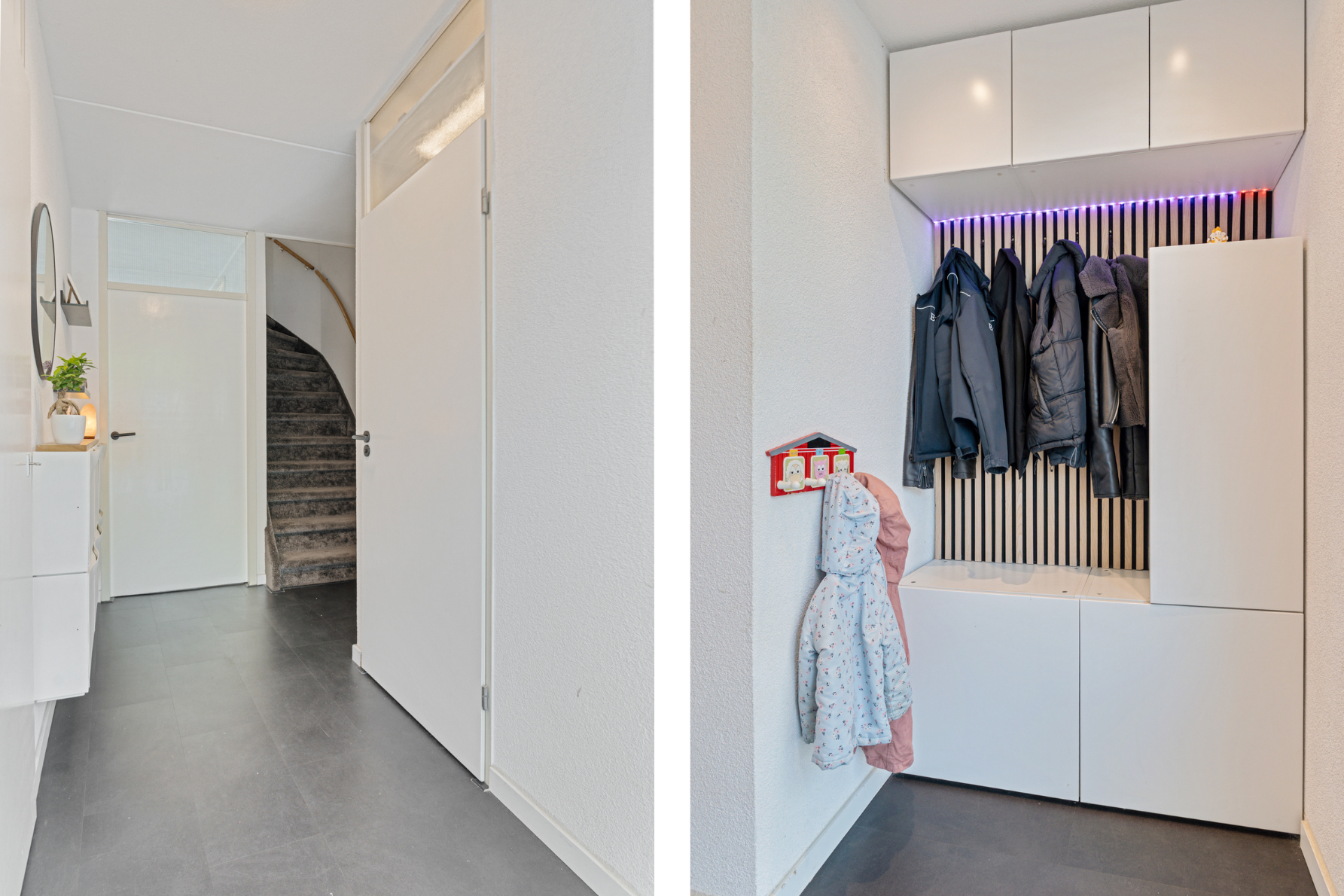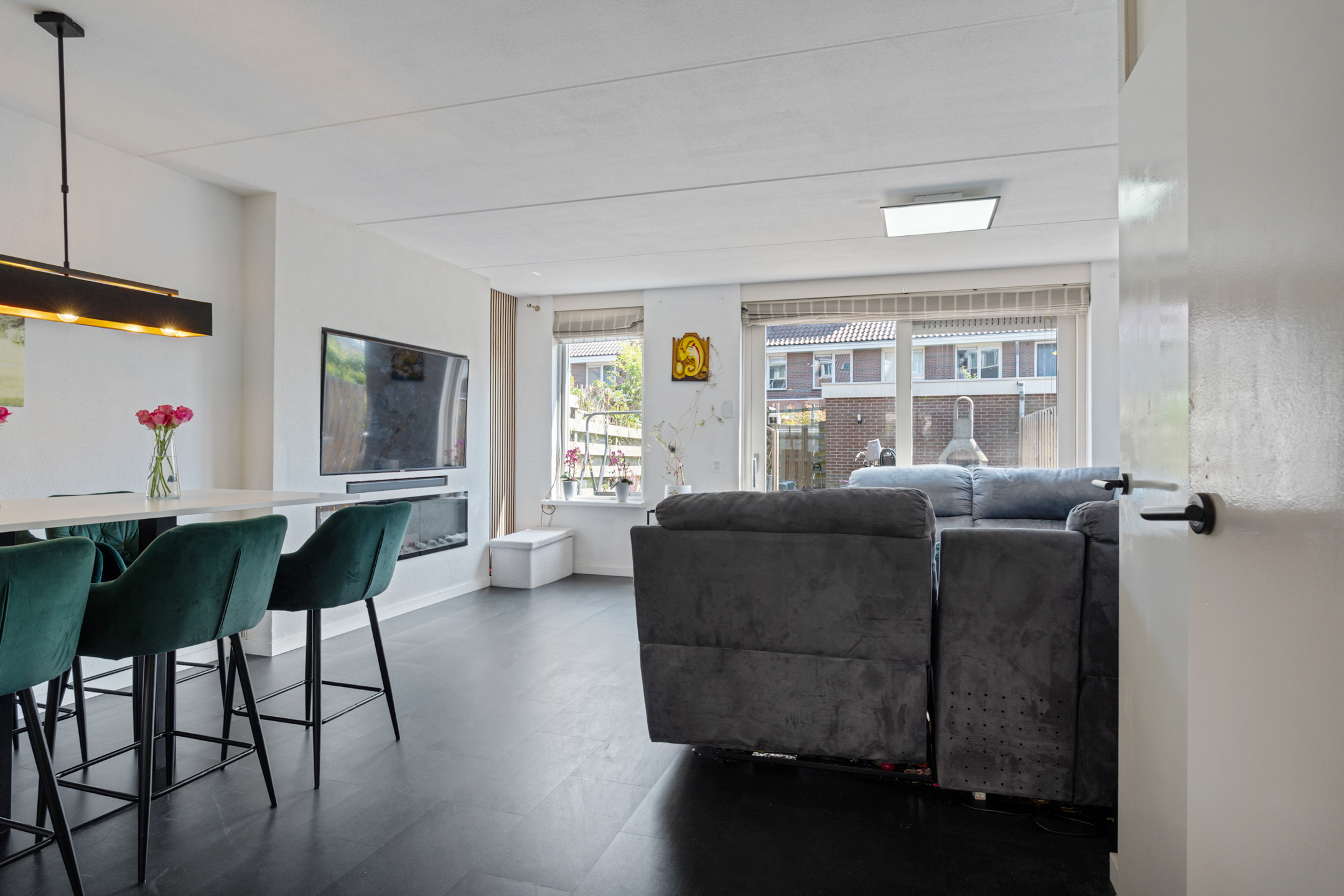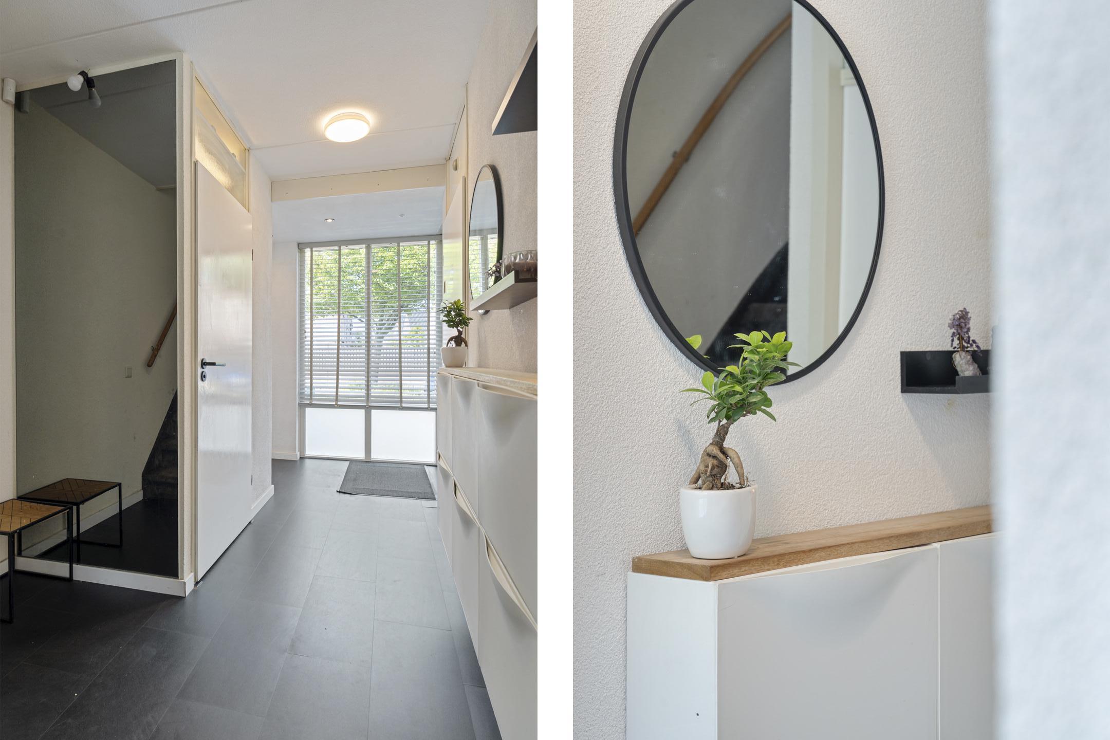 Je komt binnen in een opvallend ruime hal met erker en veel natuurlijk lichtinval. Hier vind je de meterkast, een garderoberuimte en het modern betegelde toilet met nisje en sfeerverlichting. Via de hal bereik je de sfeervol ingerichte en lichte woonkamer met een strakke cinewall en schuifpui naar de zonnige achtertuin.
