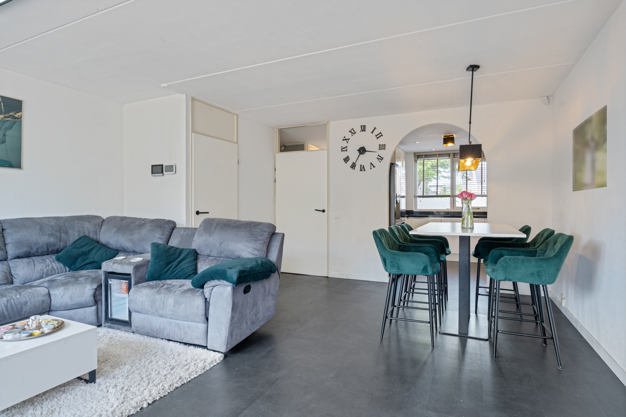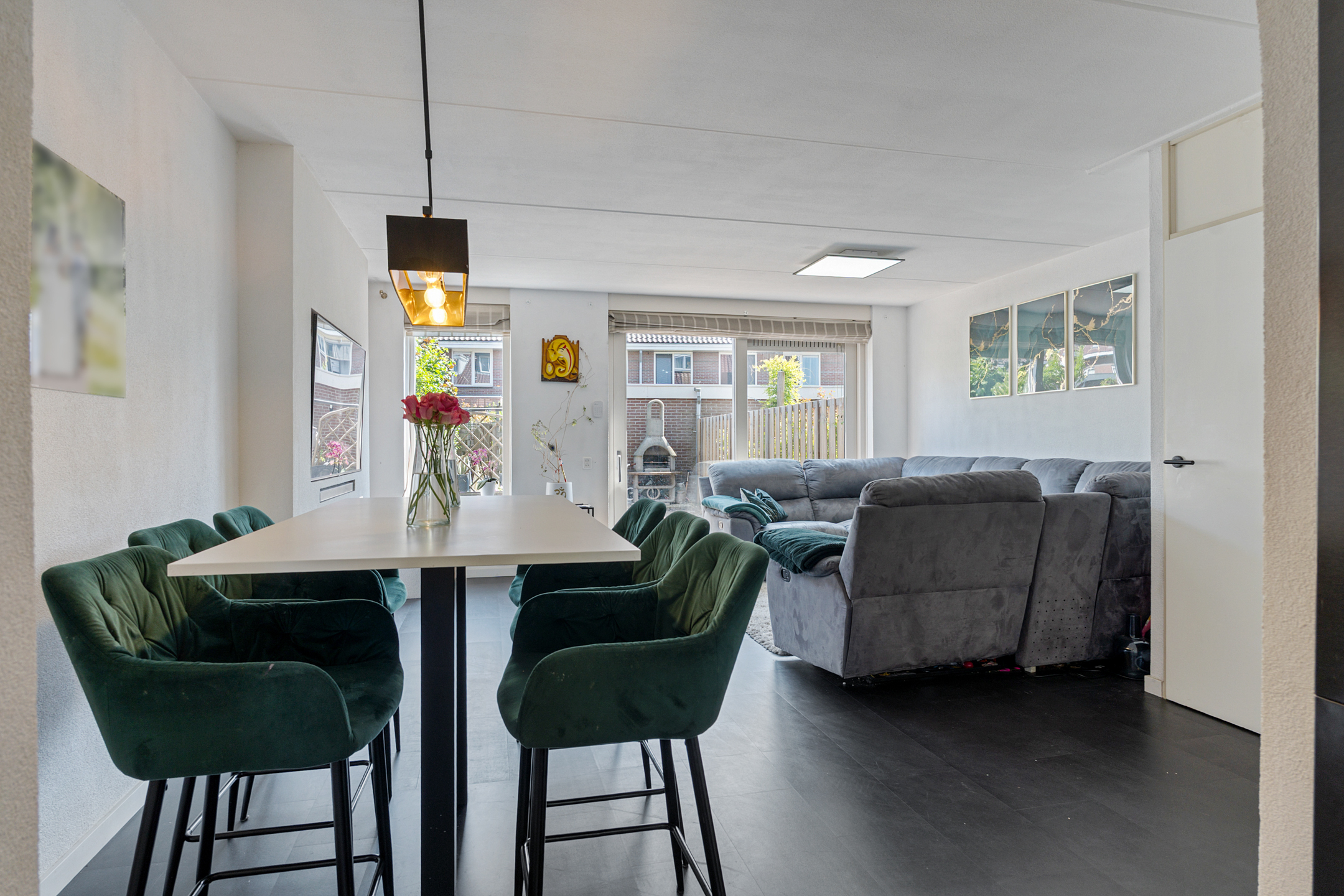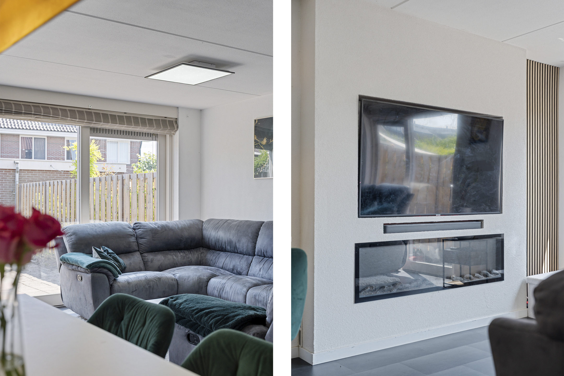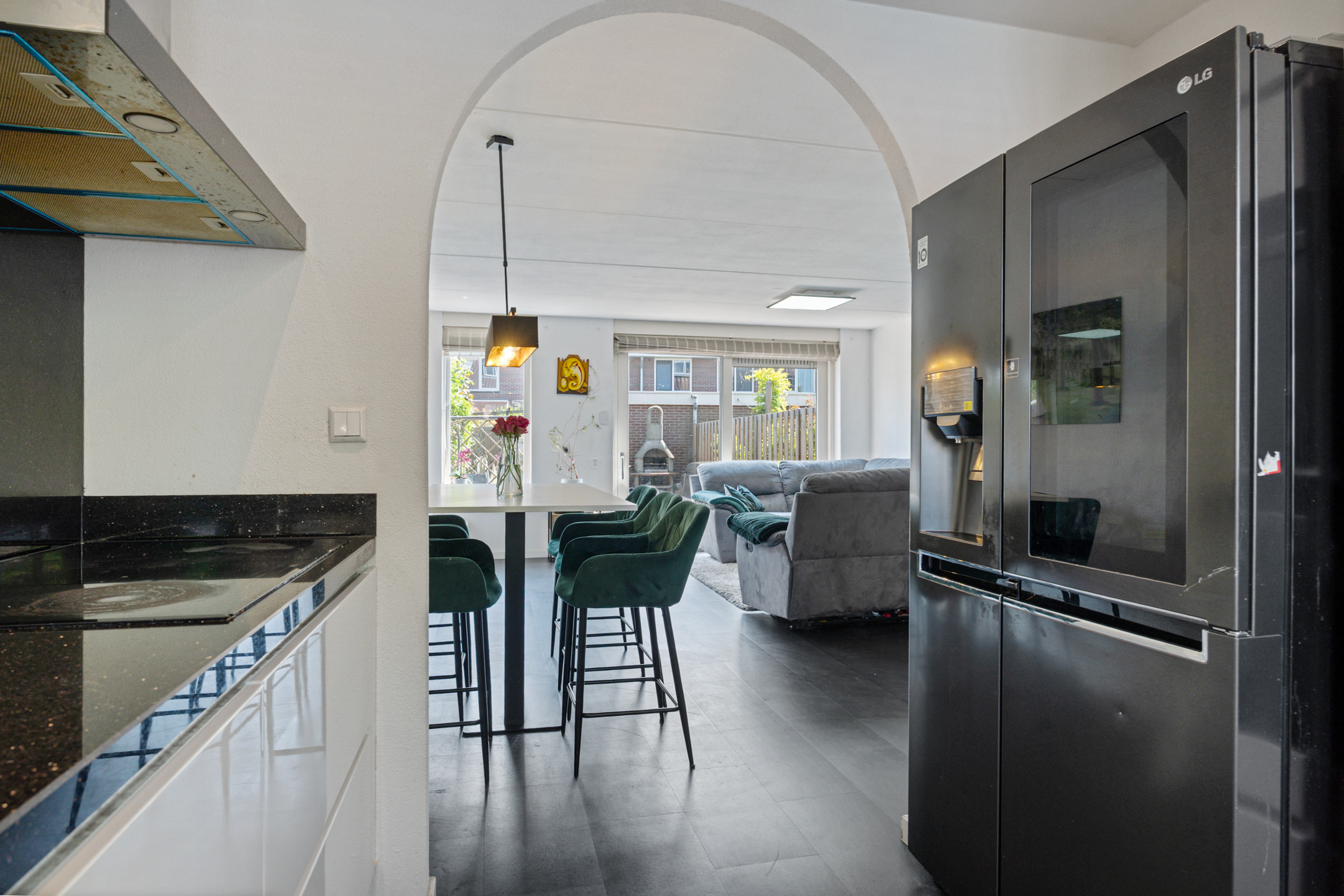 Je komt binnen in een opvallend ruime hal met erker en veel natuurlijk lichtinval. Hier vind je de meterkast, een garderoberuimte en het modern betegelde toilet met nisje en sfeerverlichting. Via de hal bereik je de sfeervol ingerichte en lichte woonkamer met een strakke cinewall en schuifpui naar de zonnige achtertuin.