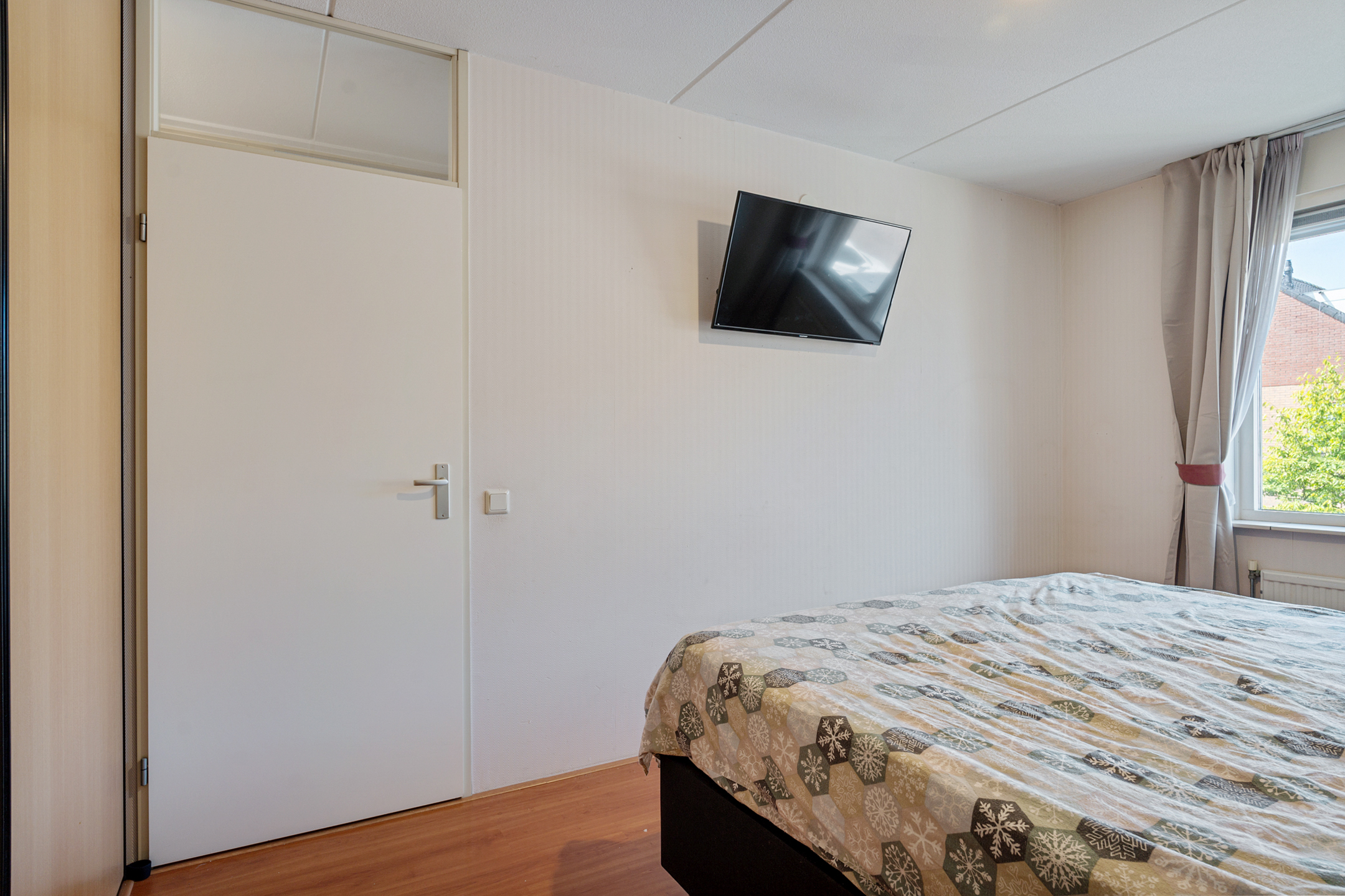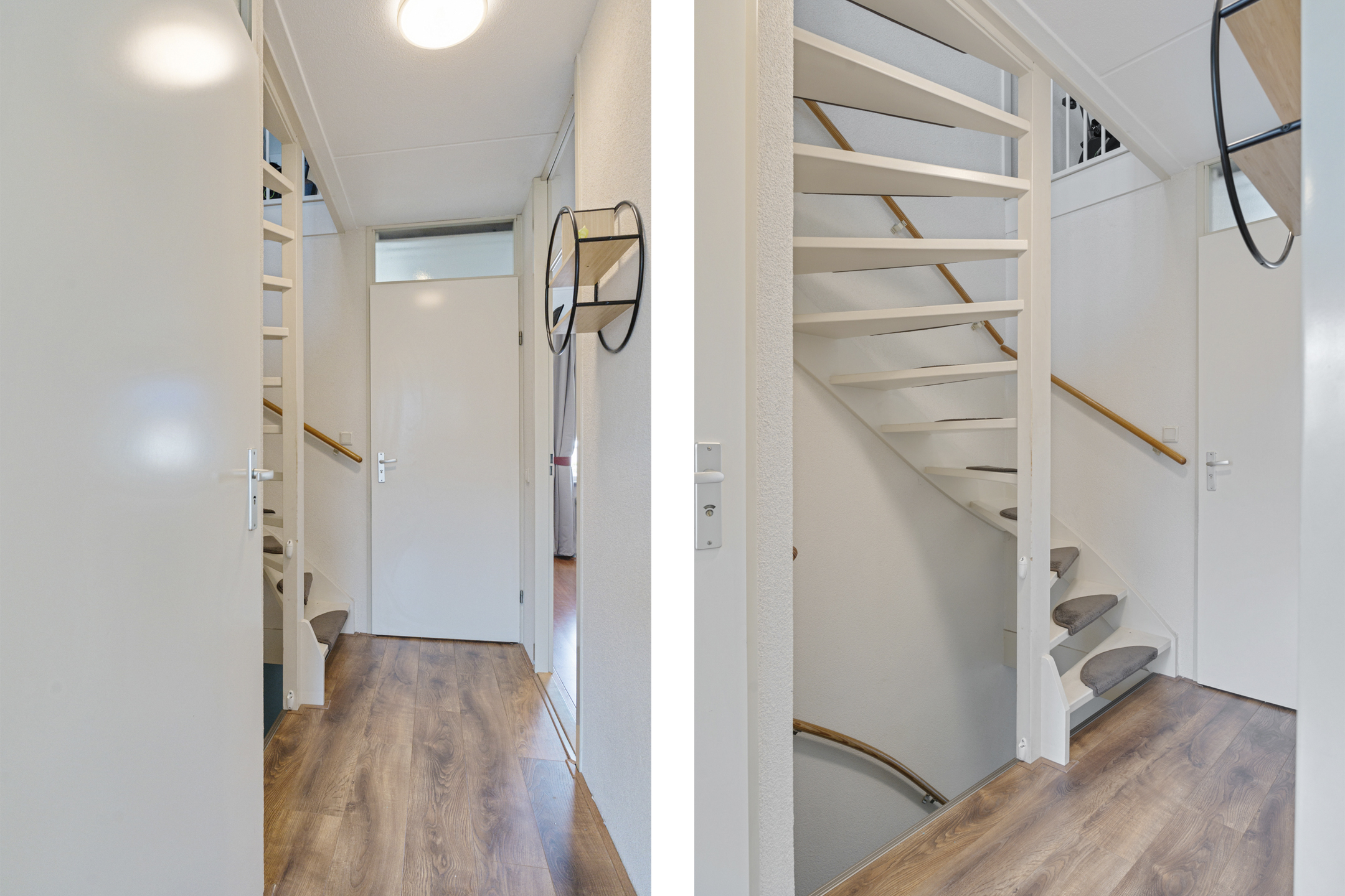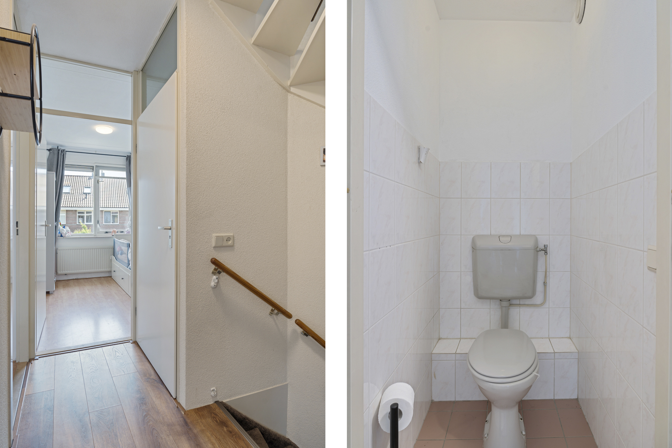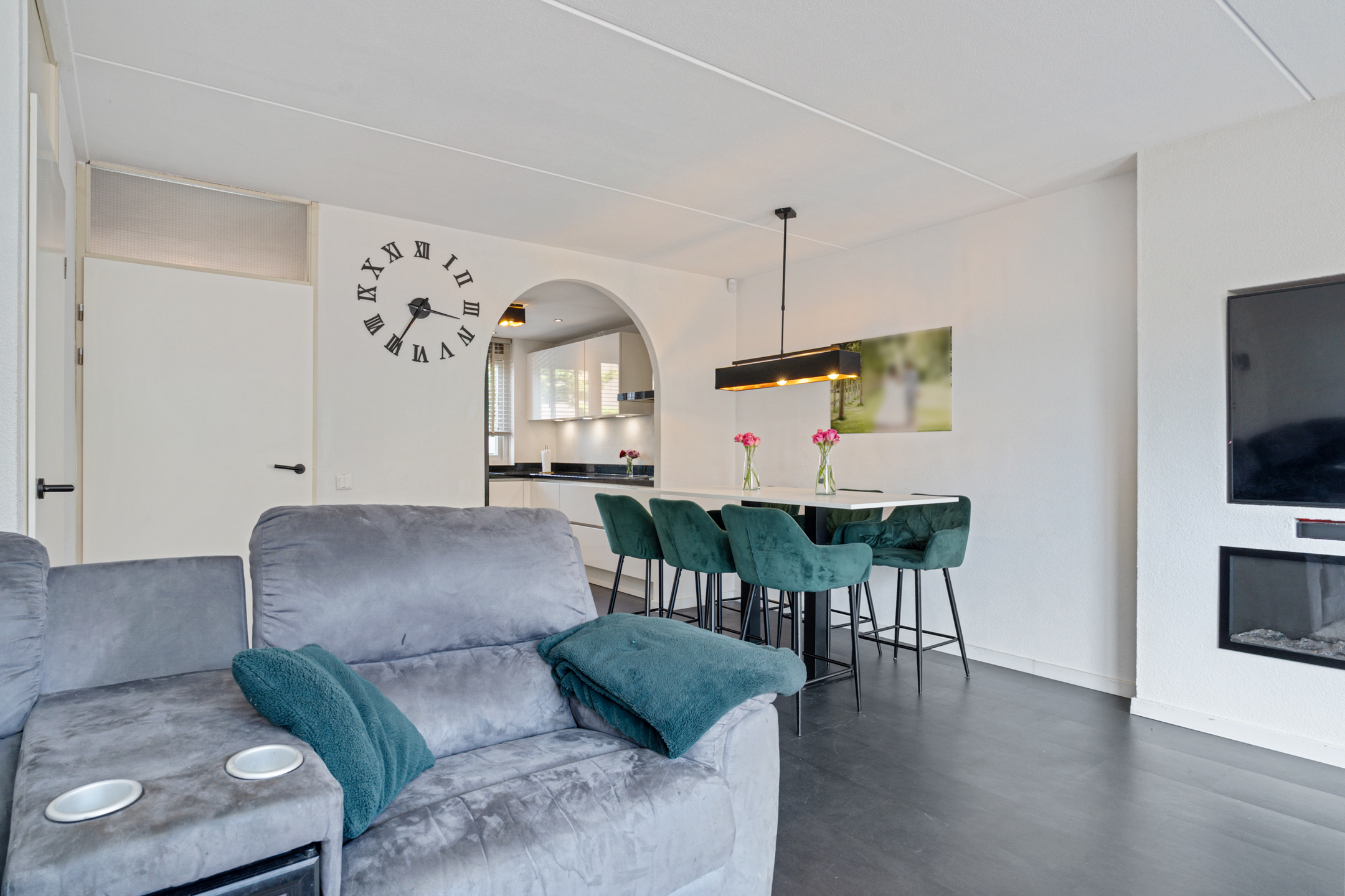 Je komt binnen in een opvallend ruime hal met erker en veel natuurlijk lichtinval. Hier vind je de meterkast, een garderoberuimte en het modern betegelde toilet met nisje en sfeerverlichting. Via de hal bereik je de sfeervol ingerichte en lichte woonkamer met een strakke cinewall en schuifpui naar de zonnige achtertuin.