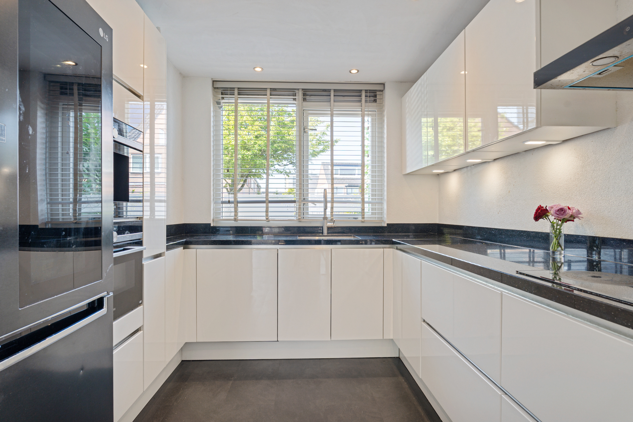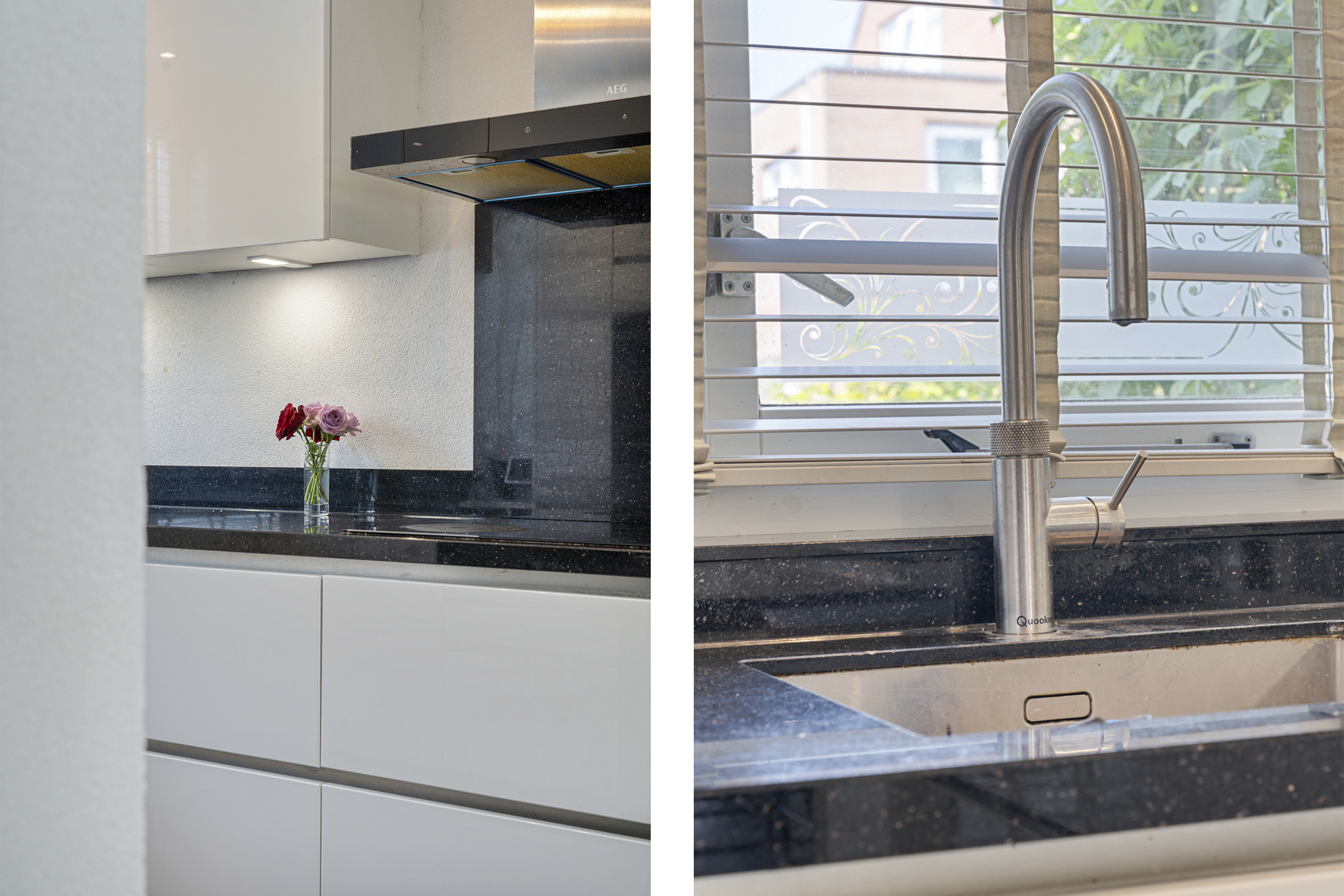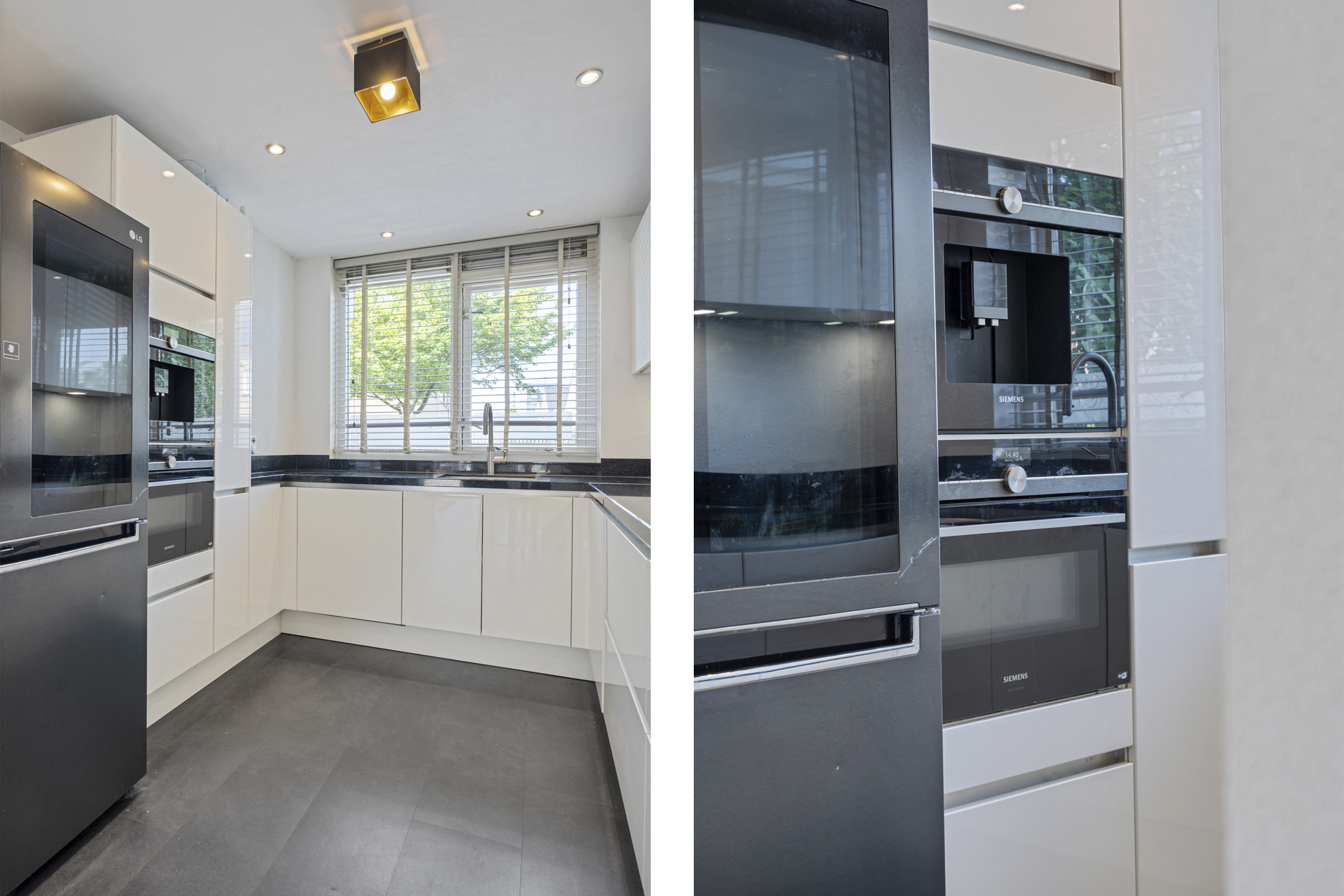 De open keuken in U-opstelling sluit via een halfronde toog mooi aan op de woonkamer. De keuken is voorzien van een composiet werkblad en hoogwaardige inbouwapparatuur zoals een koffiemachine, inductiekookplaat, afzuigkap, combi-oven, magnetron, vaatwasser en koel-/vriescombinatie. Er is veel werk- en bergruimte, waardoor koken hier echt een plezier is.