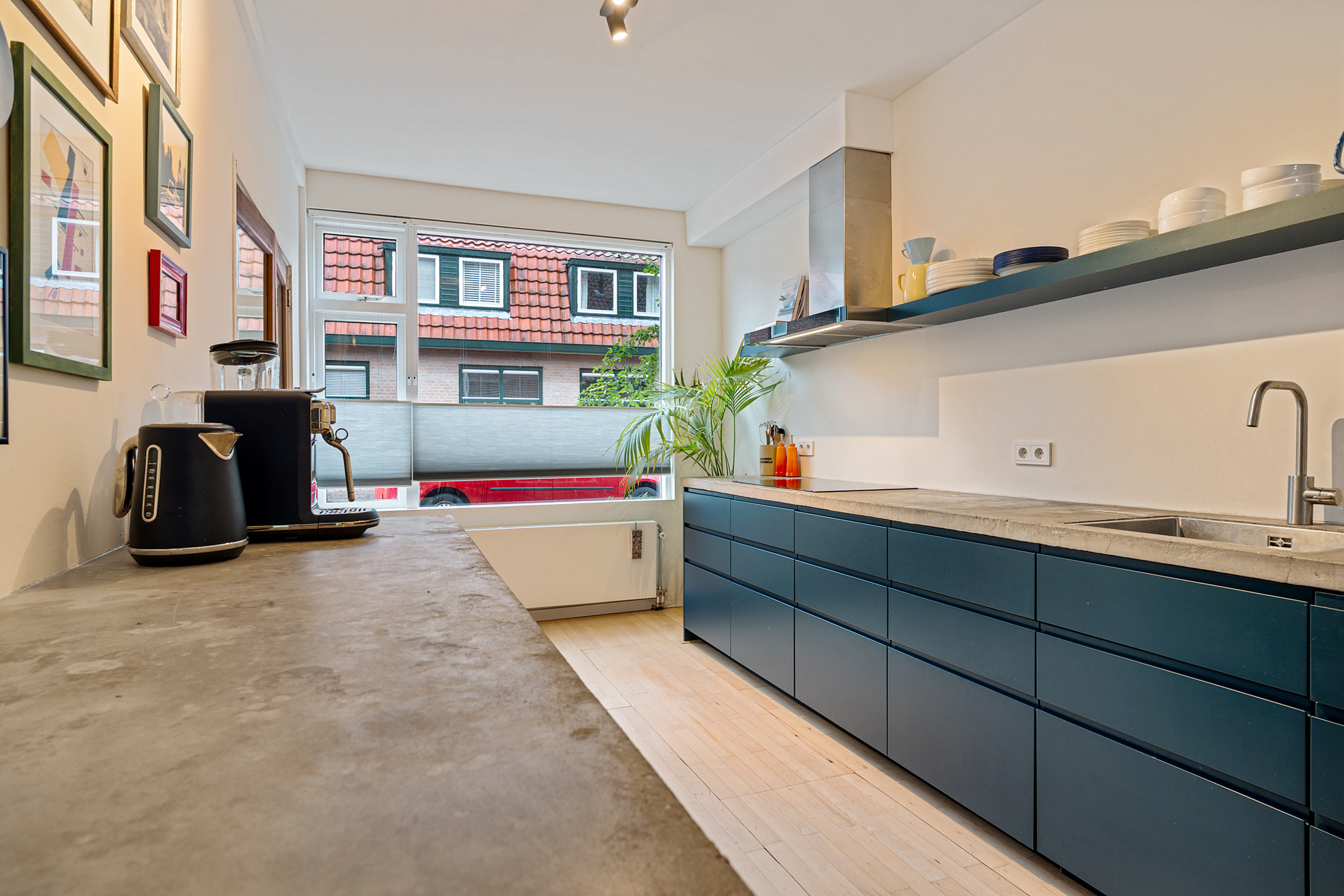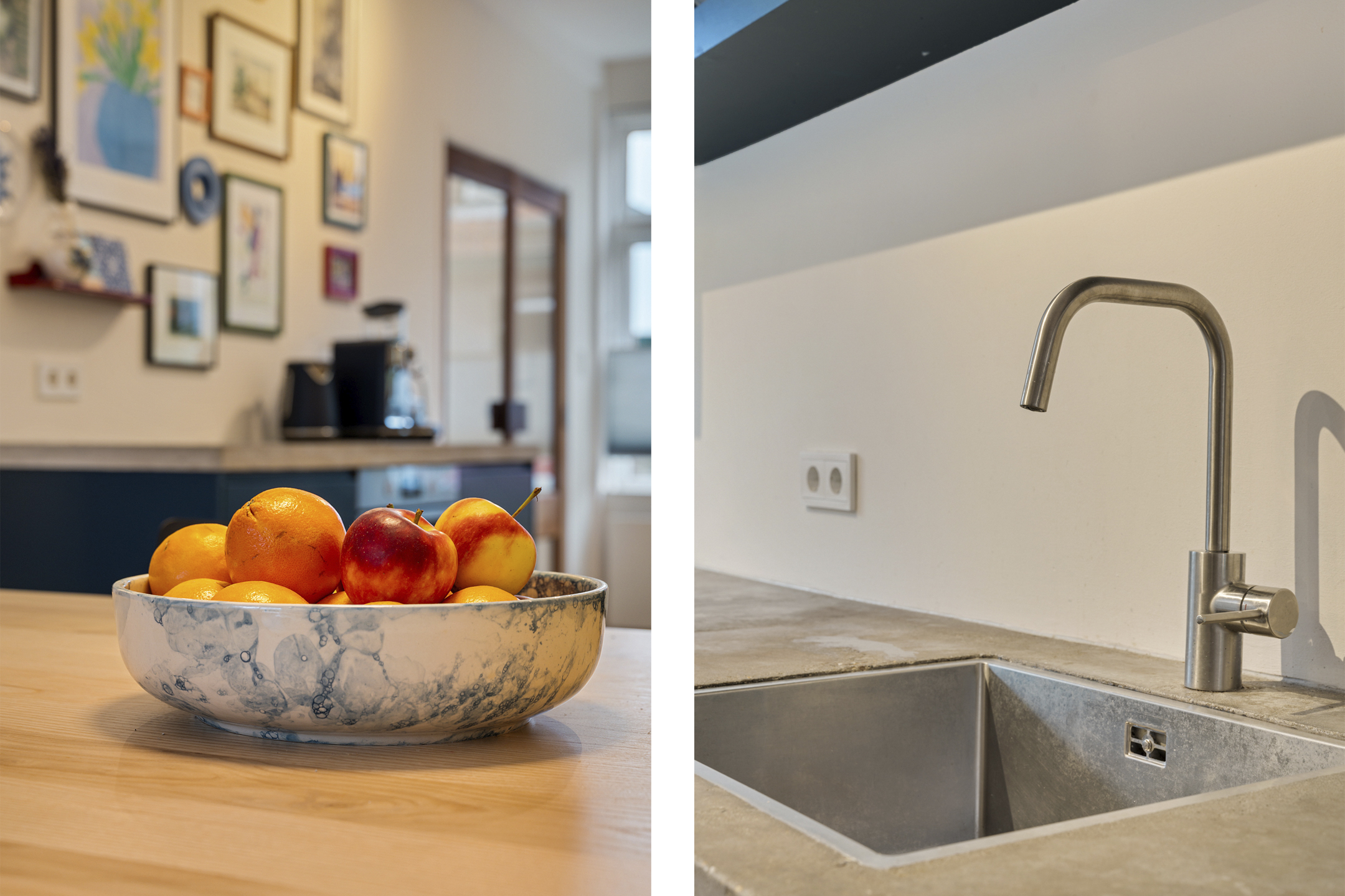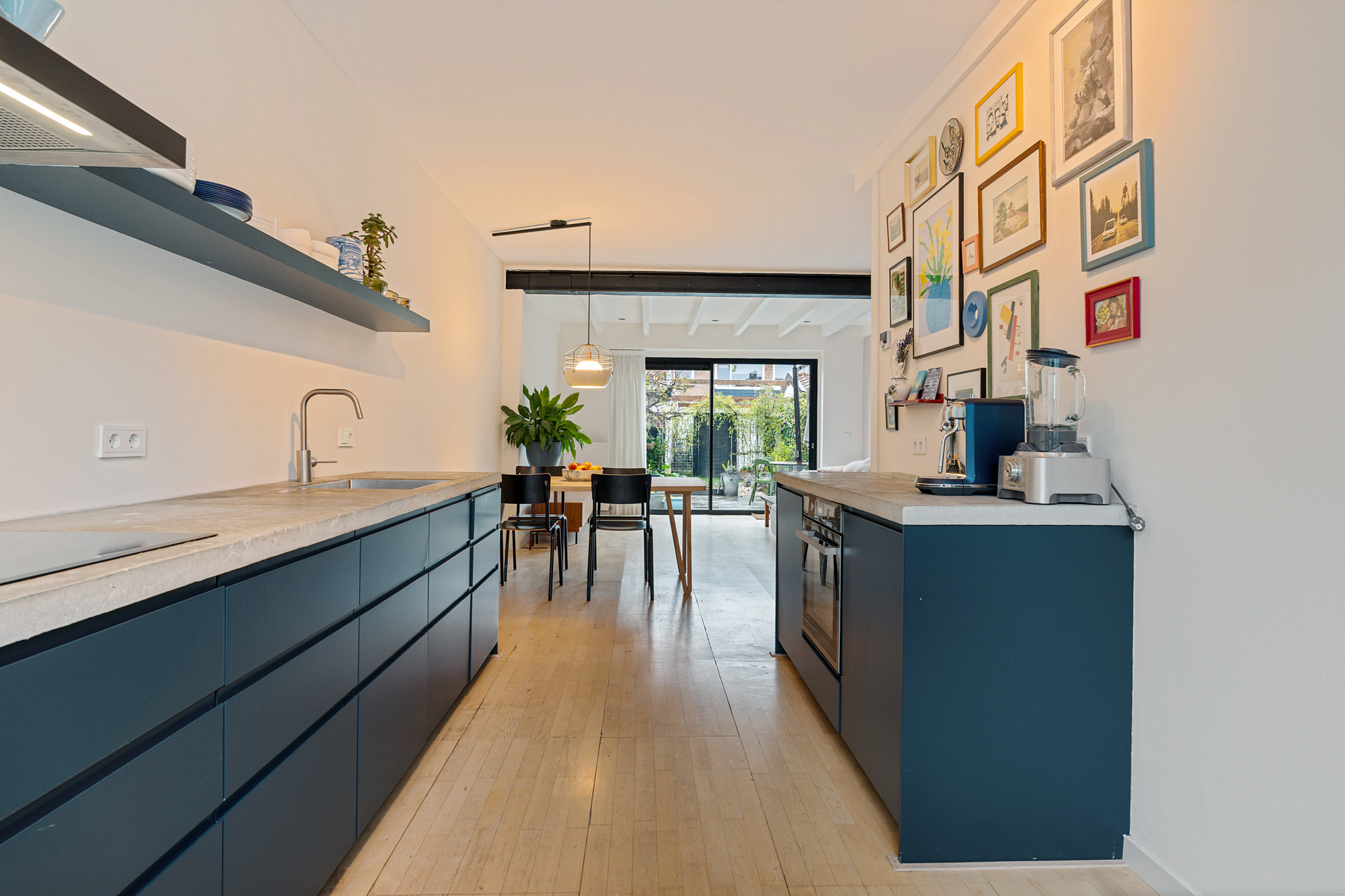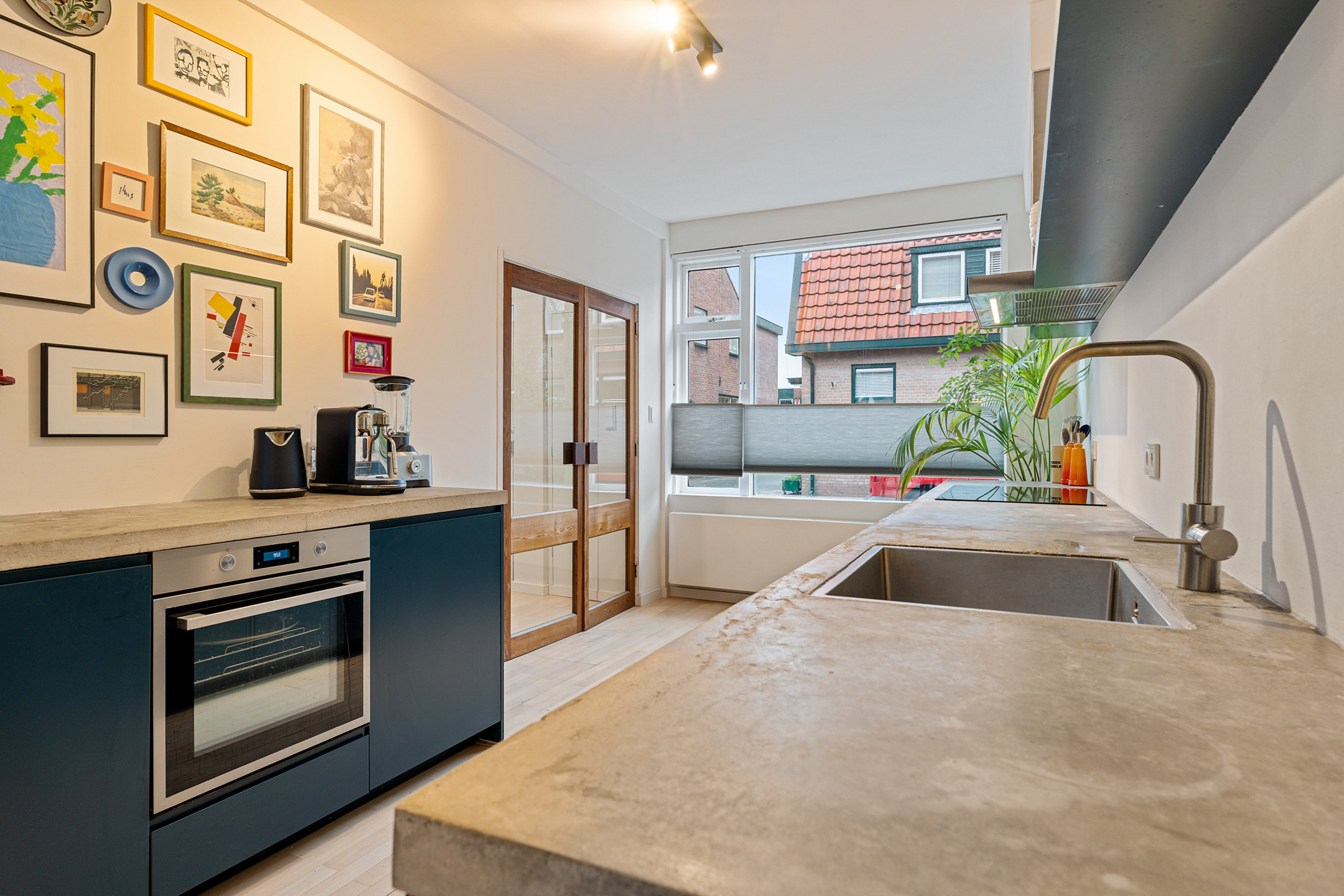 Aan de voorzijde bevindt zich de open keuken (2021), uitgevoerd met een industrieel betonnen werkblad, een accent van agaat natuursteen en diverse luxe inbouwapparatuur, waaronder een inductiekookplaat, afzuigkap, vaatwasser, heteluchtoven, koelkast en vriezer.
