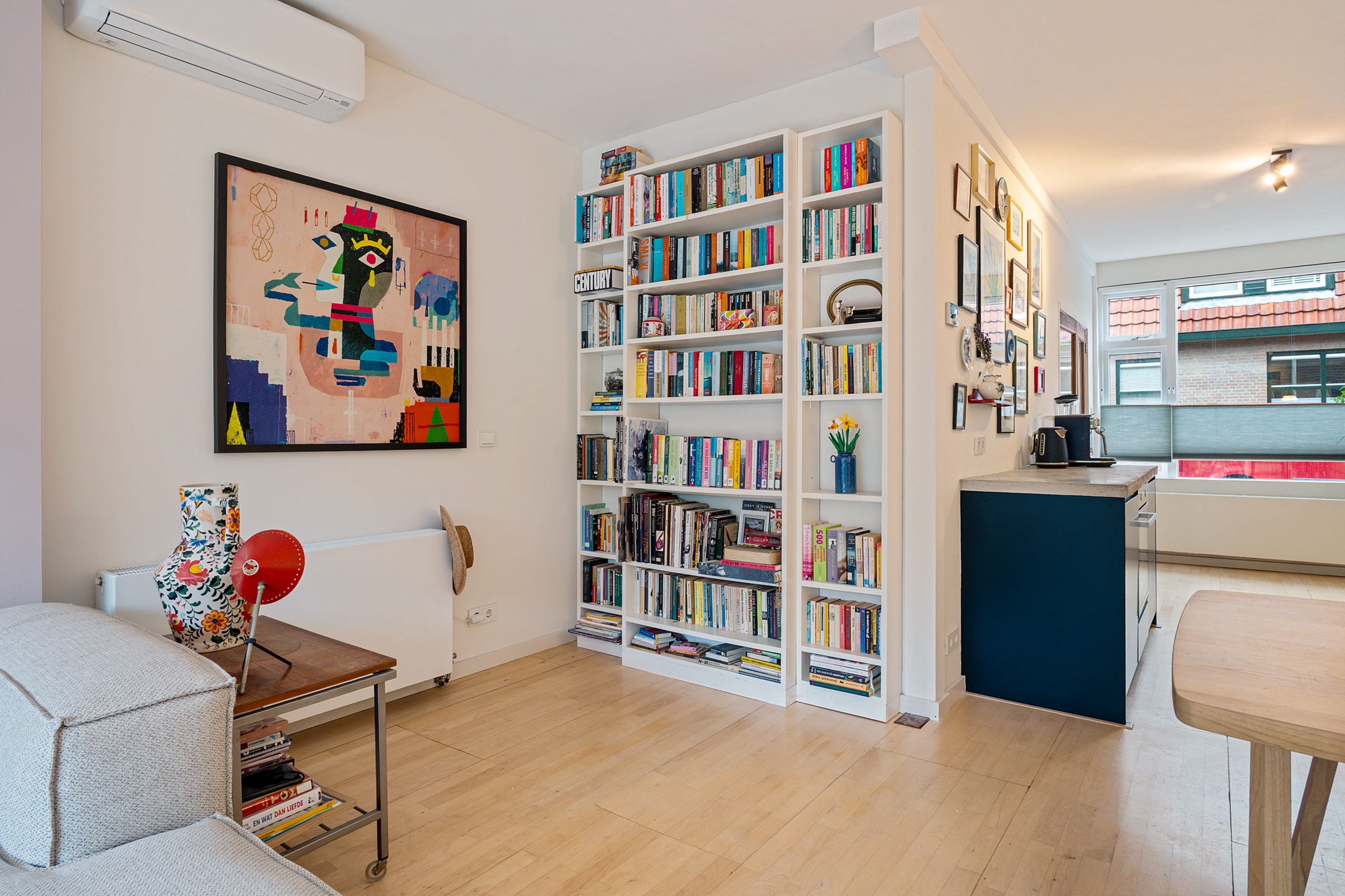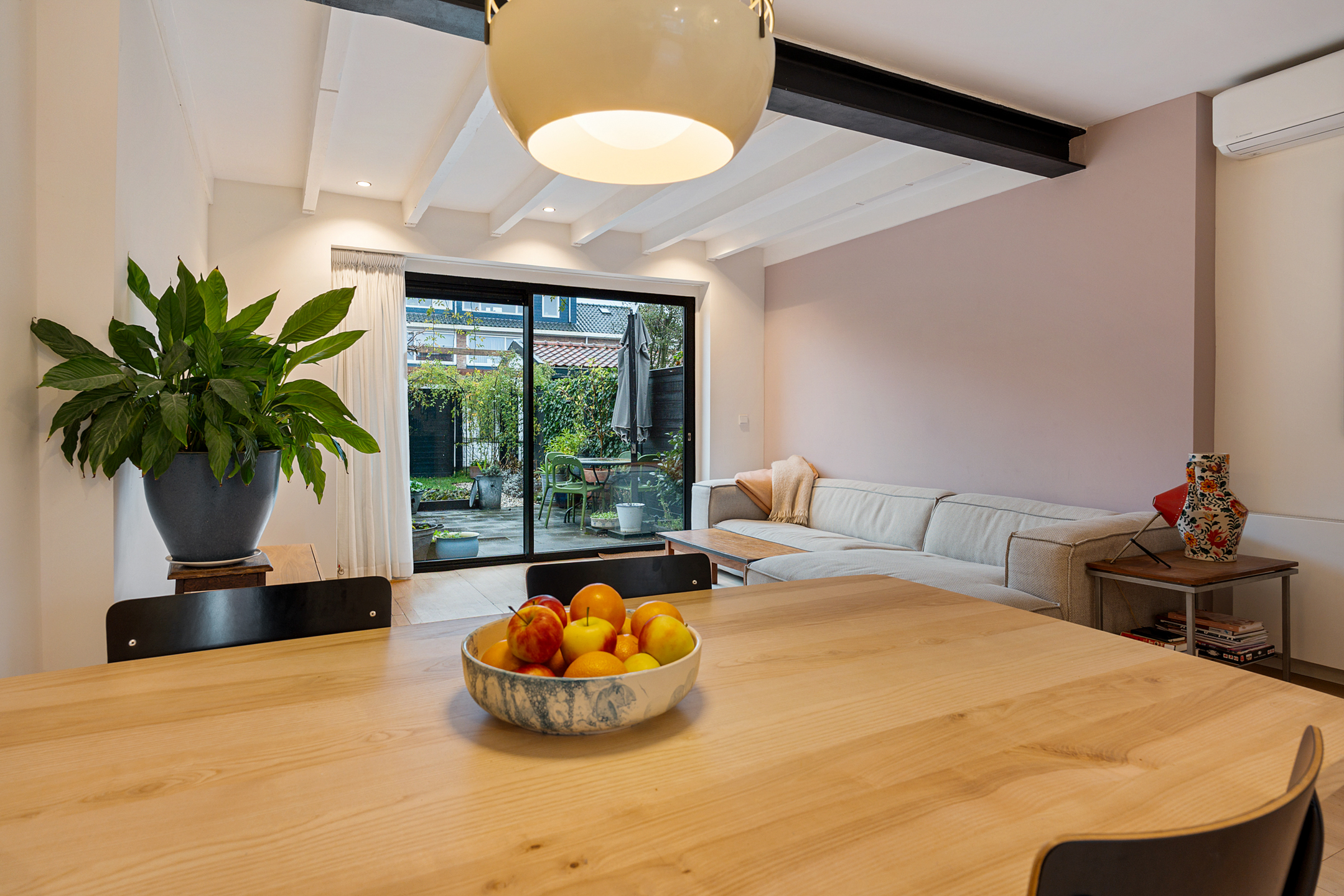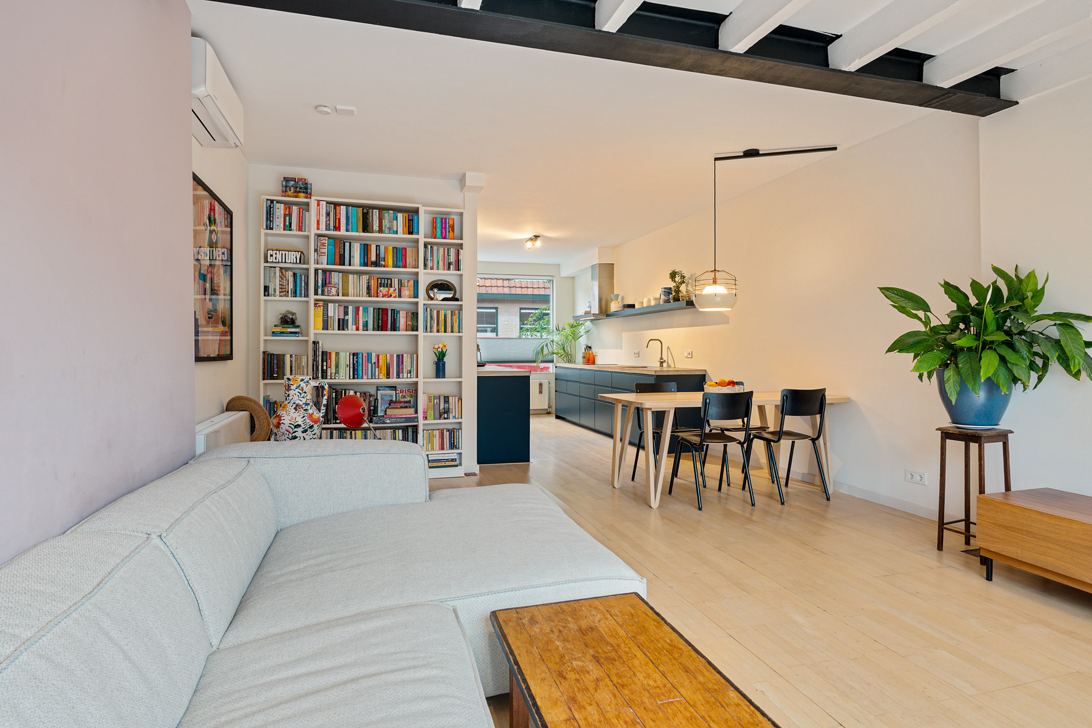 De lichte woonkamer is voorzien van een originele oude basketbalvloer, airconditioning en een aluminium schuifpui naar de achtertuin. Een ruimte met karakter en een warm, eigen verhaal.