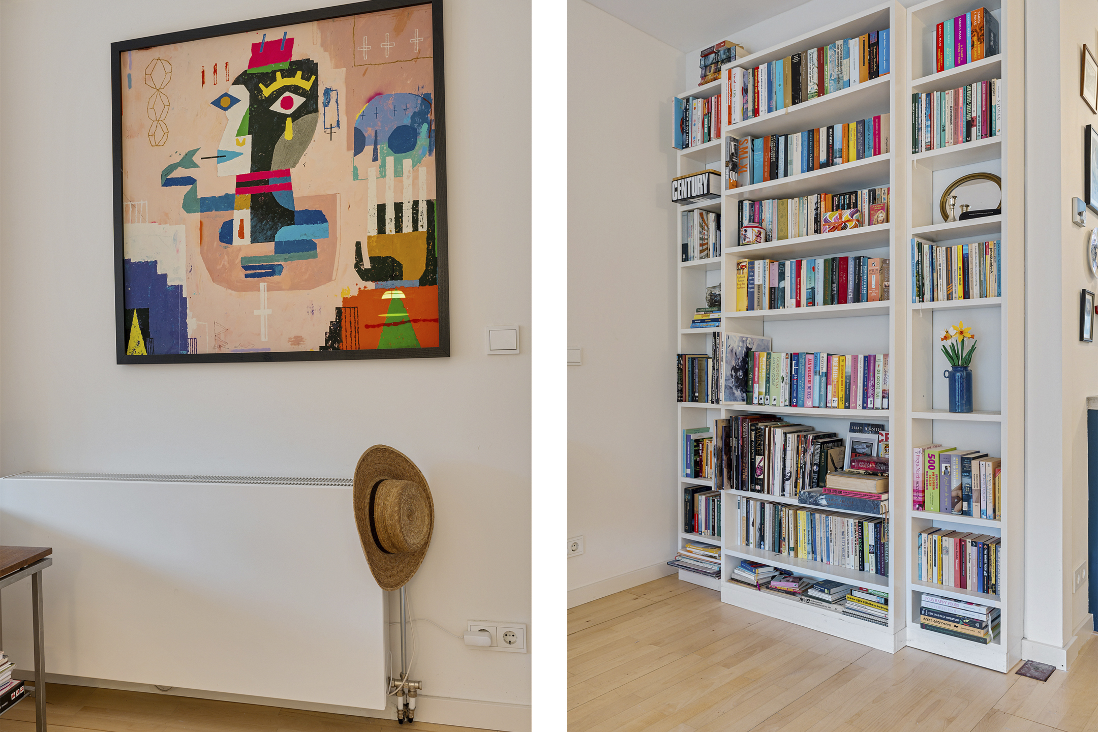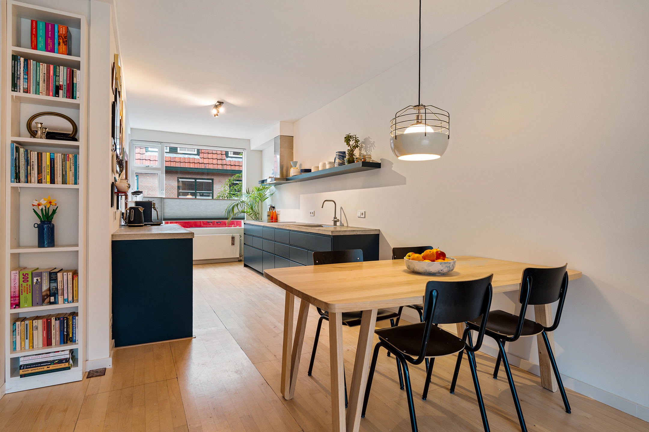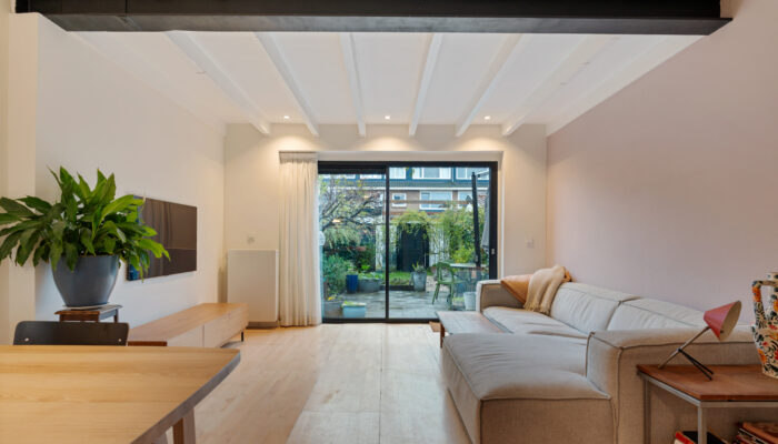 De lichte woonkamer is voorzien van een originele oude basketbalvloer, airconditioning en een aluminium schuifpui naar de achtertuin. Een ruimte met karakter en een warm, eigen verhaal.