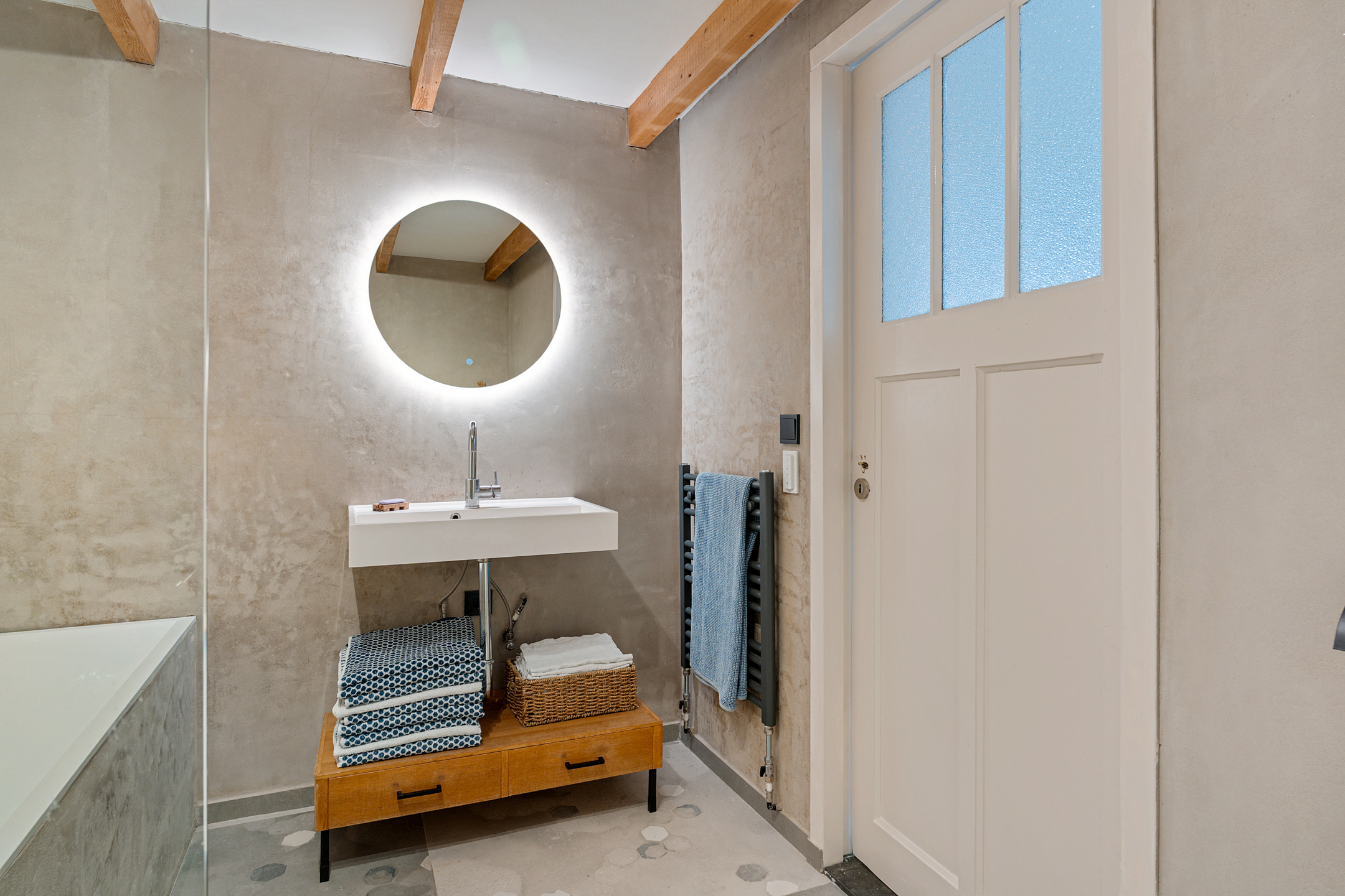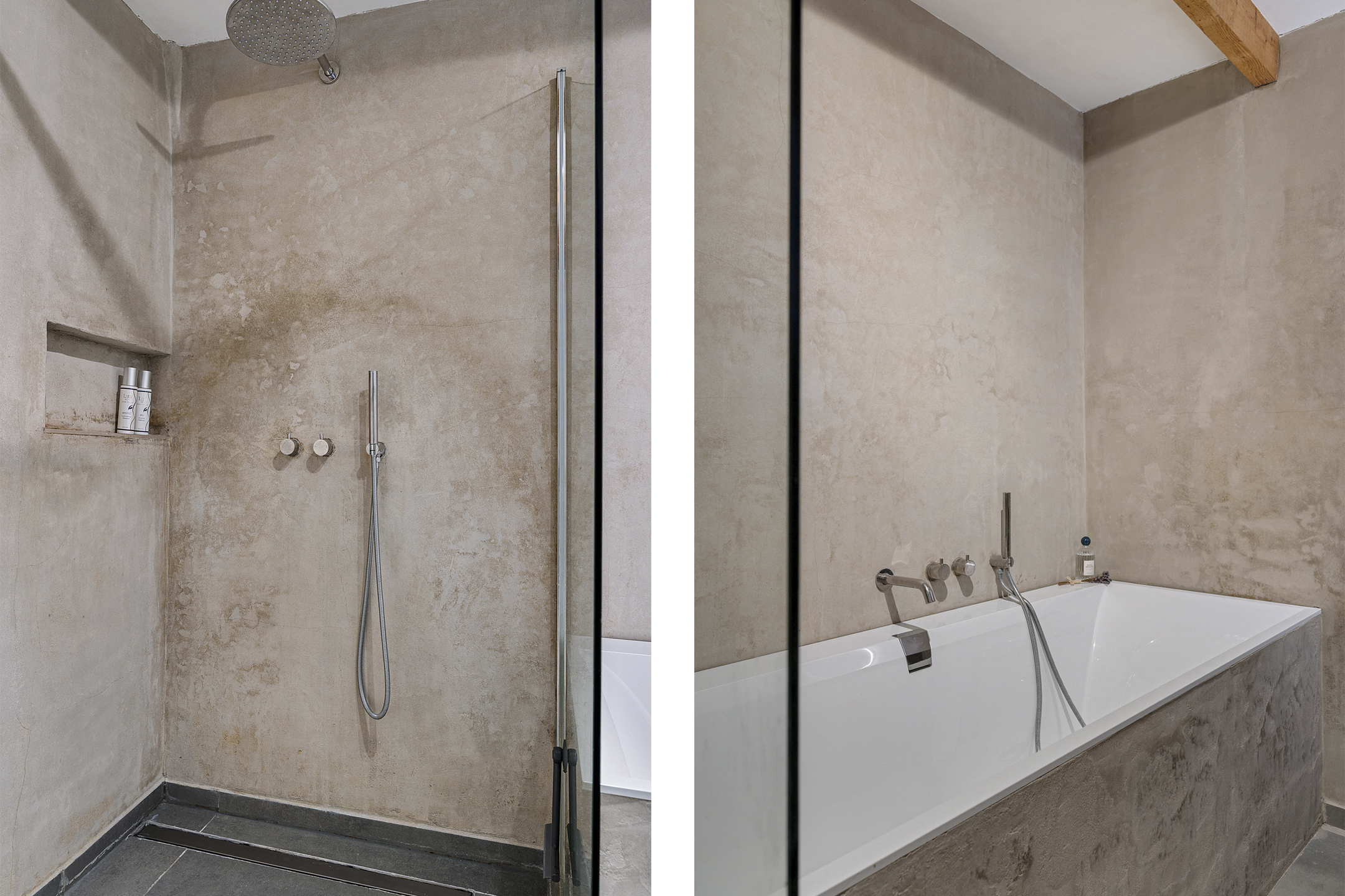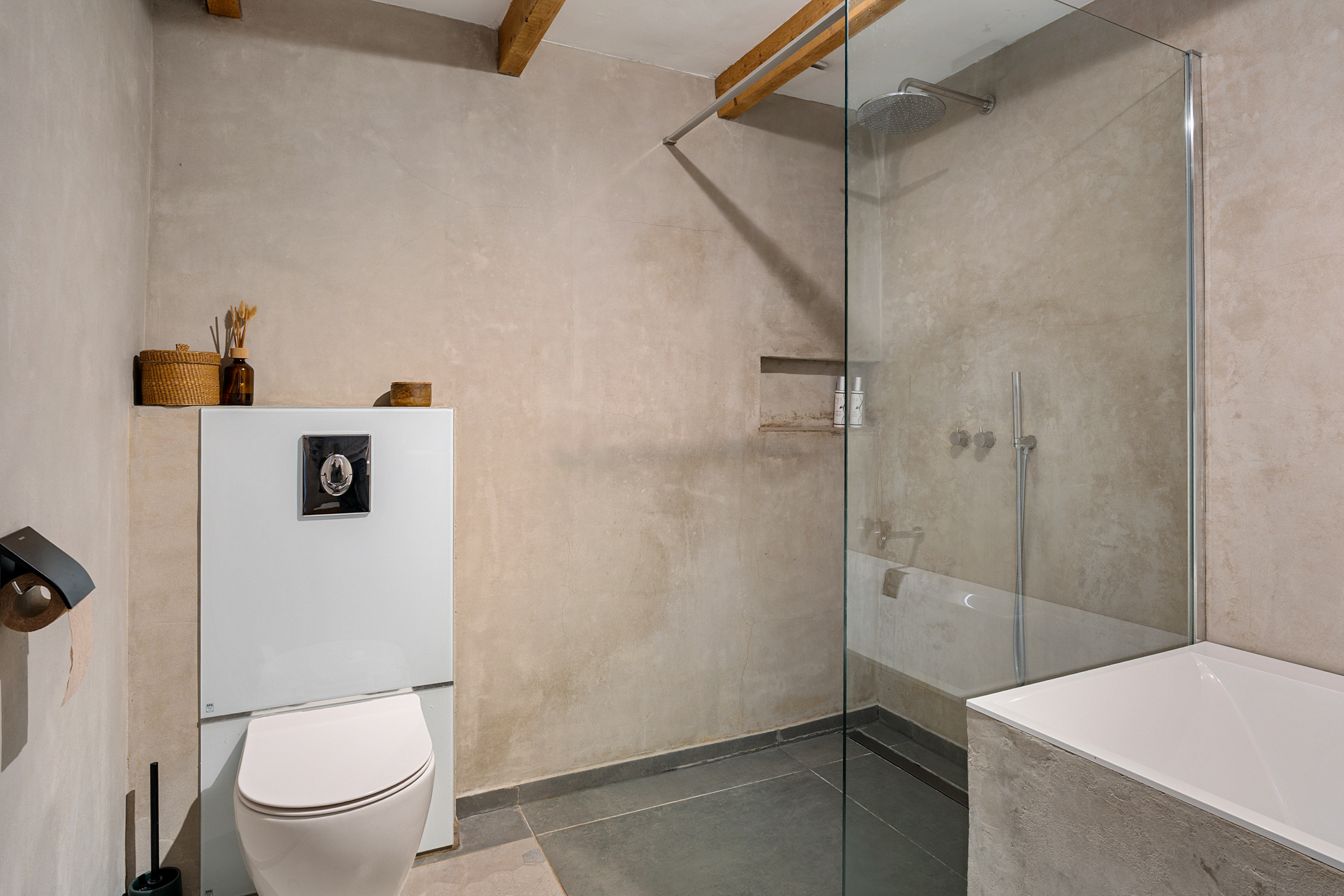 De stijlvolle inpandige badkamer is uitgevoerd in grijstinten met beton ciré wanden en is voorzien van een ruime inloopdouche, ligbad, toilet en wastafel. Een luxe en rustige ruimte die perfect past bij de uitstraling van de woning.