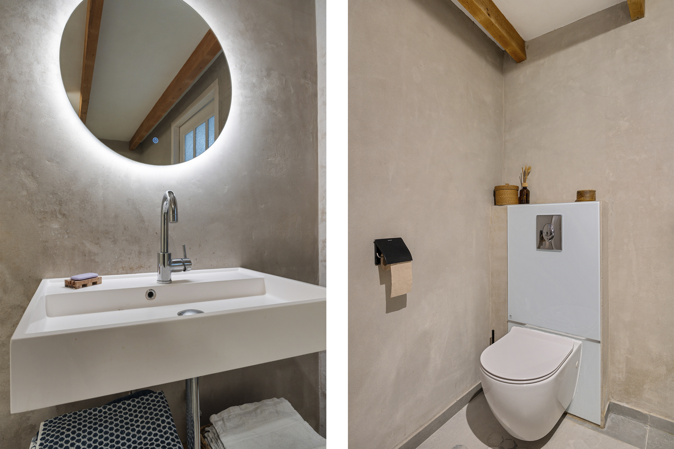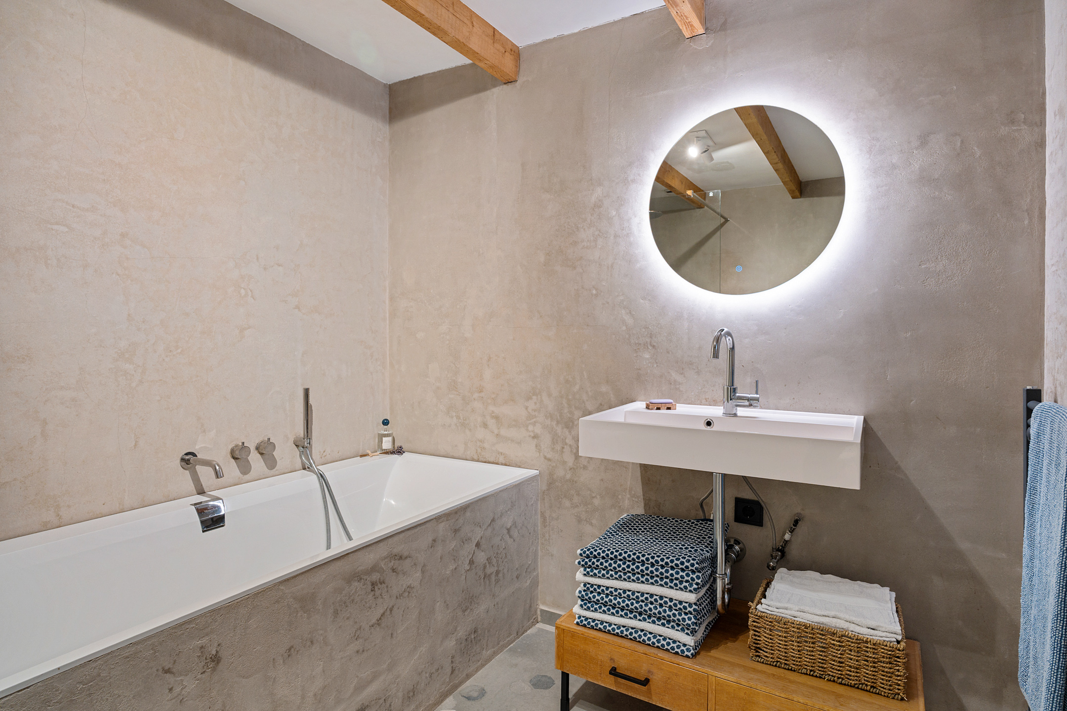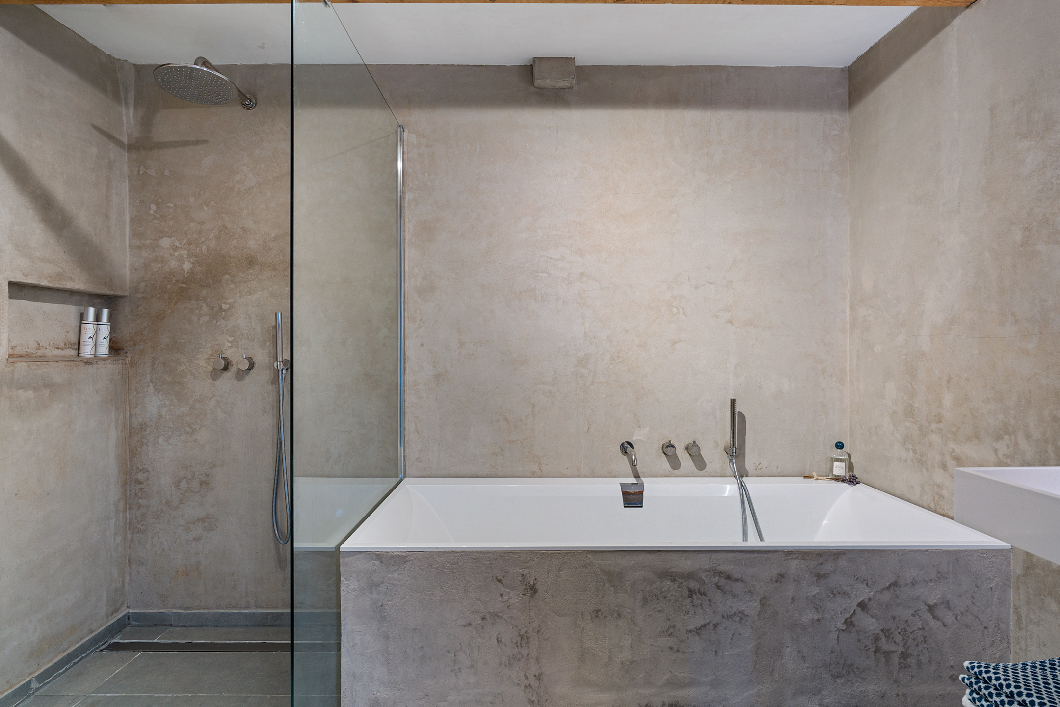 De stijlvolle inpandige badkamer is uitgevoerd in grijstinten met beton ciré wanden en is voorzien van een ruime inloopdouche, ligbad, toilet en wastafel. Een luxe en rustige ruimte die perfect past bij de uitstraling van de woning.