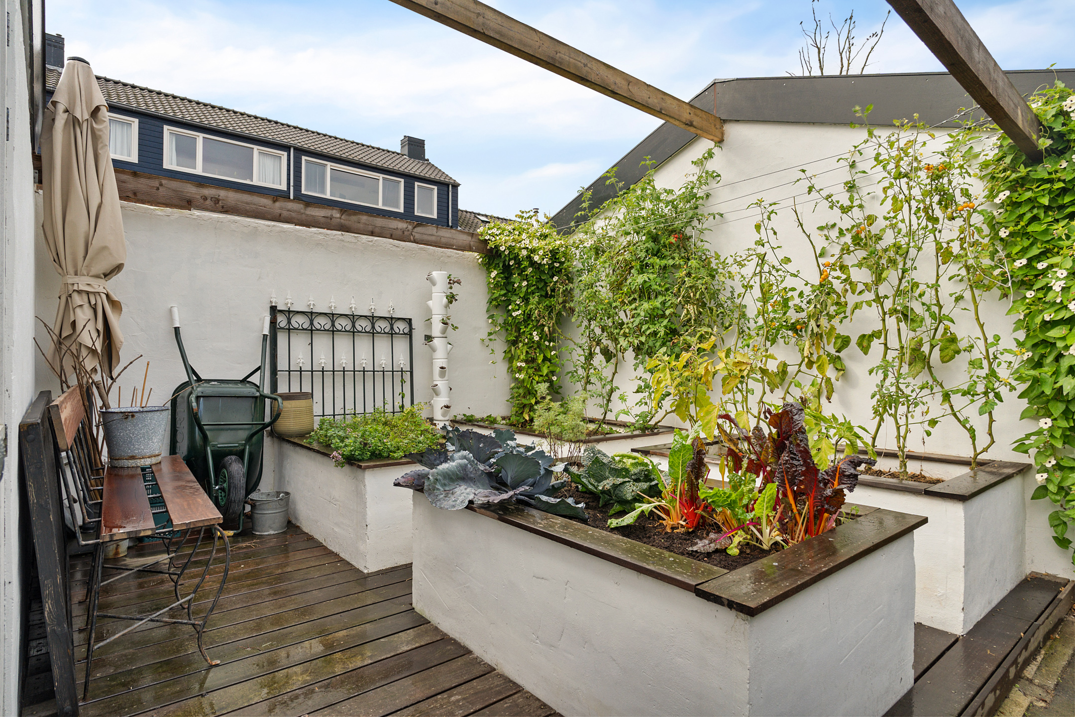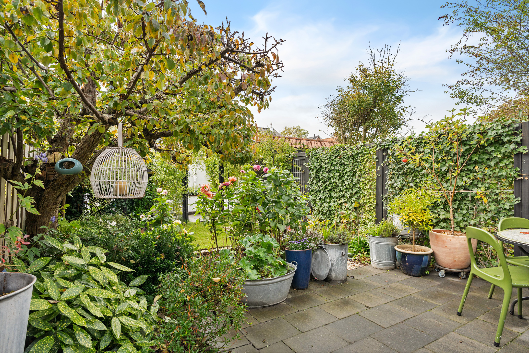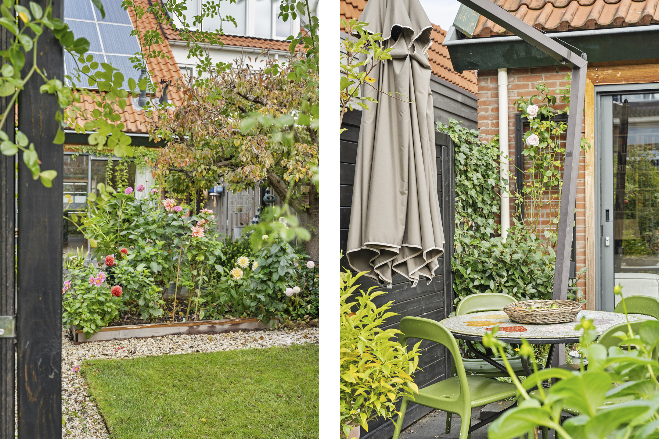 De achtertuin ligt heerlijk op het zuidwesten en is ingericht met meerdere gezellige zitjes. Je geniet hier van diverse fruitbomen, waaronder druif en peer, een rozenboom én een eigen moestuin achterin de tuin.