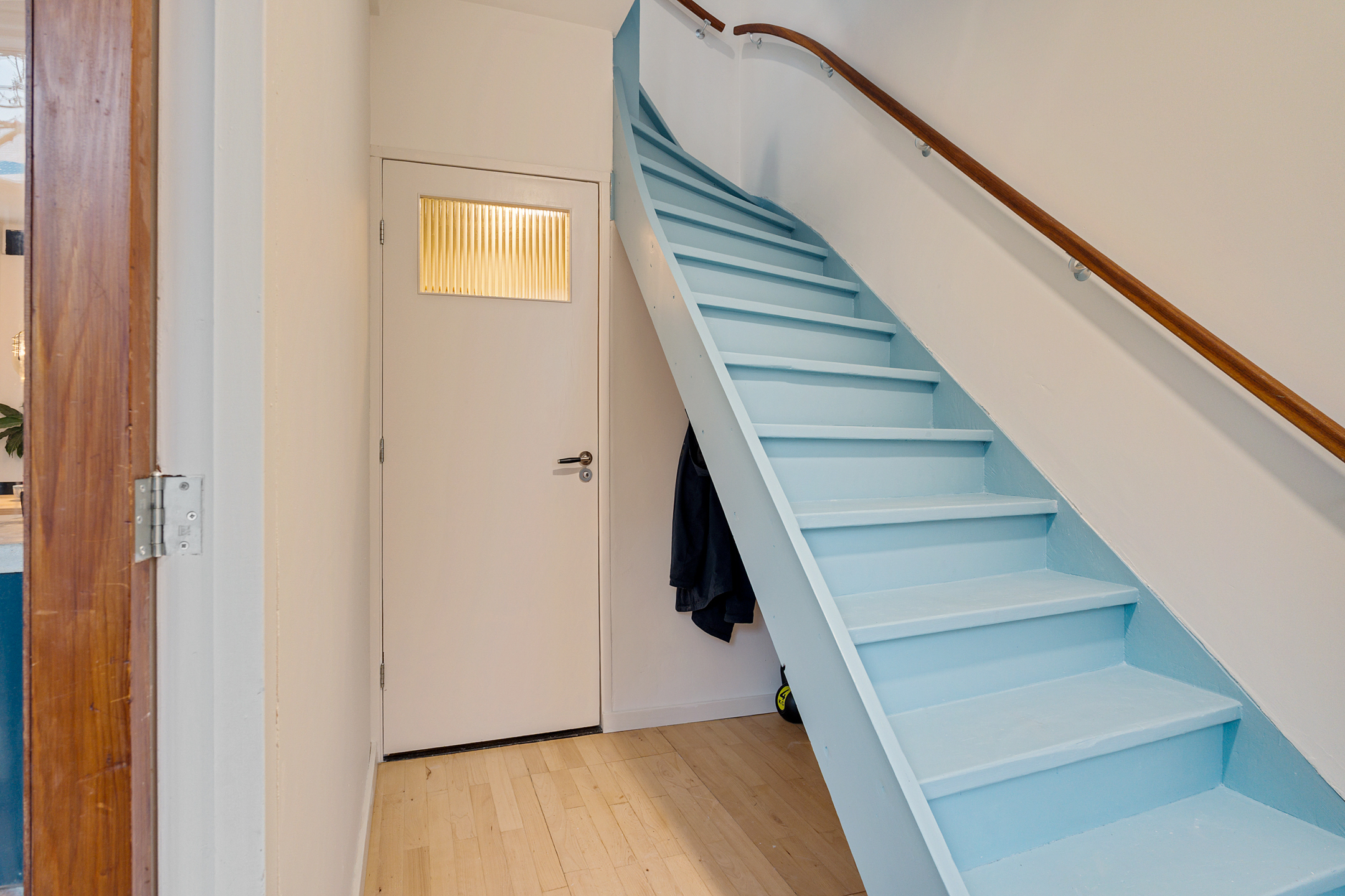 Via de entree kom je in de hal met meterkast, toilet en trapopgang naar de eerste verdieping. Vanuit de hal openen dubbele openslaande oude schooldeuren naar de woonkamer – een echte blikvanger die direct de unieke sfeer van de woning benadrukt.