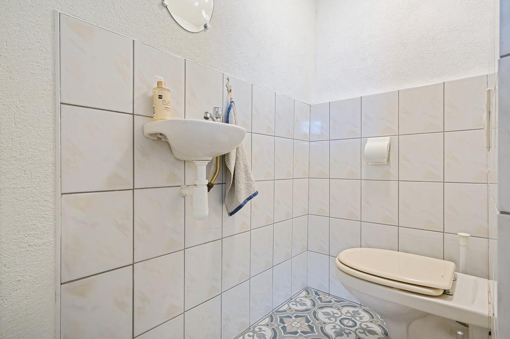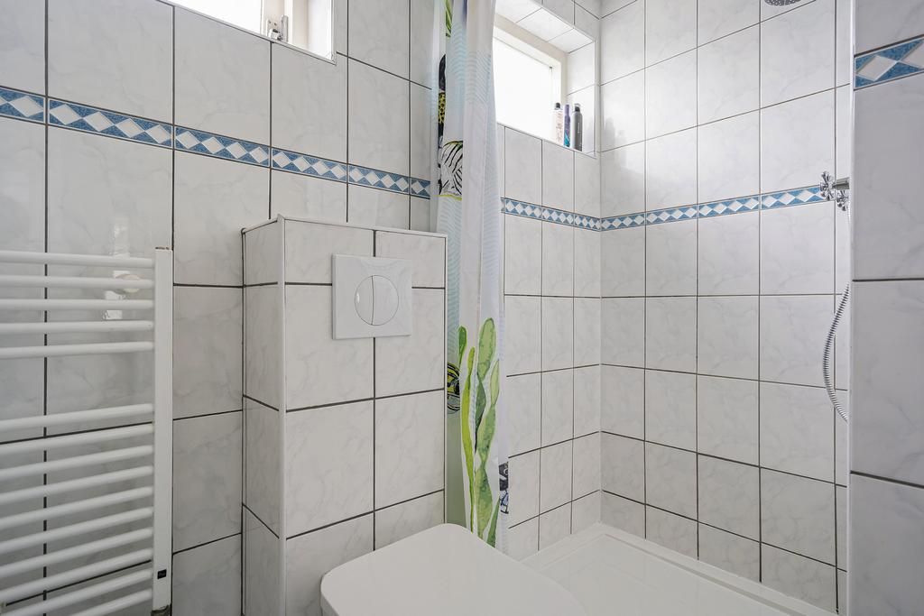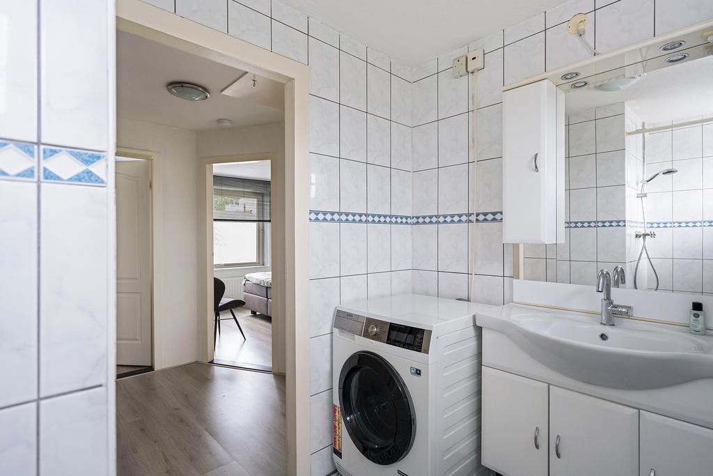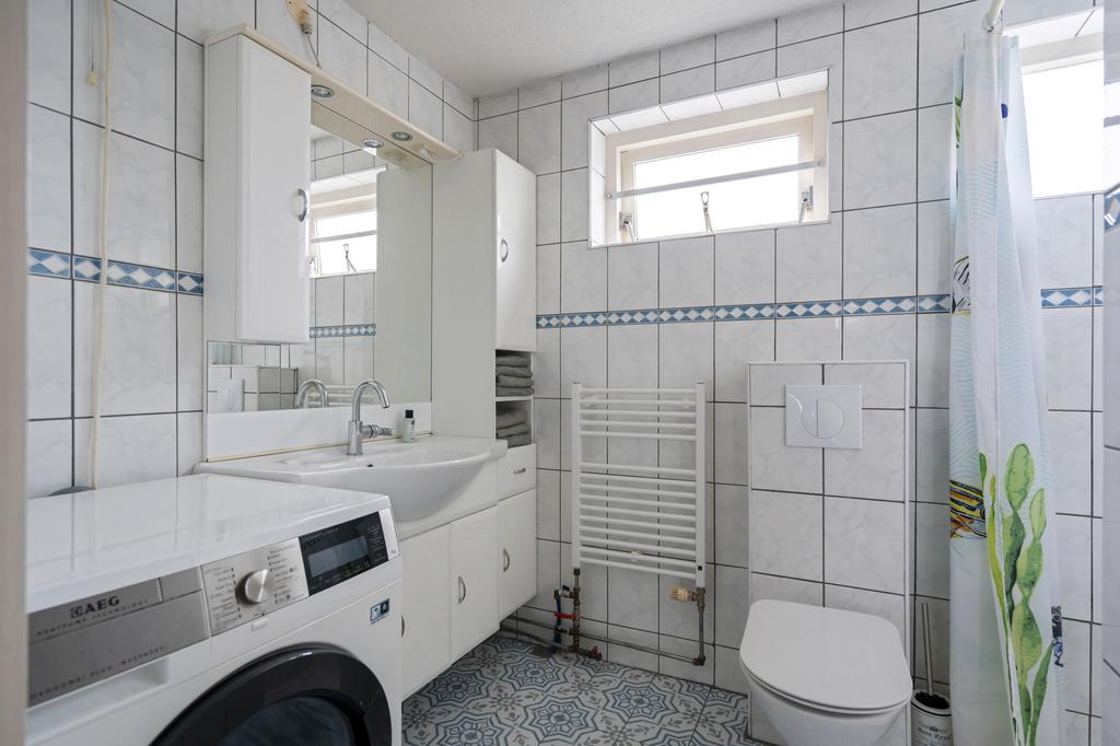 De volledige betegelde badkamer aan de achterzijde is voorzien van een douche, wastafelmeubel, toilet en wasmachineaansluiting.