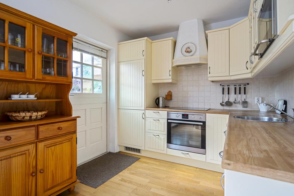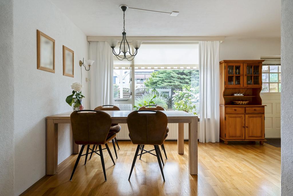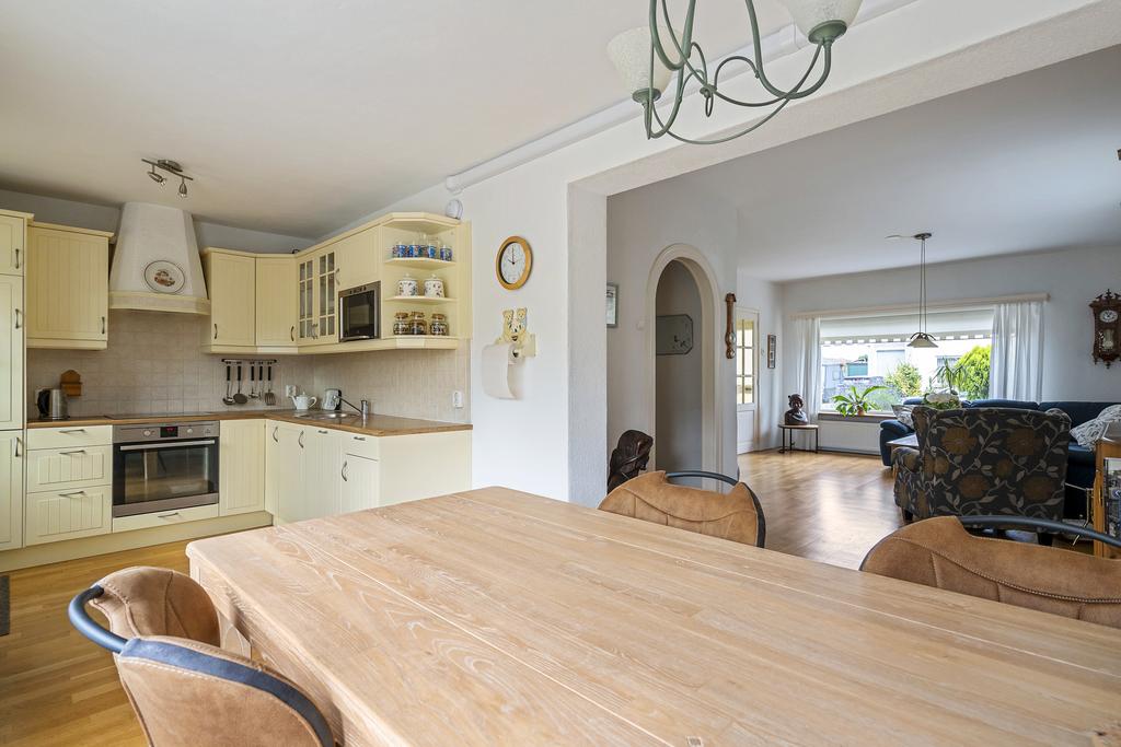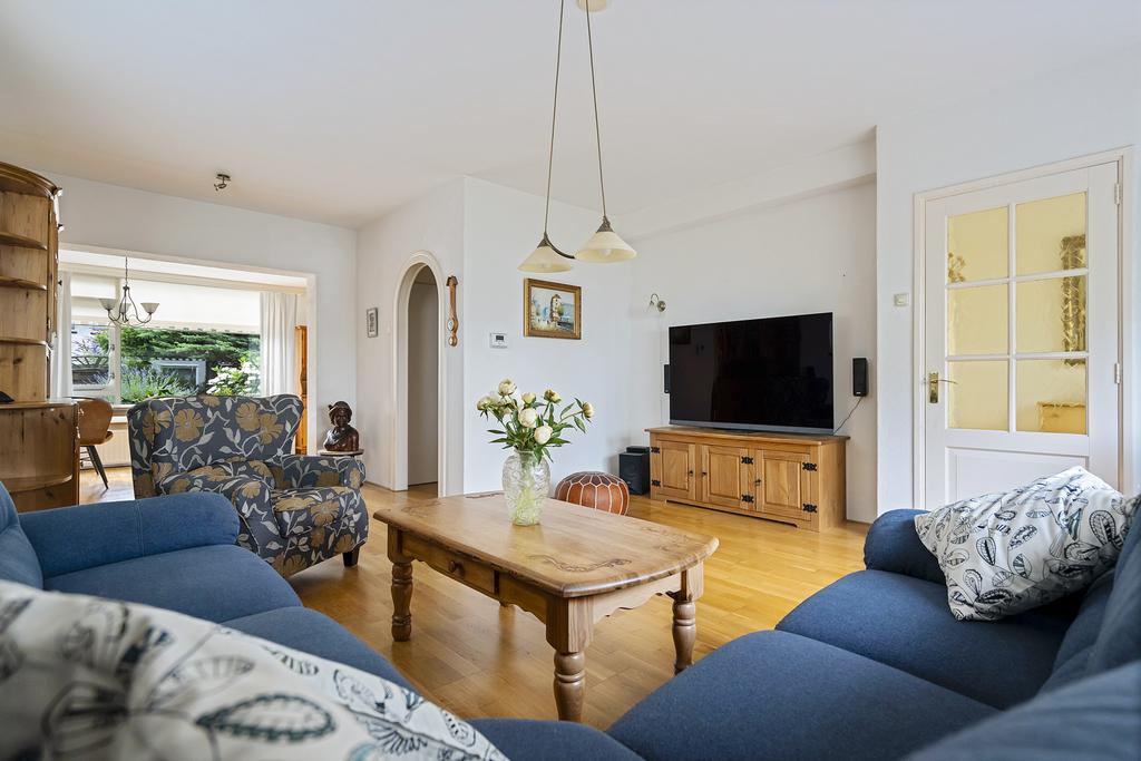 De woonkamer met eiken parketvloer is knus en heeft extra lichtinval door zijraam. Doorloop naar de uitbouw alwaar de eetkamer en de keuken zich bevinden. Het keukenblok uit 2005 is in een hoekopstelling, landelijke stijl en voorzien van diverse inbouwapparatuur. Toegang tot de achtertuin.