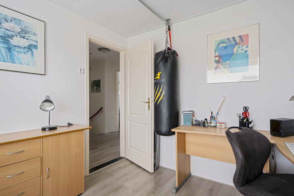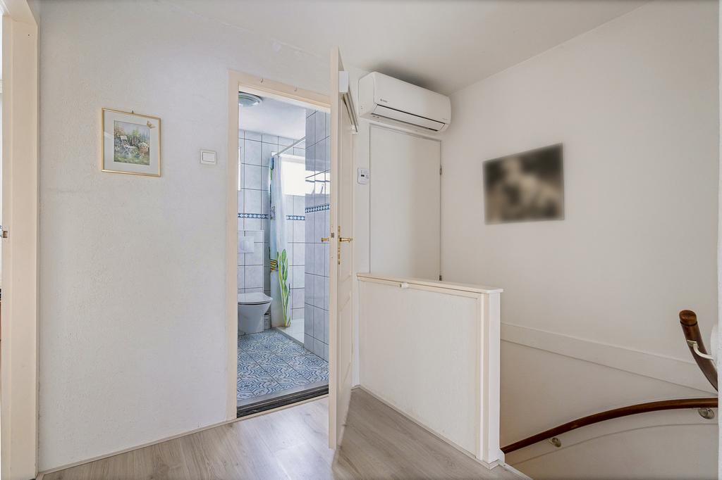 Overloop met luik naar vliering en laminaatvloer. Boven het trapgat zit een vaste kast met opstelling van de oude cv-ketel (niet meer in gebruik). Verder is er een airco aanwezig.