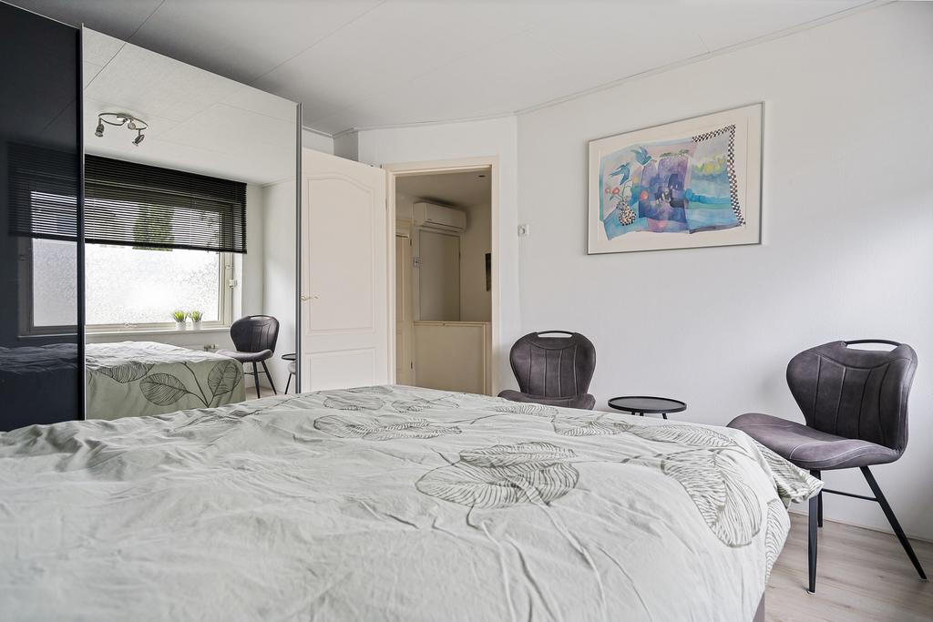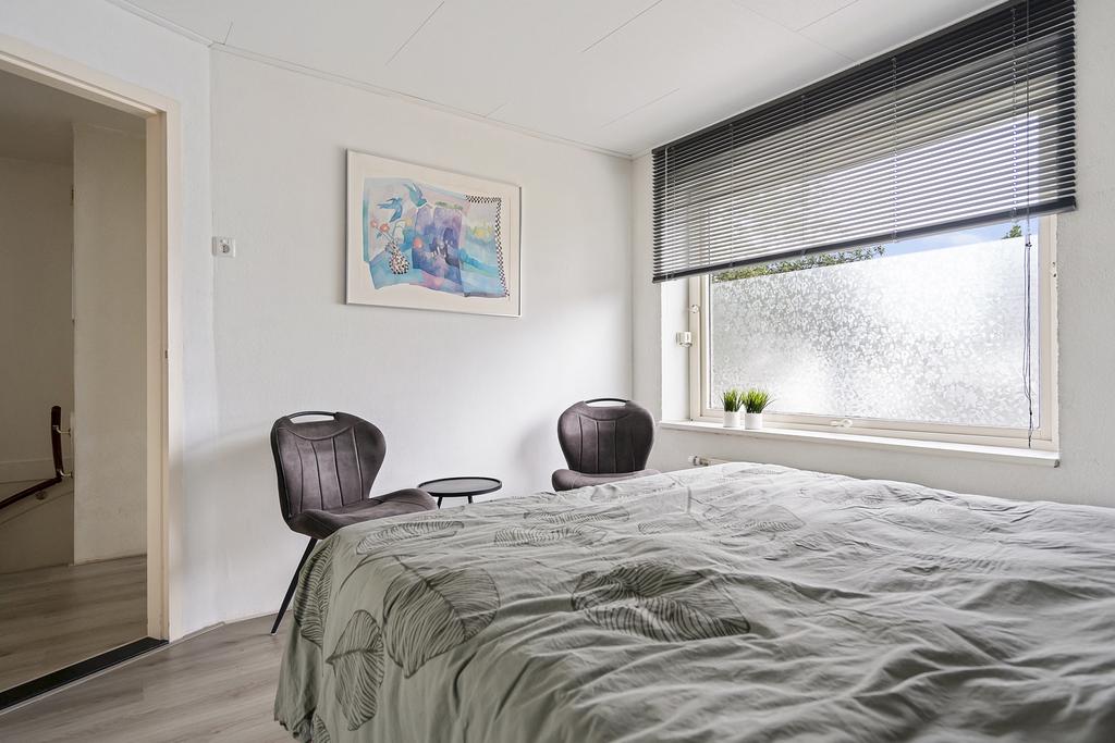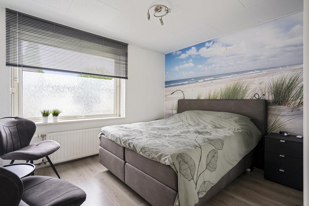 Slaapkamer 1 aan de voorzijde met draairaam, vaste kast en rolluik.