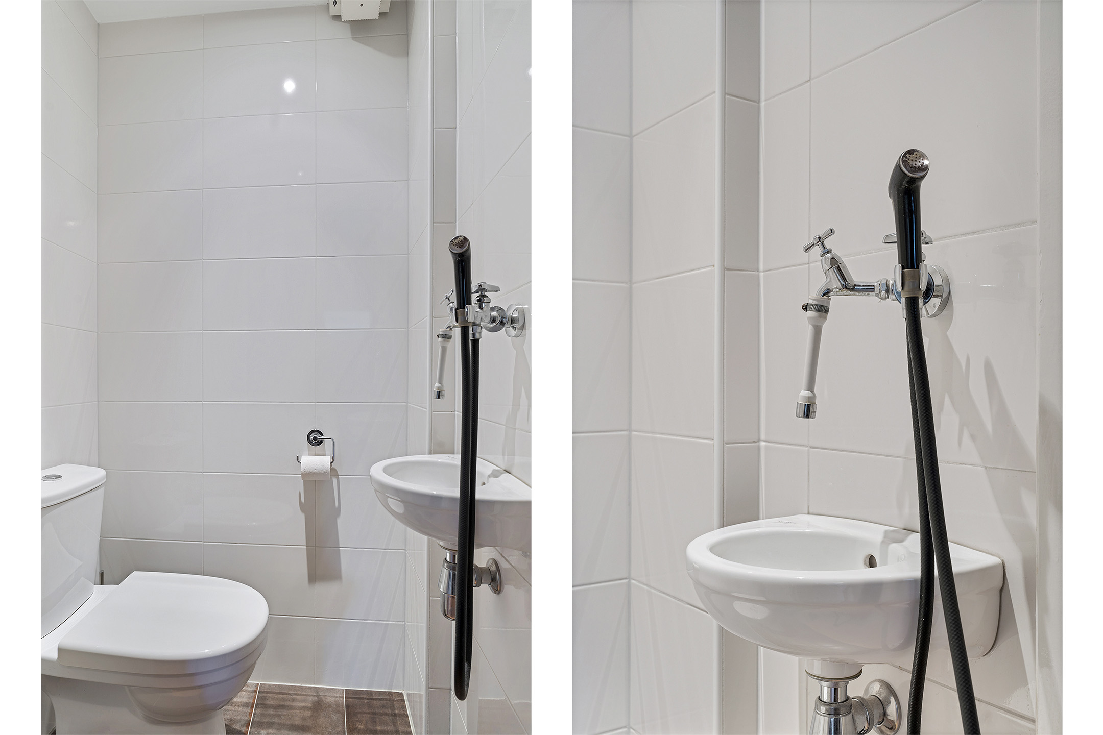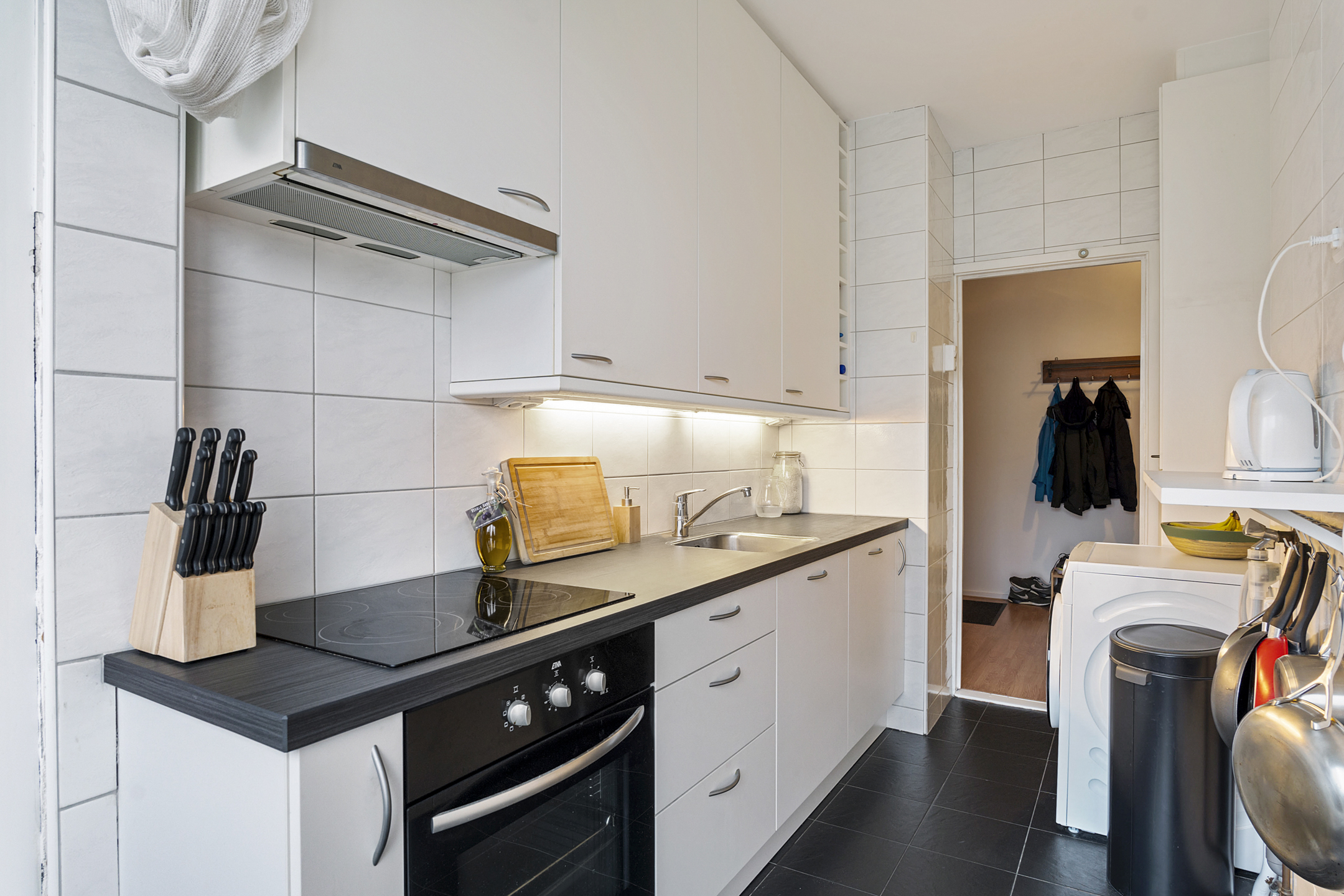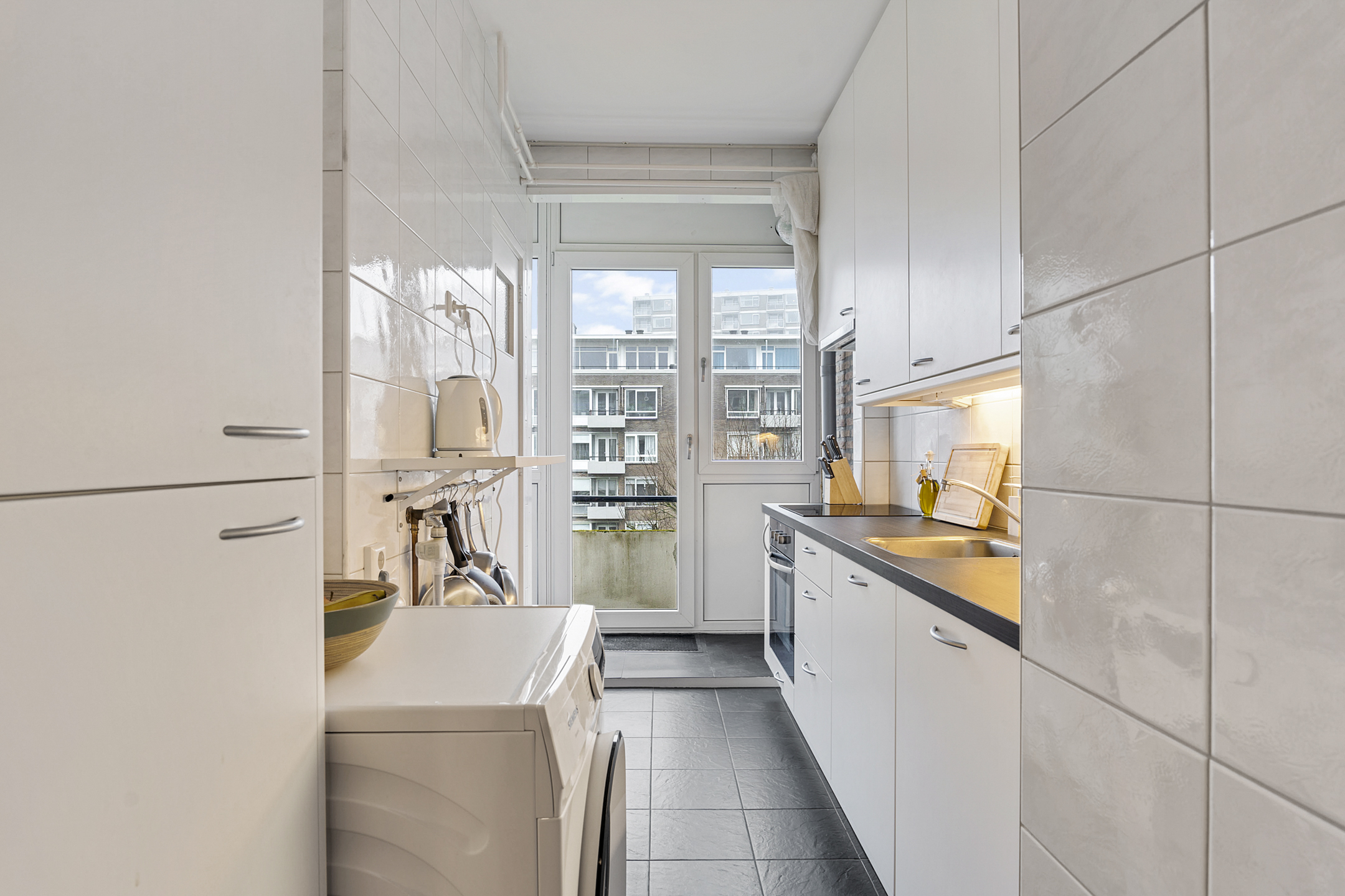 De keuken is uitgerust met een inductiekookplaat, afzuigkap, oven en aansluitingen voor zowel een wasmachine als een droger. Het achterbalkon is bereikbaar vanuit de keuken.