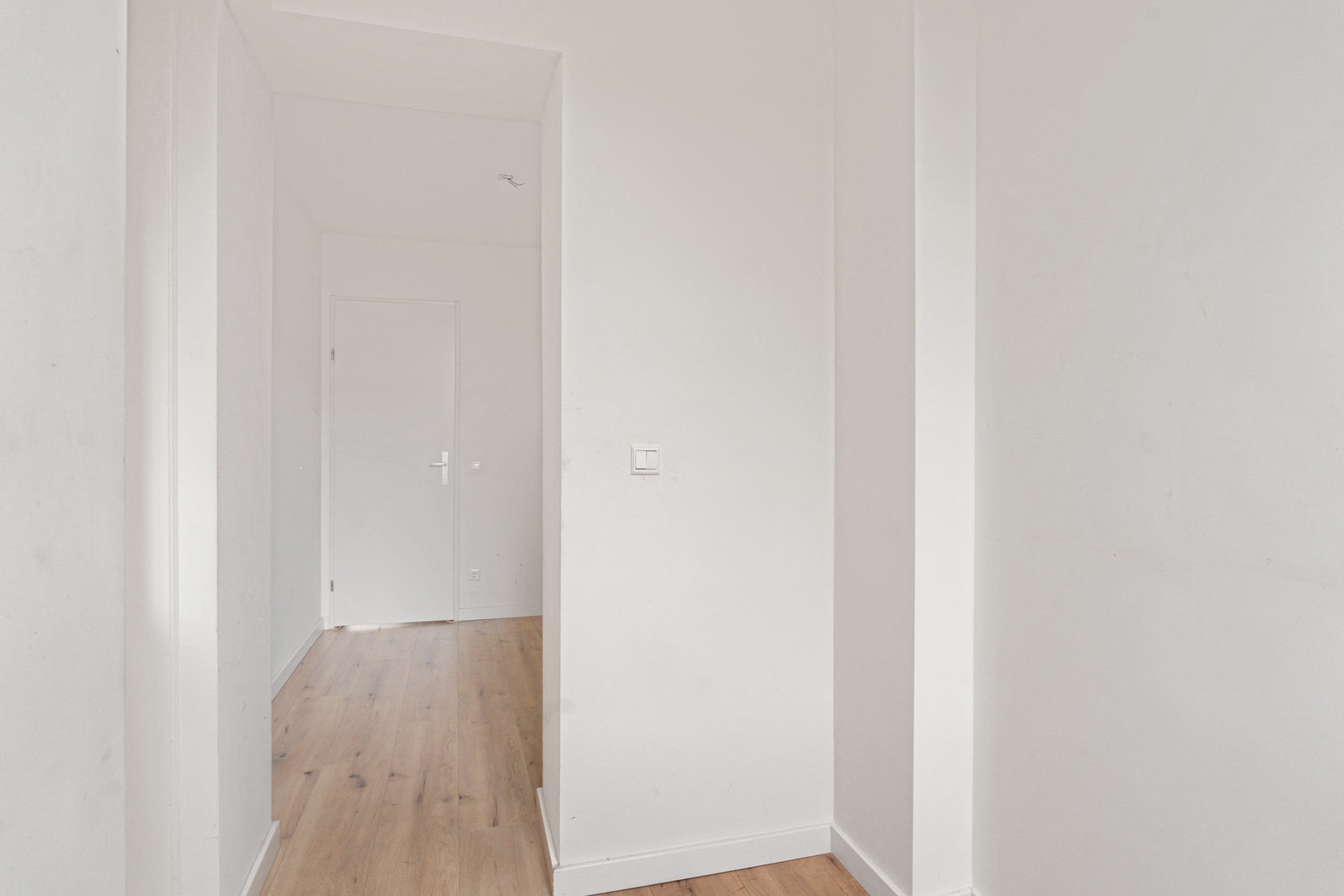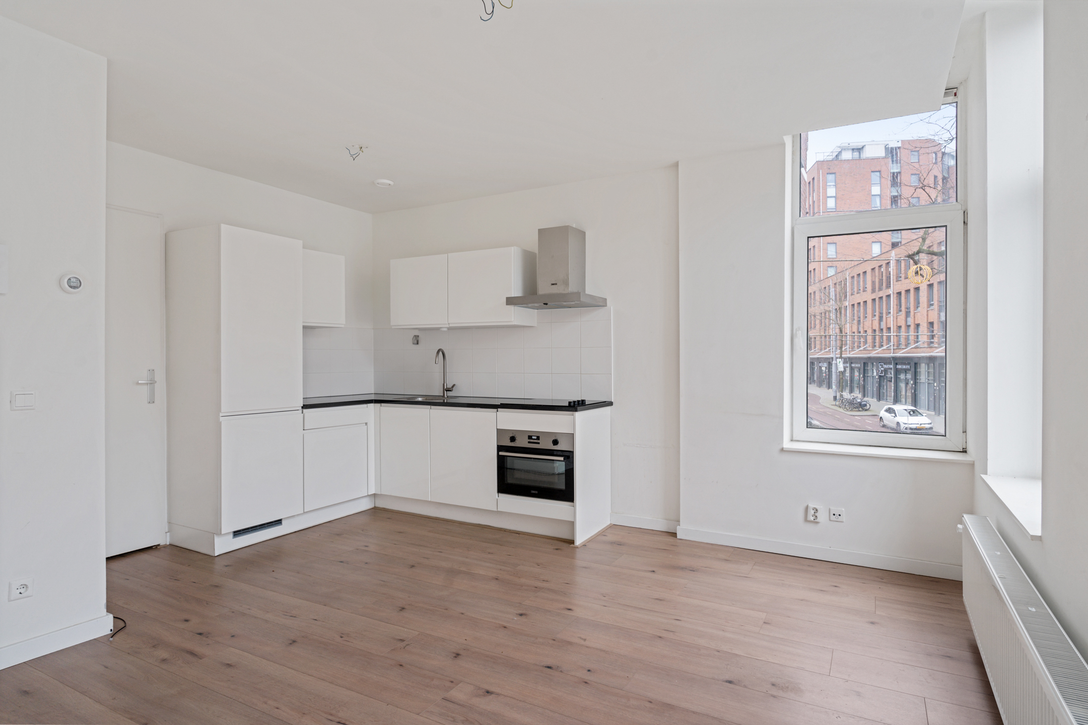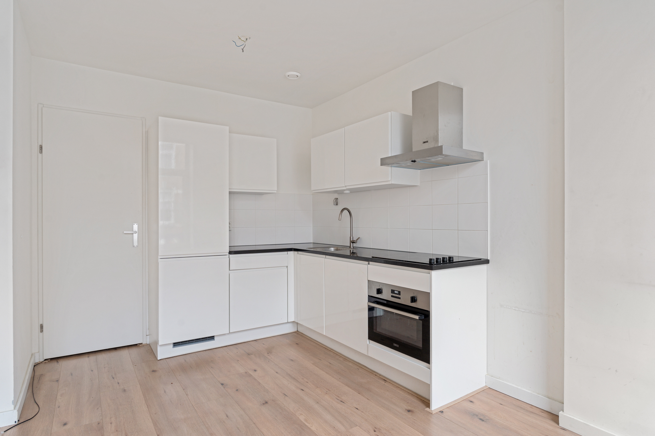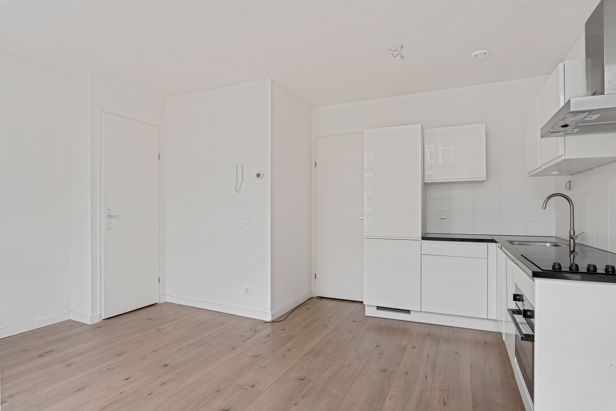 Bij binnenkomst kom je via de trap op de eerste verdieping van het appartement. Je betreedt de lichte woonkamer aan de voorzijde, waar de grote raampartijen zorgen voor een prettige en natuurlijke lichtinval. De strakke laminaatvloer in combinatie met de moderne open keuken geeft de ruimte een frisse, moderne look. De keuken is volledig uitgerust met inbouwapparatuur, waaronder een koelkast, vriezer, oven en inductiekookplaat, waardoor je hier direct comfortabel kunt koken en wonen.
