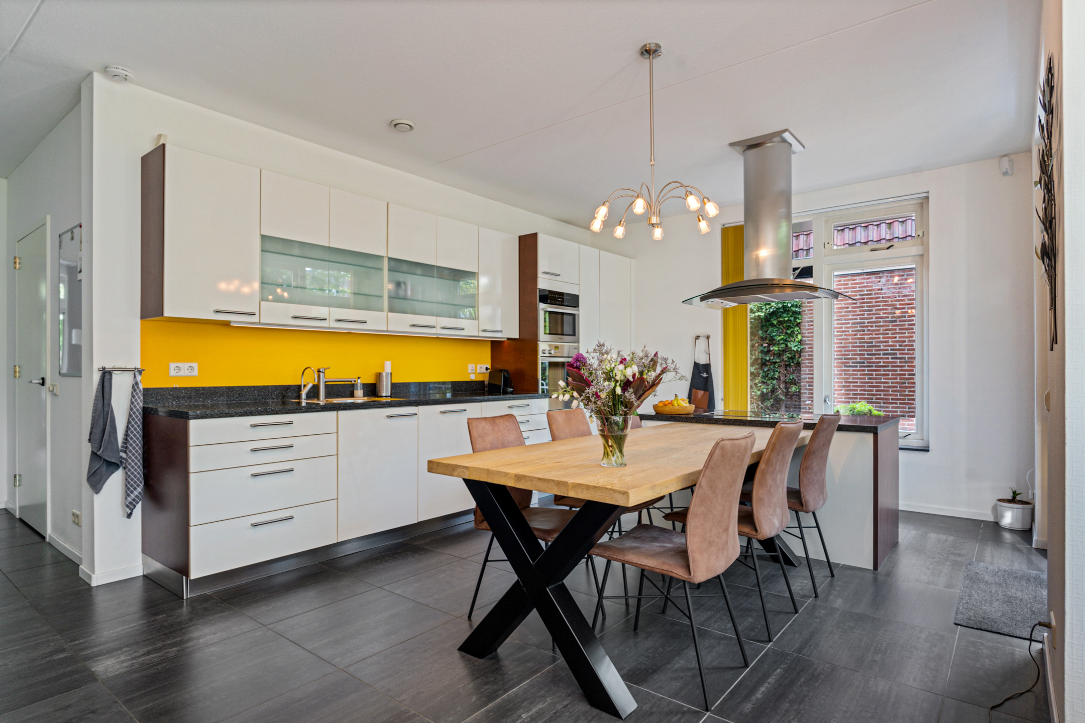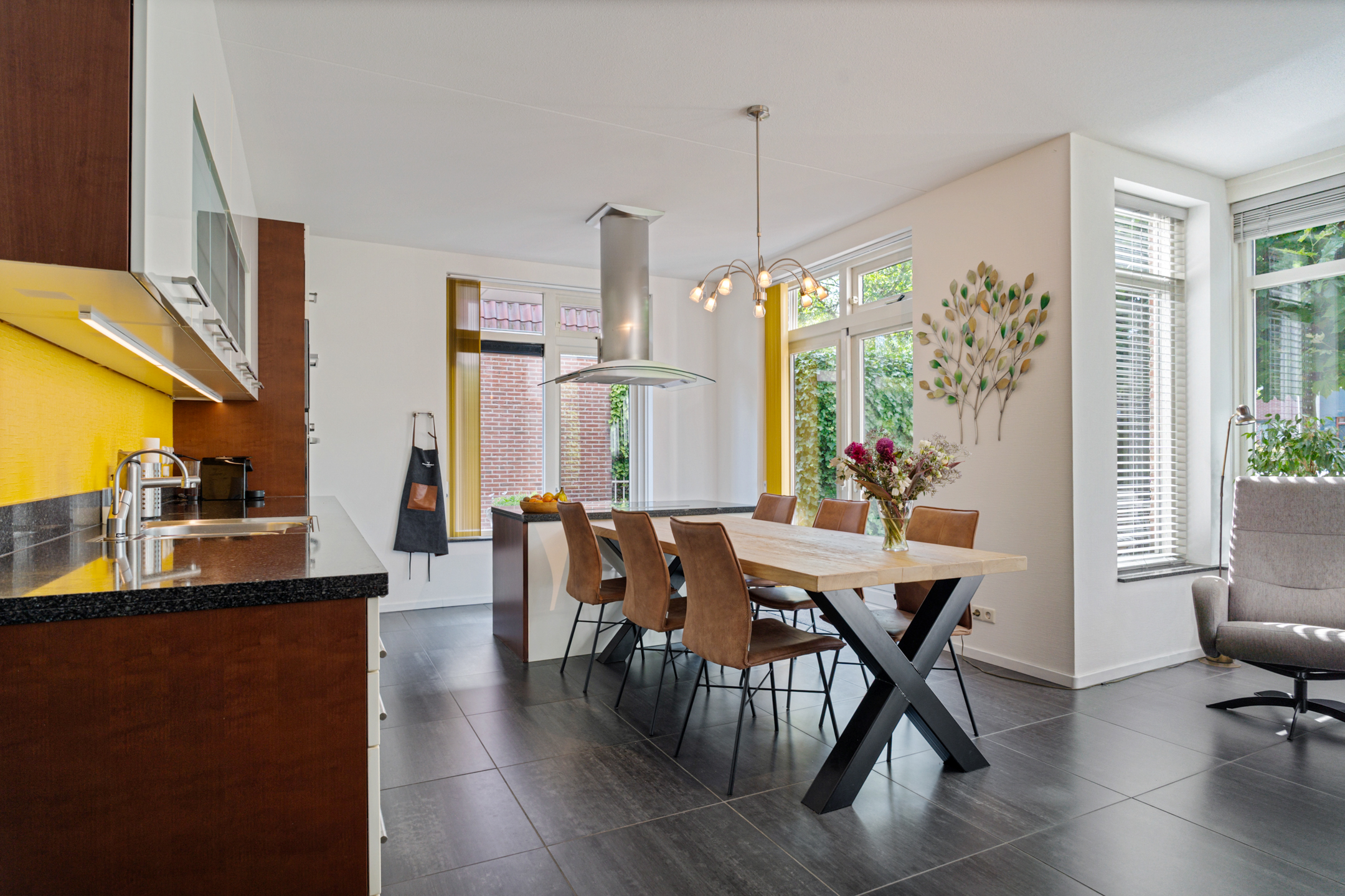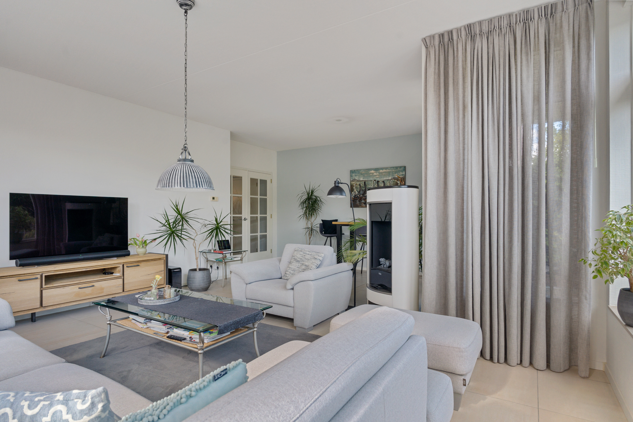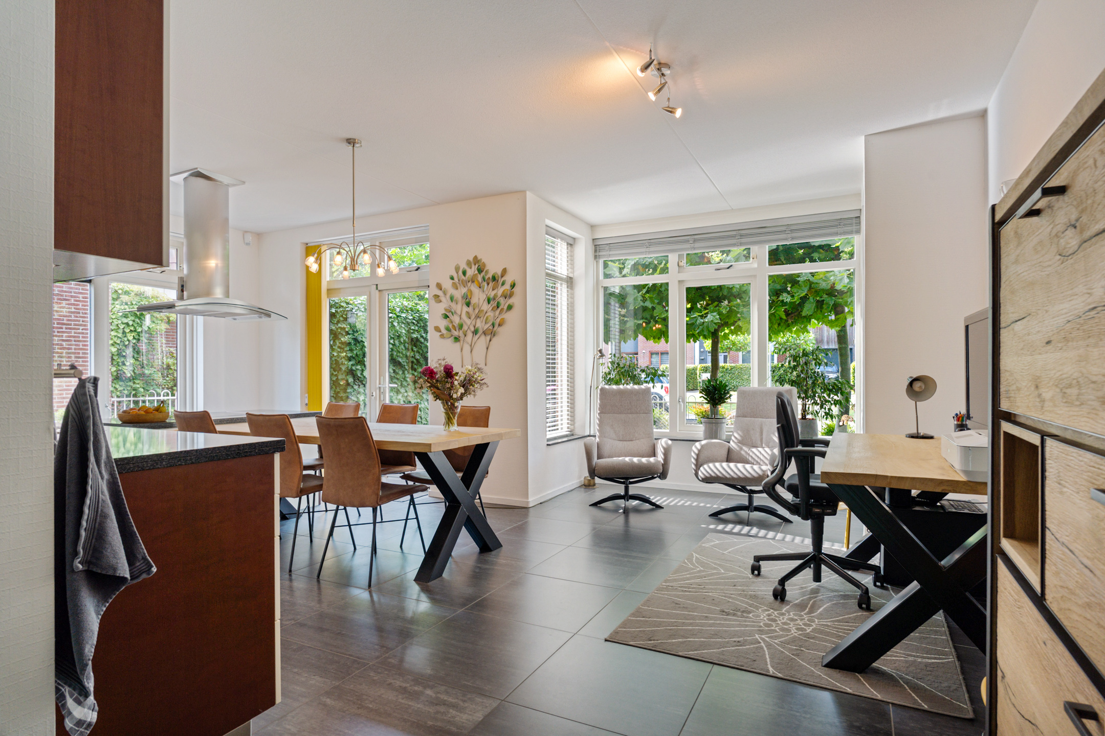 Links van de hal stap je de royale woonkeuken in. Dit is een fijne, lichte ruimte met veel ruimte voor een grote eettafel. Hier schuif je ’s ochtends aan voor een snelle koffie en je ’s avonds uitgebreid te tafelen met familie of vrienden. De praktische indeling en het daglicht zorgen ervoor dat dit al snel het hart van het huis wordt.