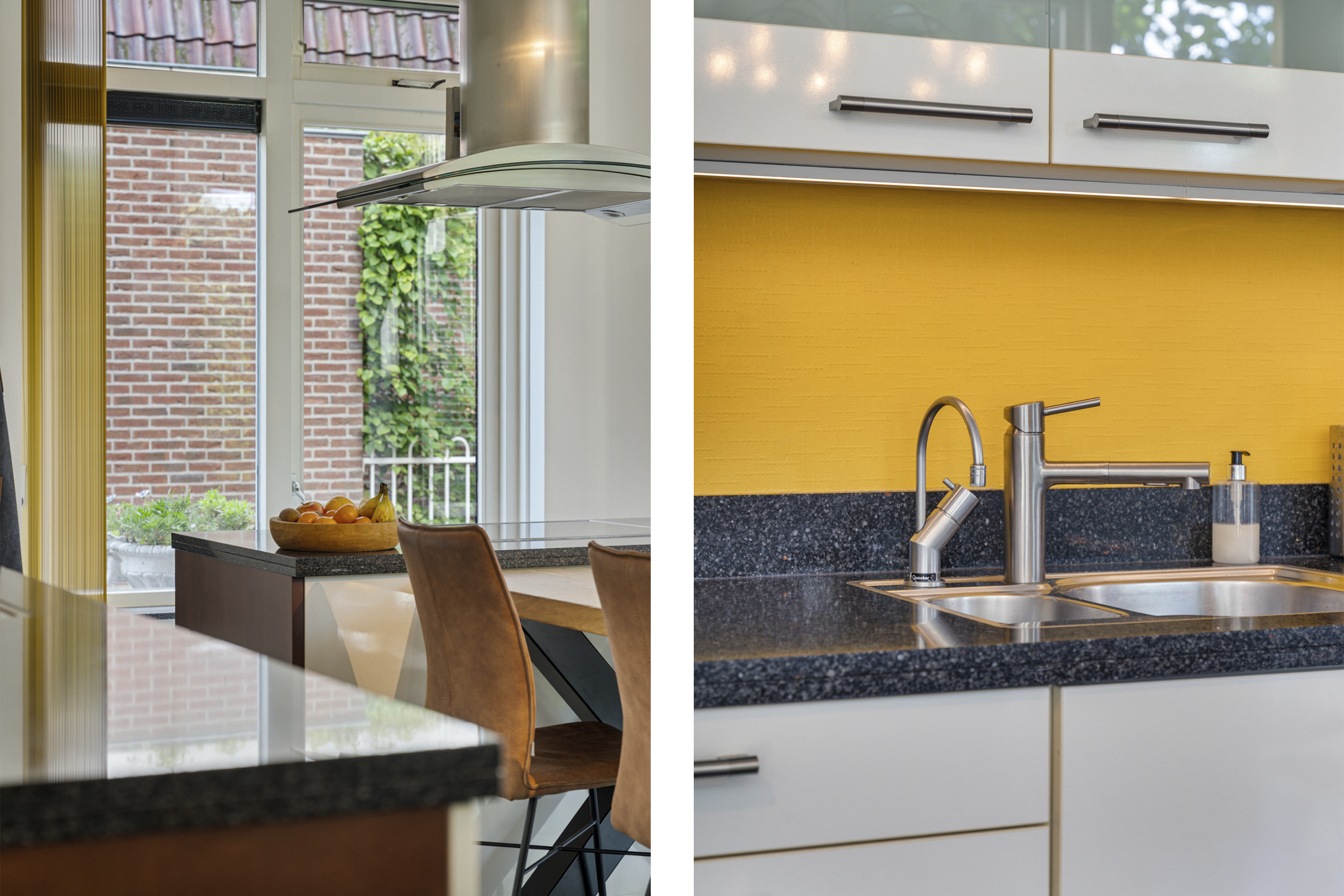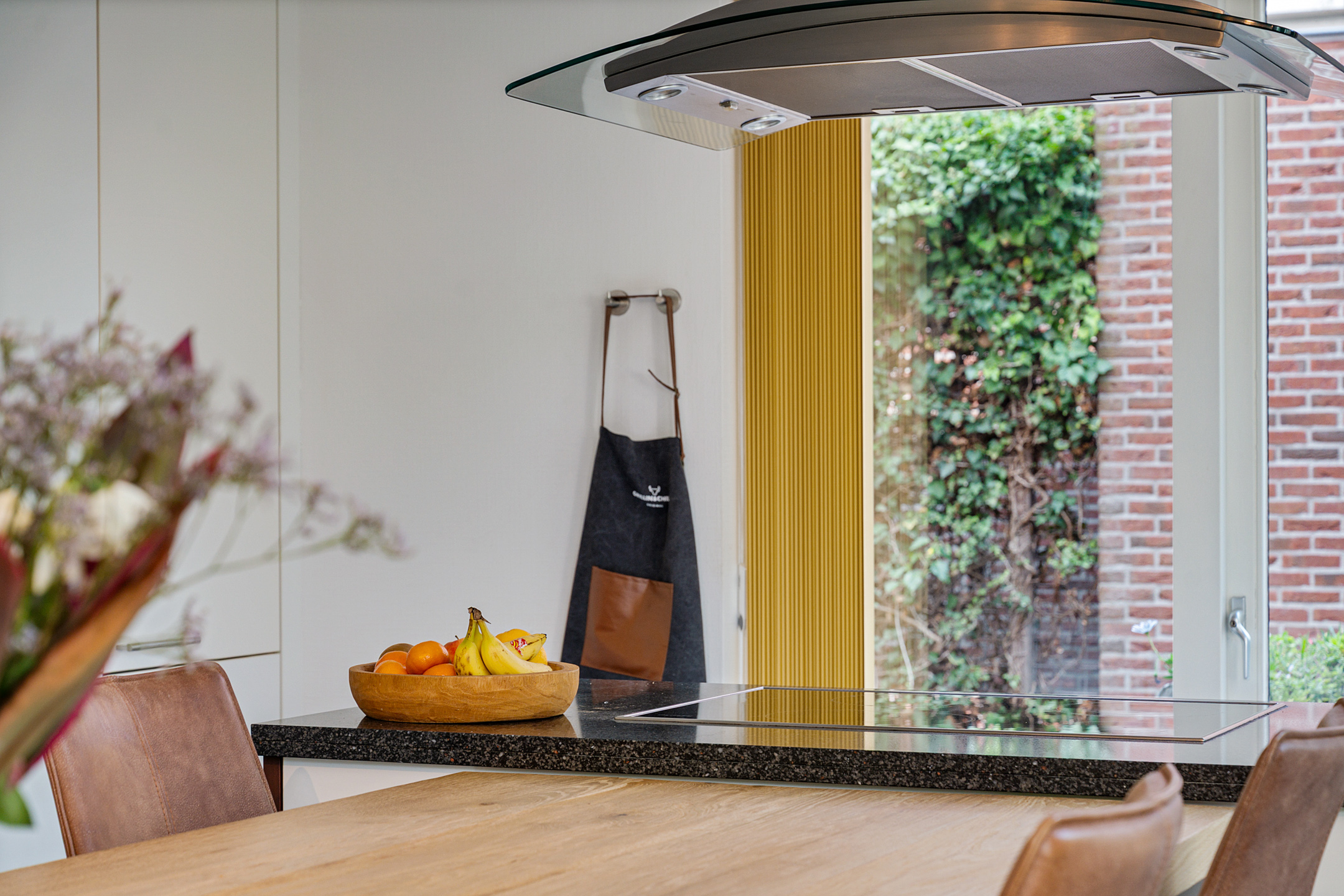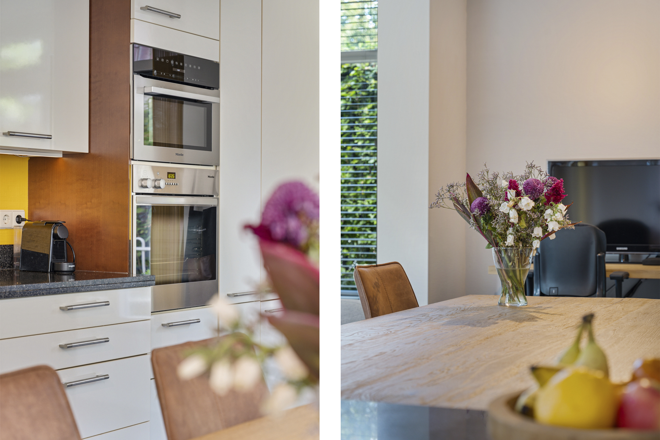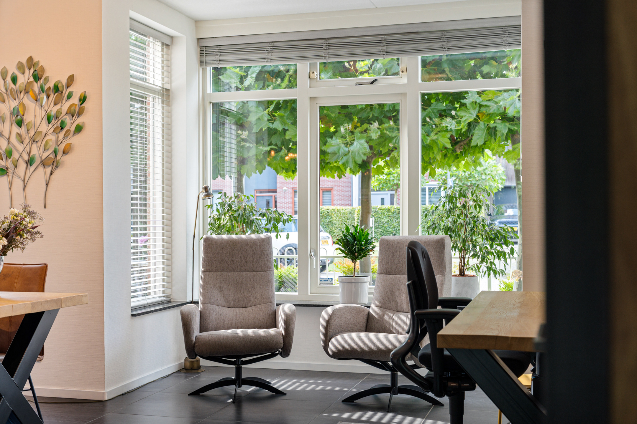 Links van de hal stap je de royale woonkeuken in. Dit is een fijne, lichte ruimte met veel ruimte voor een grote eettafel. Hier schuif je ’s ochtends aan voor een snelle koffie en je ’s avonds uitgebreid te tafelen met familie of vrienden. De praktische indeling en het daglicht zorgen ervoor dat dit al snel het hart van het huis wordt.