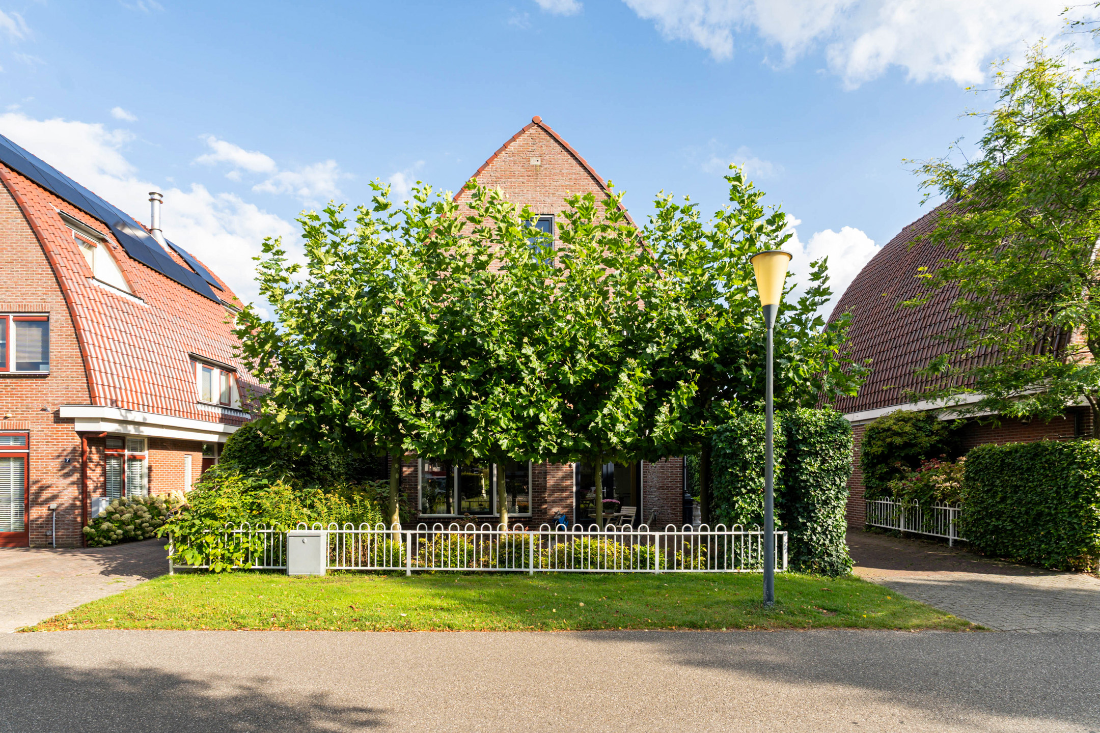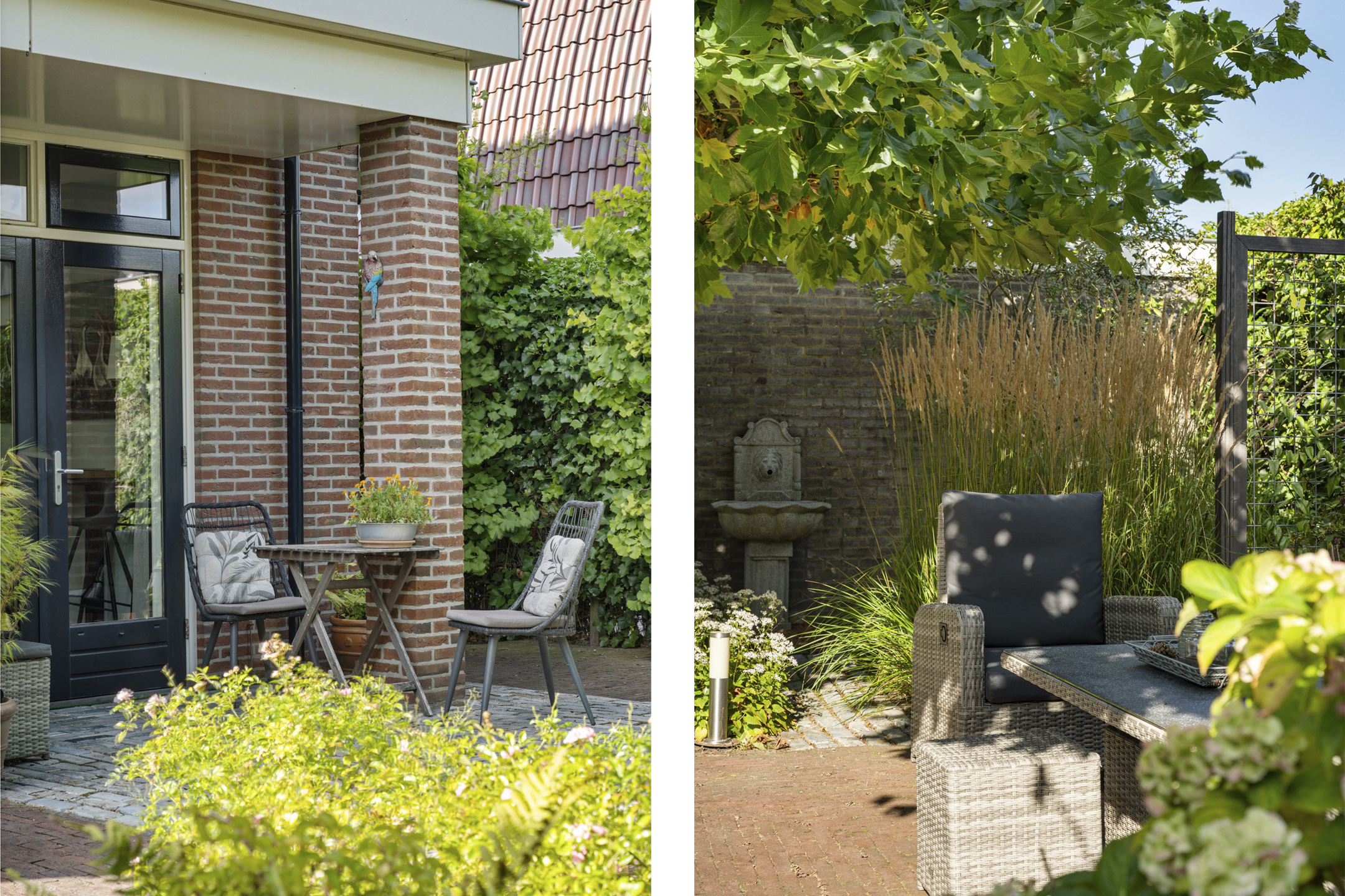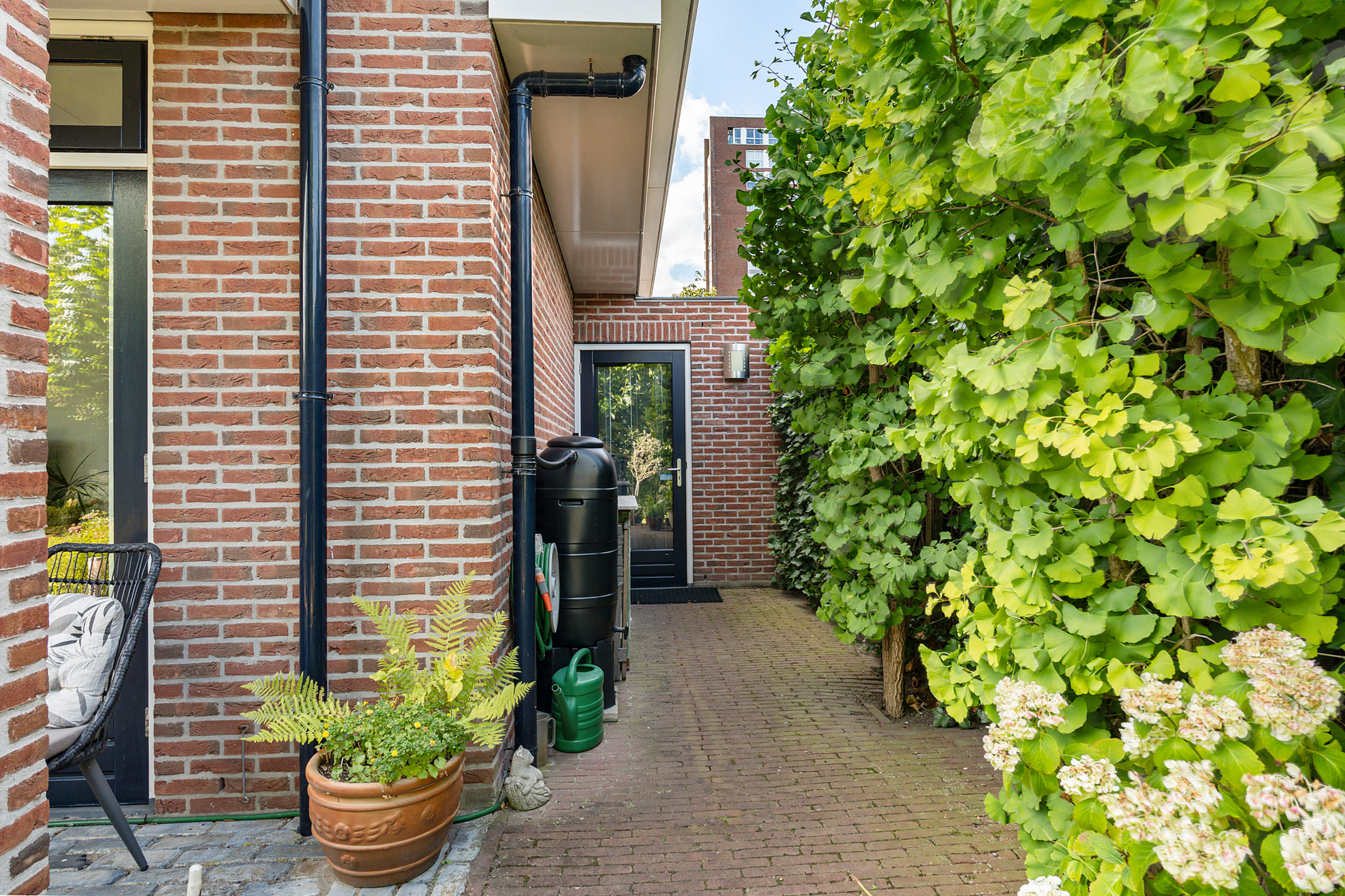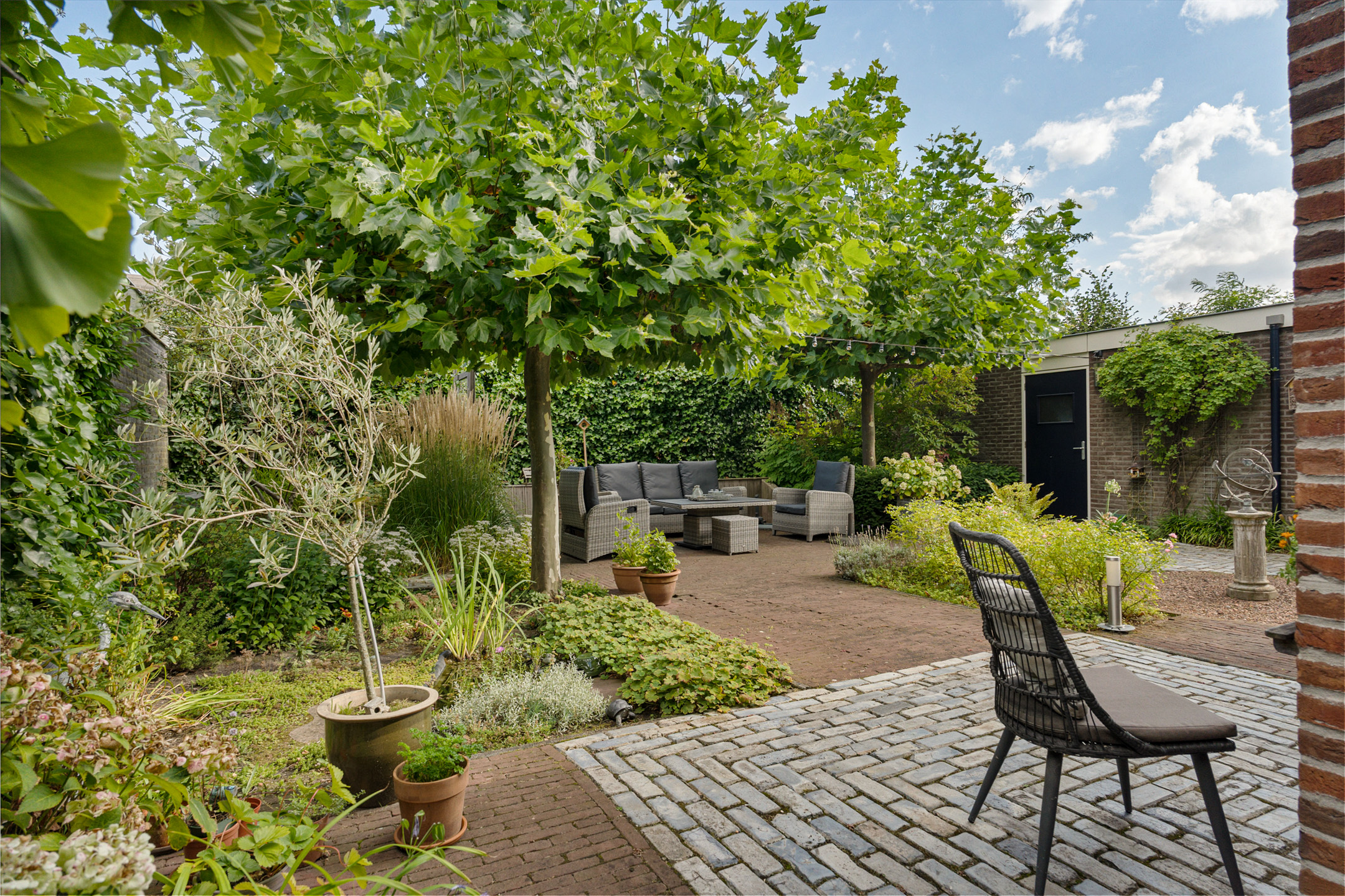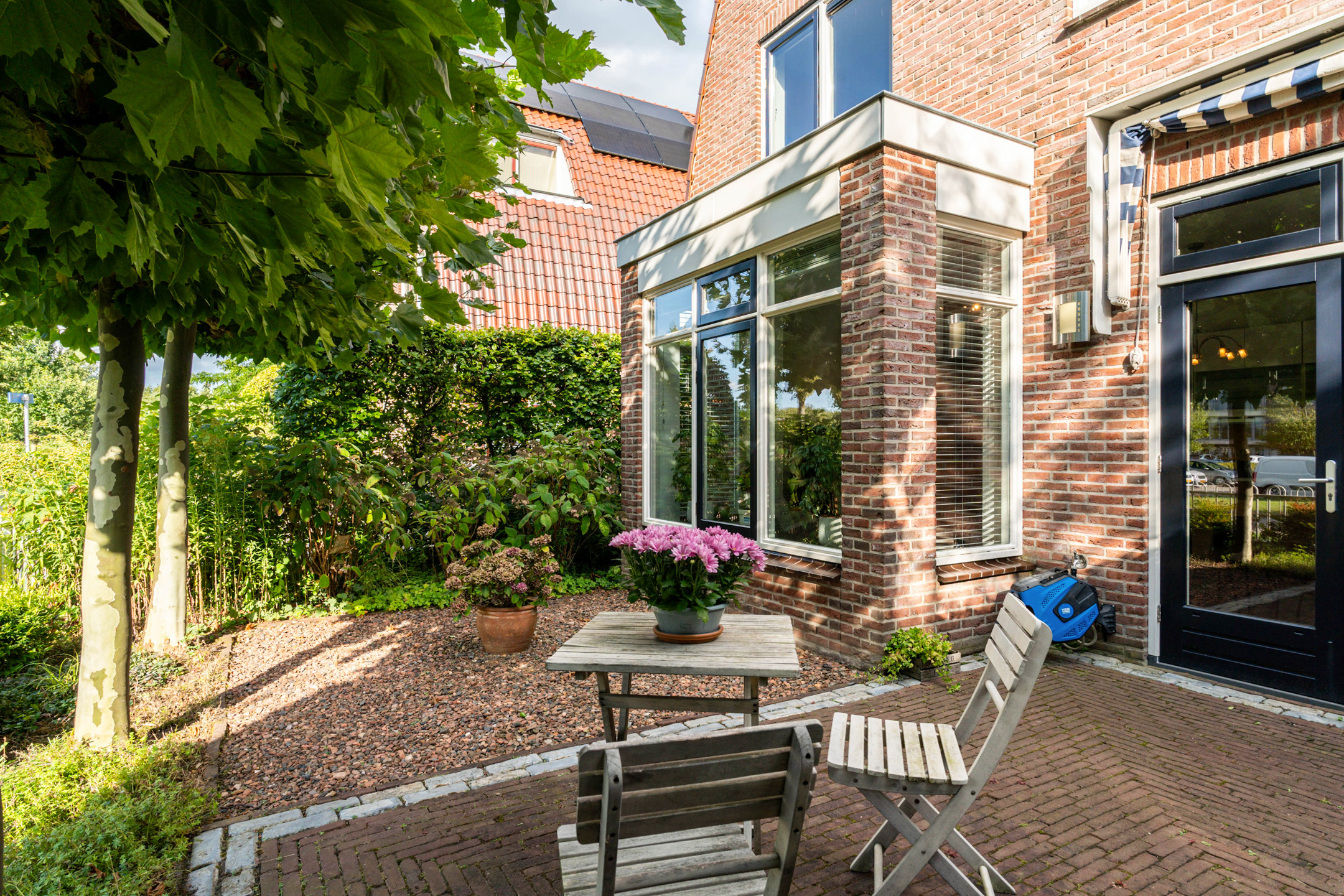 De speelse aanleg met bestrating, grind en borders maakt het geheel levendig en onderhoudsvriendelijk. Onder de leibomen creëer je een heerlijke loungeplek in de schaduw, terwijl het terras direct bij de woning perfect is voor een grote eettafel. Hier geniet je van lange zomeravonden en ontspannen weekenden in eigen tuin.