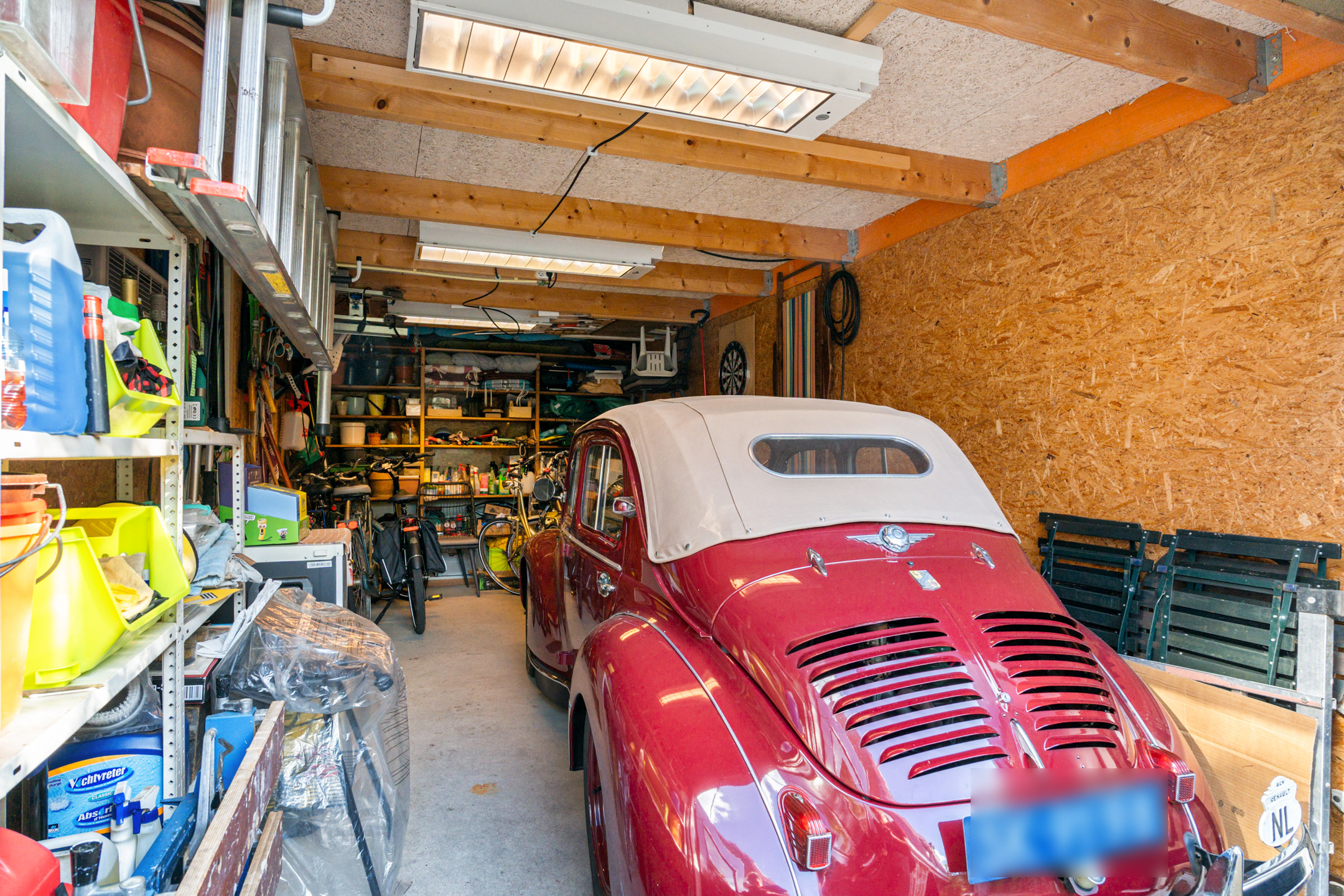 Achterin staat een praktische berging voor fietsen en tuingereedschap, zodat alles netjes opgeborgen is.
