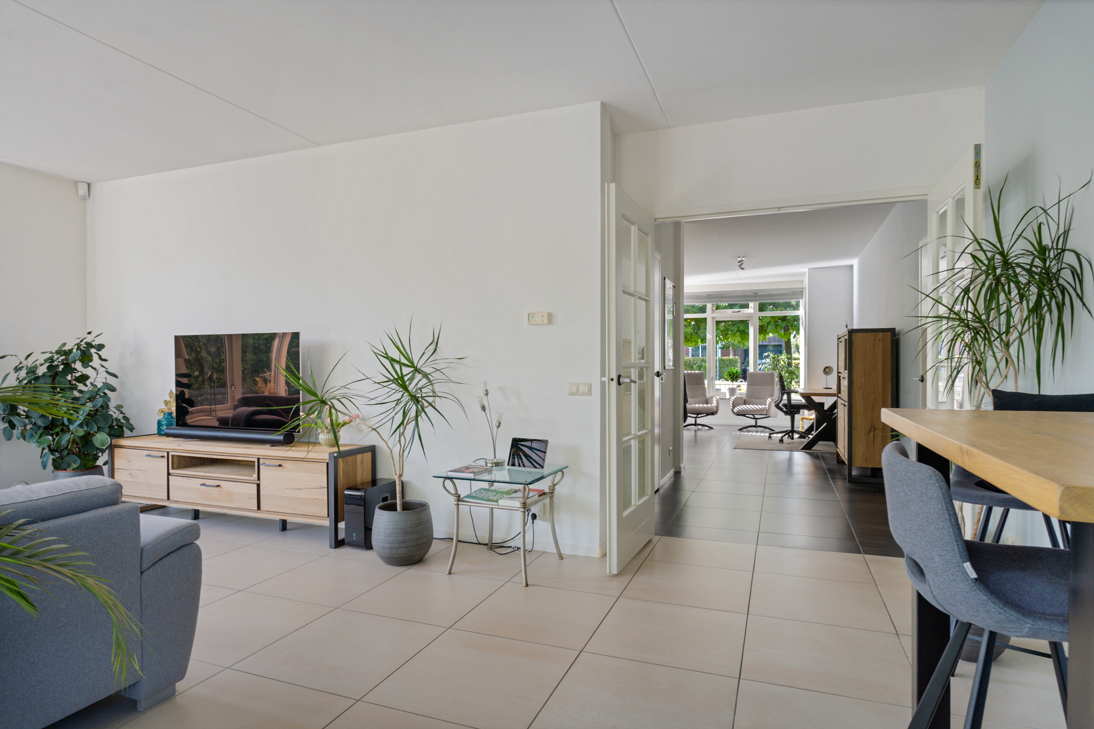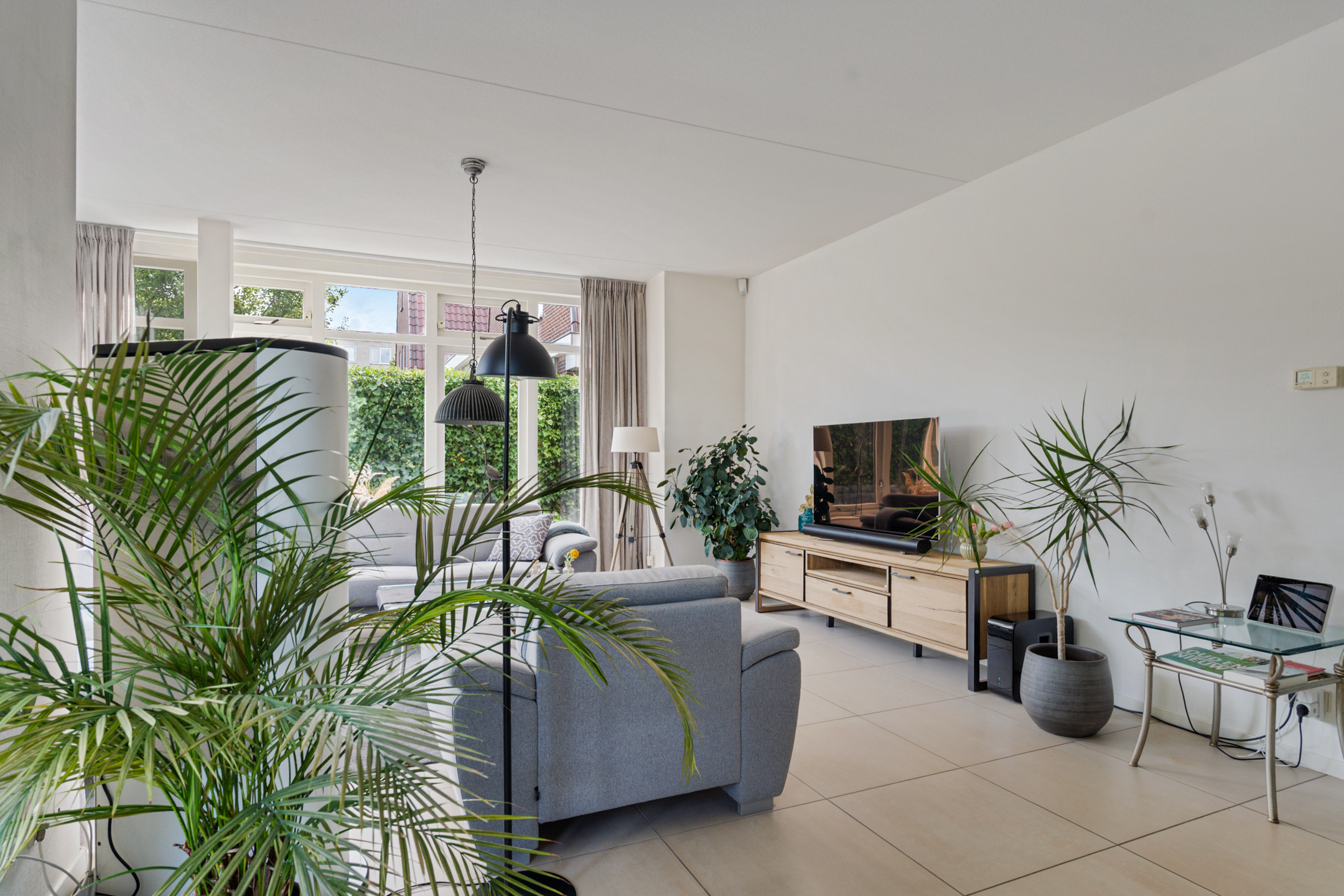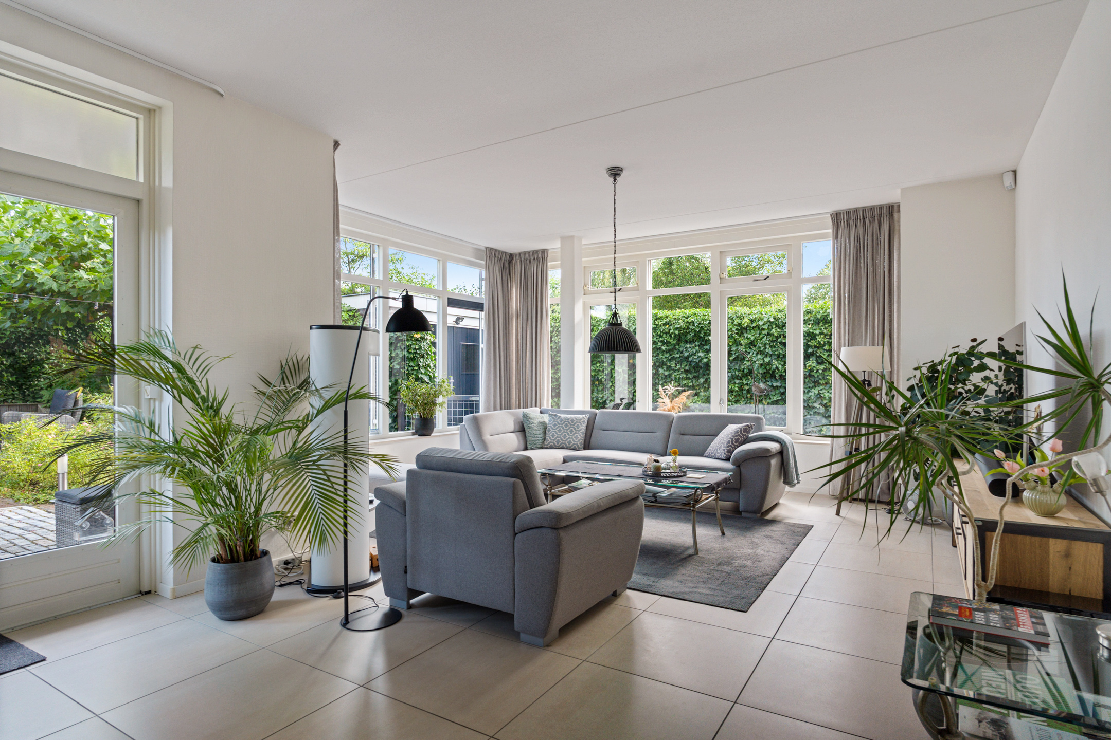 Aan de rechterzijde bevindt zich de woonkamer. Dankzij de grote raampartijen is het hier heerlijk licht en kijk je uit op de tuin. De ruimte biedt genoeg mogelijkheden voor een comfortabele zithoek, met daarnaast plek voor bijvoorbeeld een speelhoek of werkplek. Via de deur naar buiten bereik je de tuin, welke fraai is aangelegd.