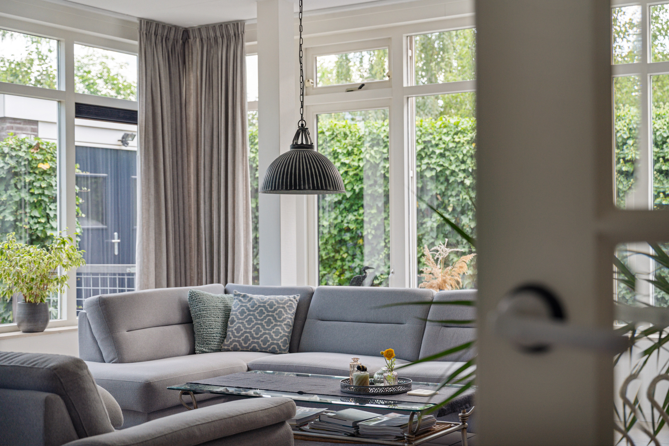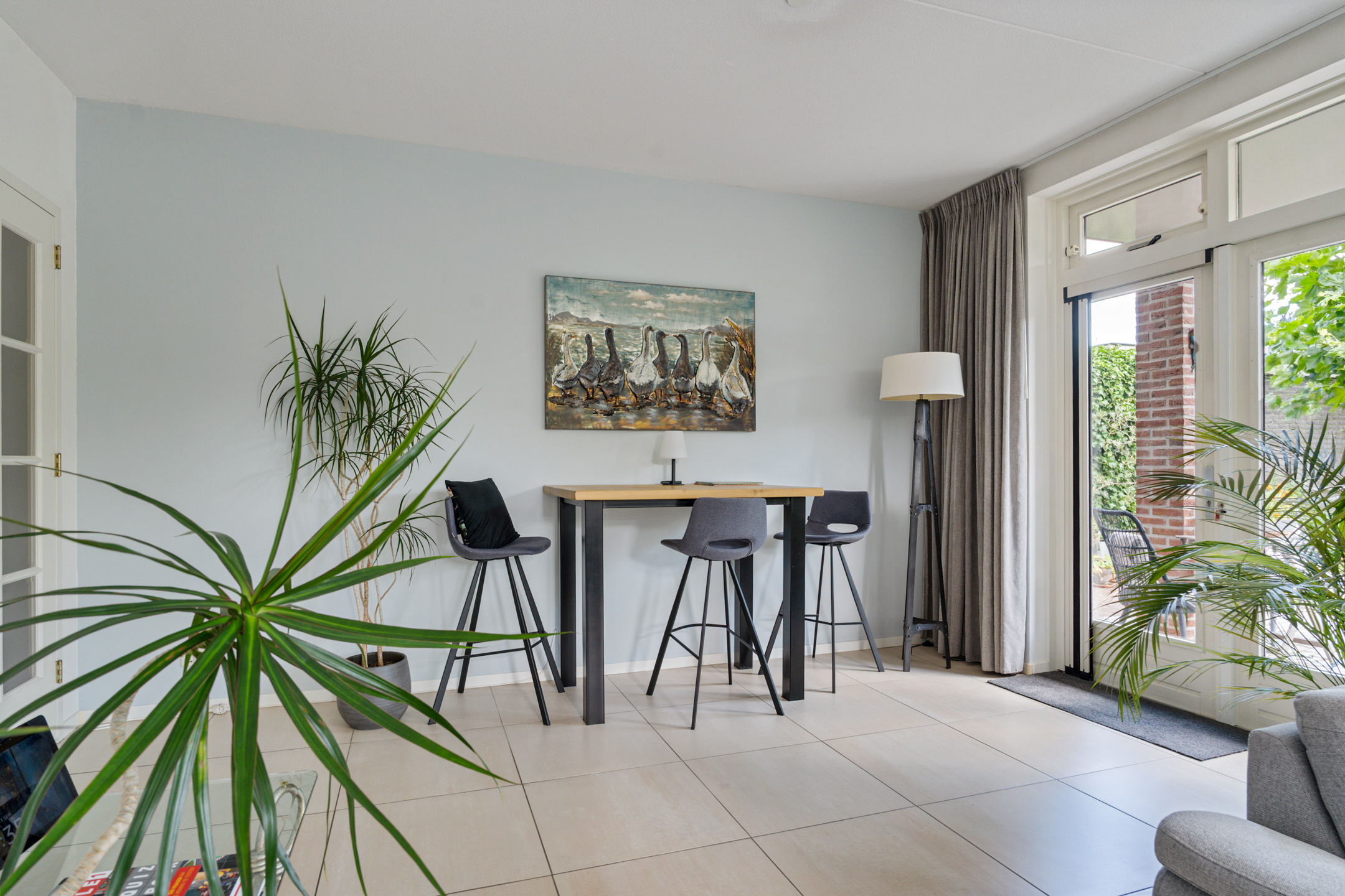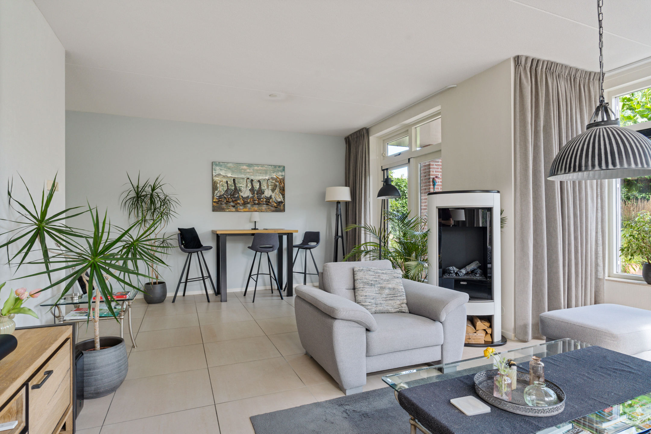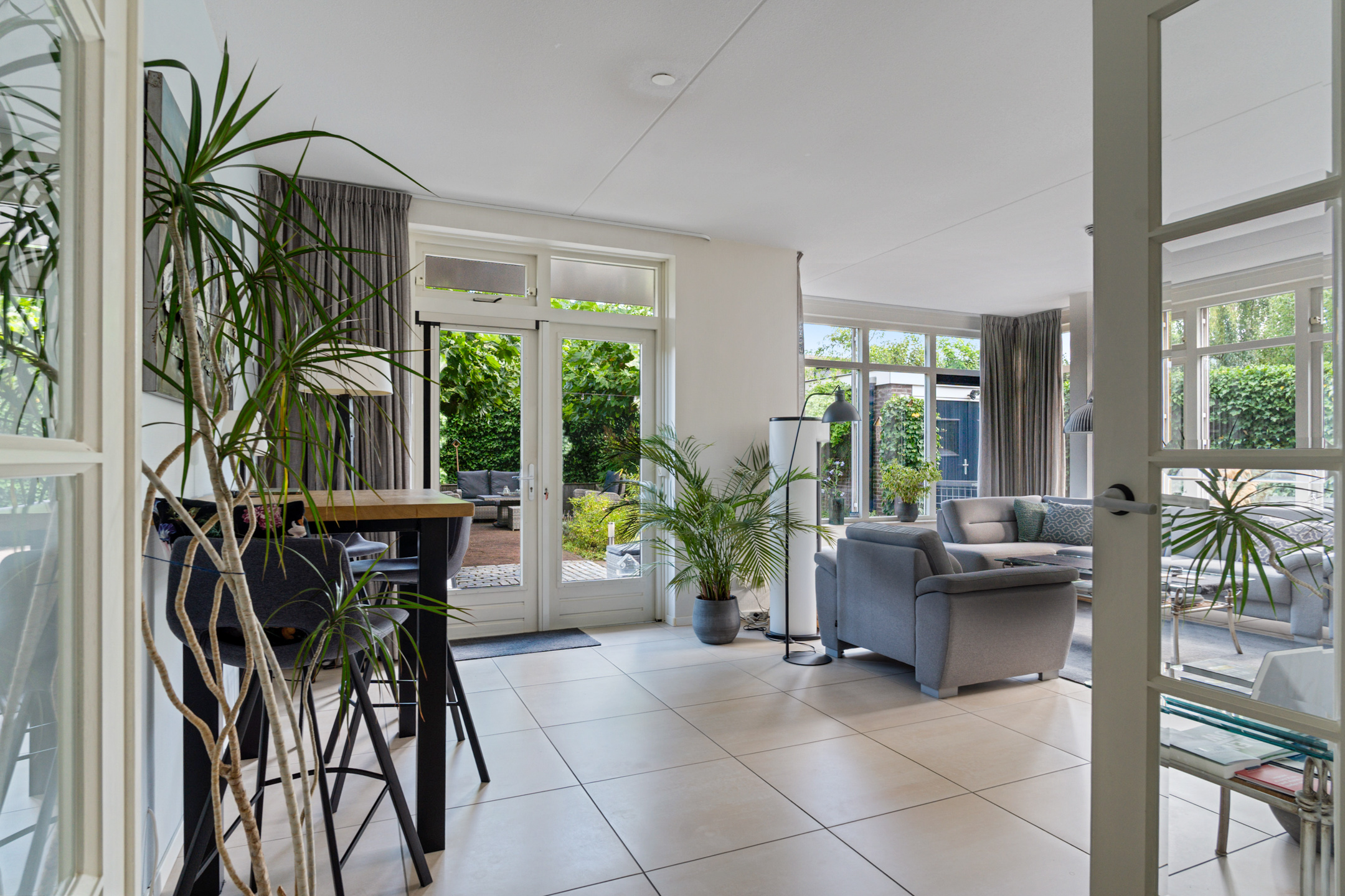 Aan de rechterzijde bevindt zich de woonkamer. Dankzij de grote raampartijen is het hier heerlijk licht en kijk je uit op de tuin. De ruimte biedt genoeg mogelijkheden voor een comfortabele zithoek, met daarnaast plek voor bijvoorbeeld een speelhoek of werkplek. Via de deur naar buiten bereik je de tuin, welke fraai is aangelegd.