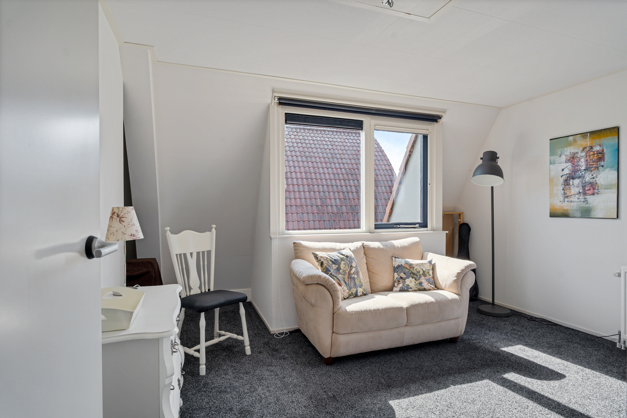 Aan de linkerzijde bevindt zich een ruime slaapkamer met prettig daglicht. Hier realiseer je eenvoudig een volwaardige slaapkamer, maar ook als werk- of hobbyruimte is dit een fijne plek.