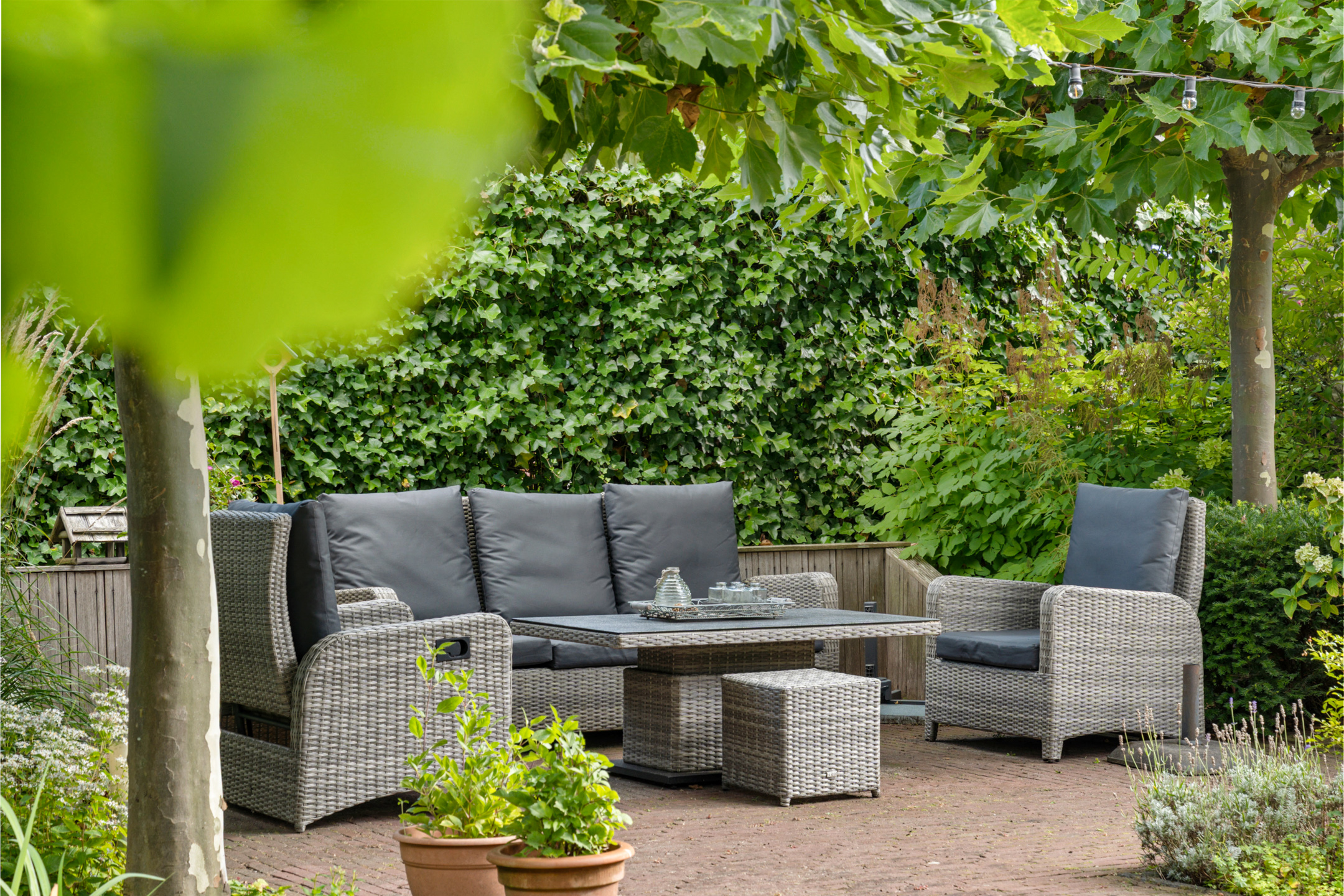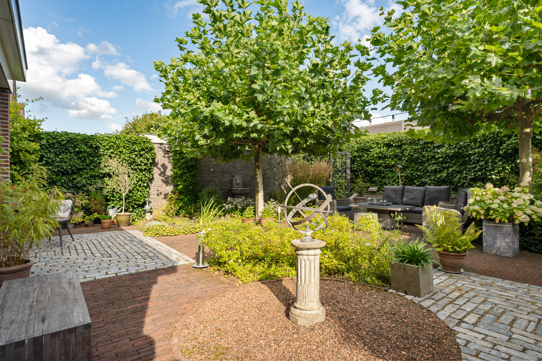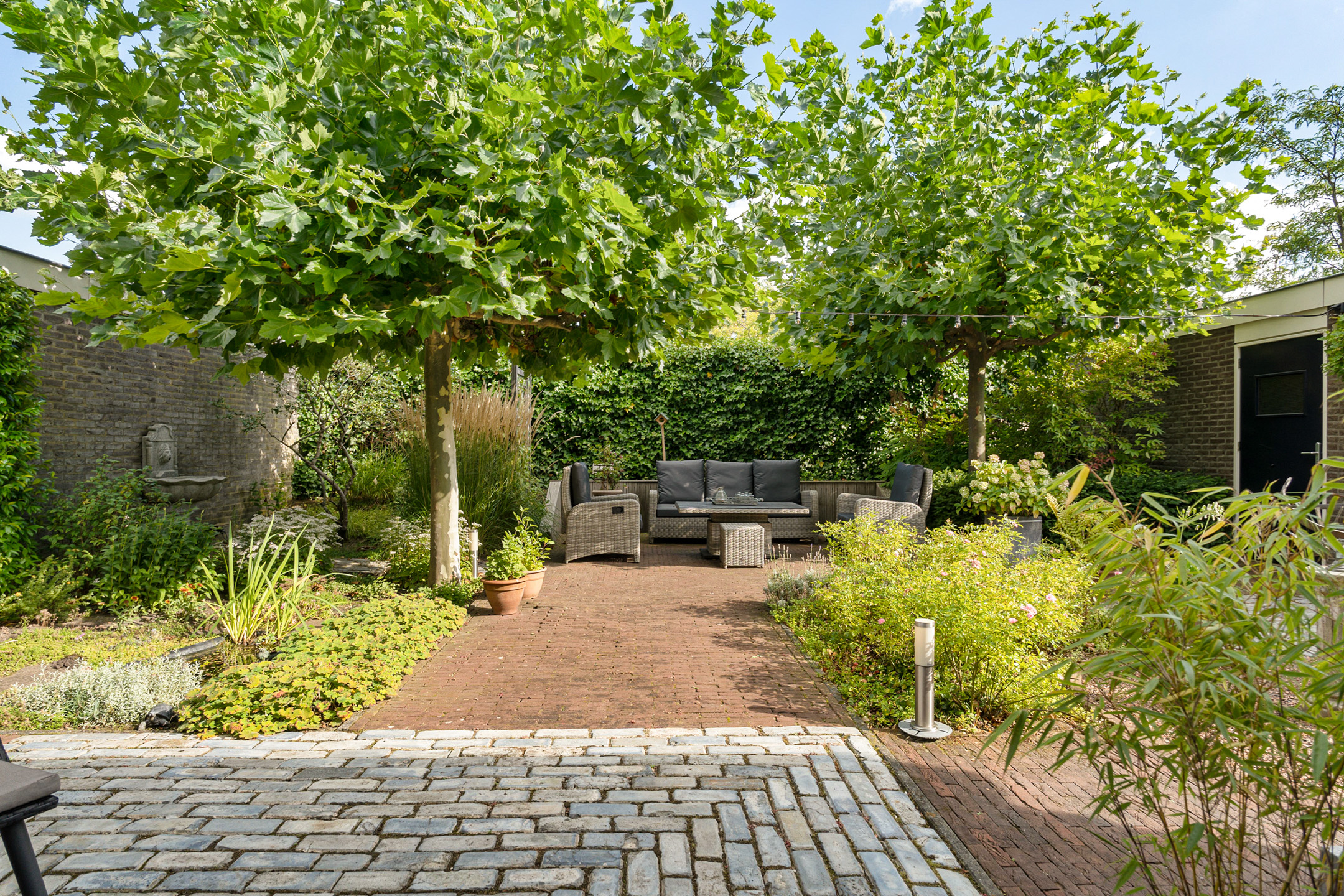 De tuin is een groene en sfeervolle plek waar je volop privacy ervaart. De volwassen beplanting en leibomen zorgen voor een beschutte ligging en een prettige sfeer.