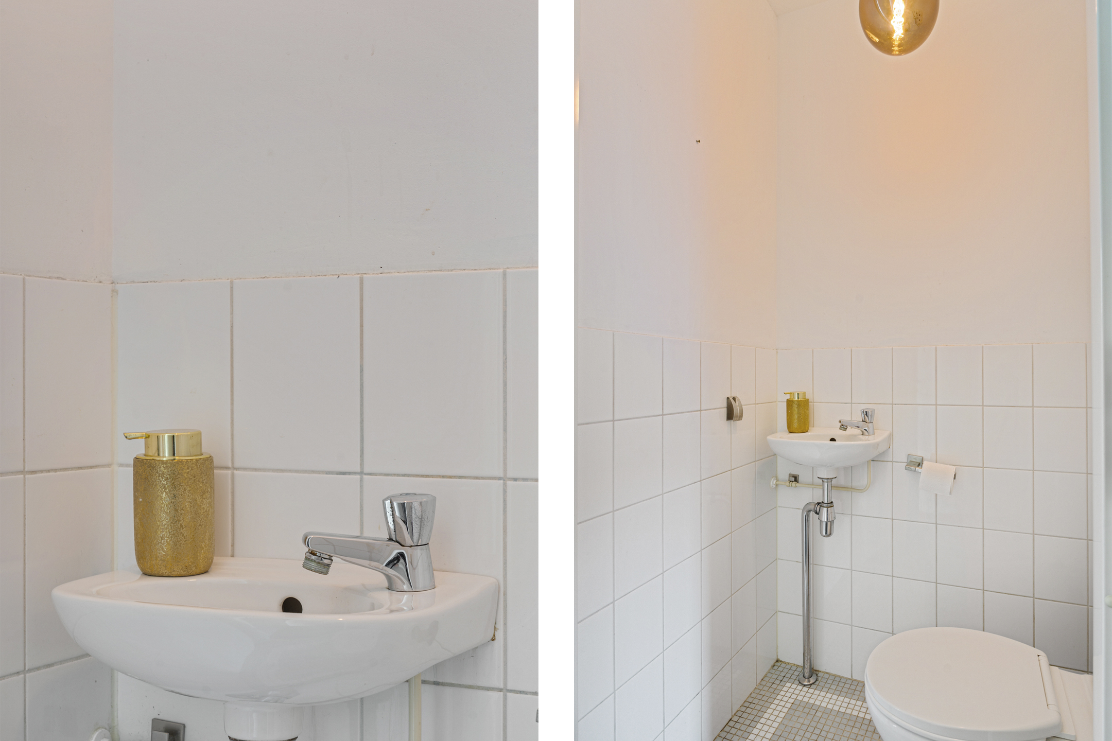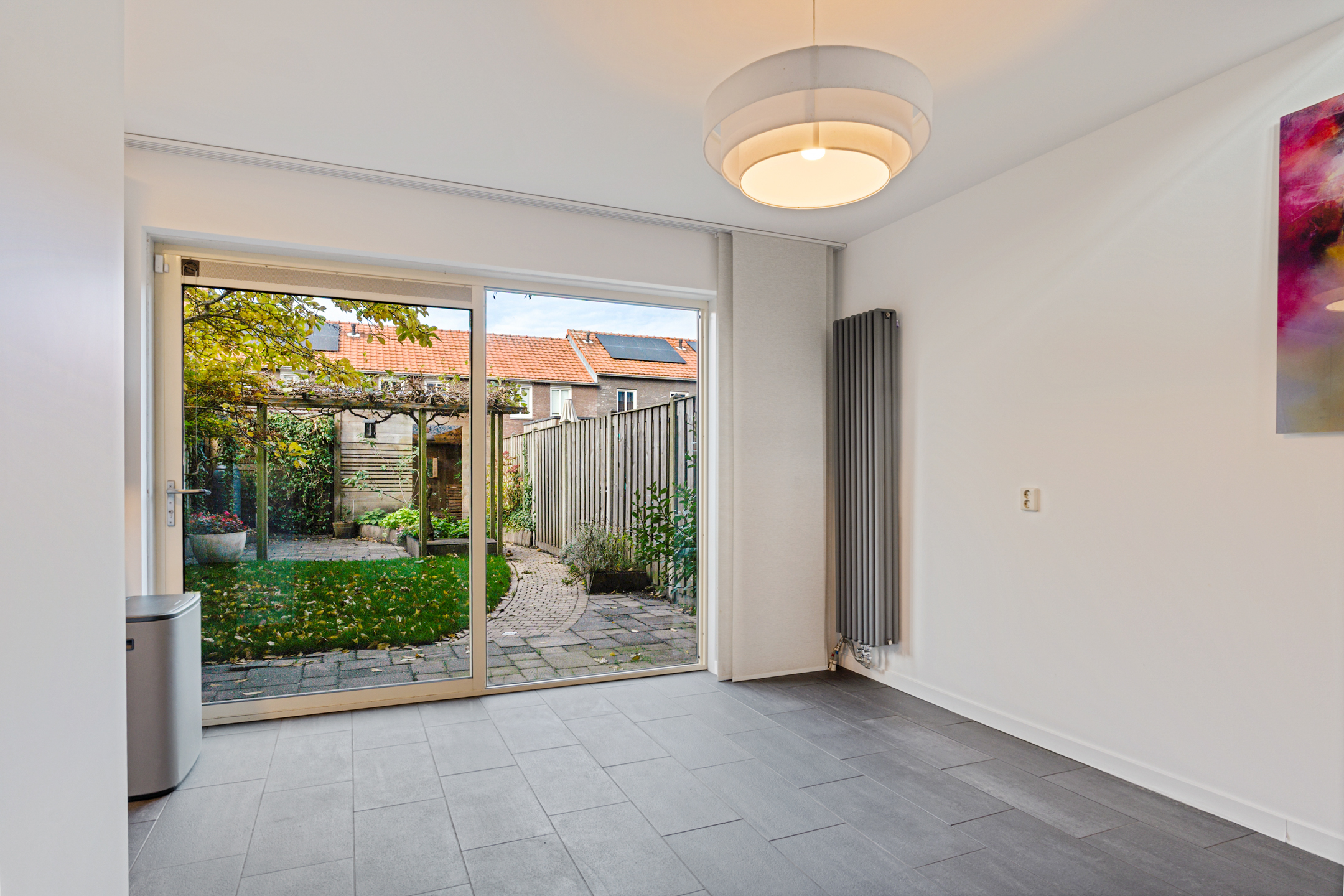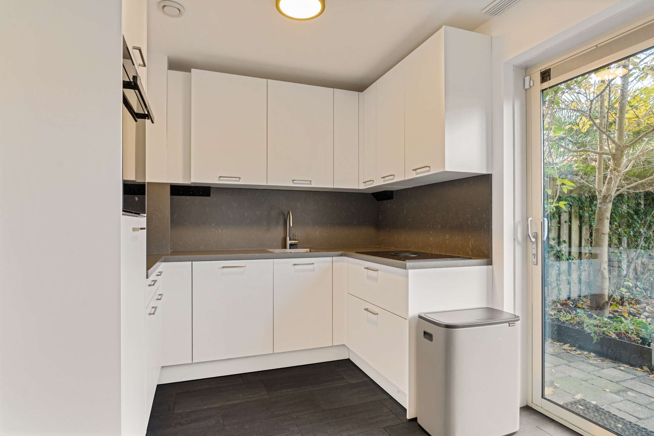 Via de beschutte voortuin bereik je de entree van de woning. De hal is voorzien van de meterkast (8 groepen) en een separaat toilet met fonteintje. Aan de voorzijde ligt een slaapkamer die ook uitstekend te gebruiken is als werk- of kantoorruimte. Aan de achterzijde bevindt zich de ruime woonkeuken in U-opstelling, uitgerust met een inductiekookplaat, afzuigkap, combimagnetron, vaatwasser en een losstaande koel-/vriescombinatie. Via de schuifpui stap je de meer dan 15 meter diepe achtertuin in, voorzien van een overkapping, berging en achterom.