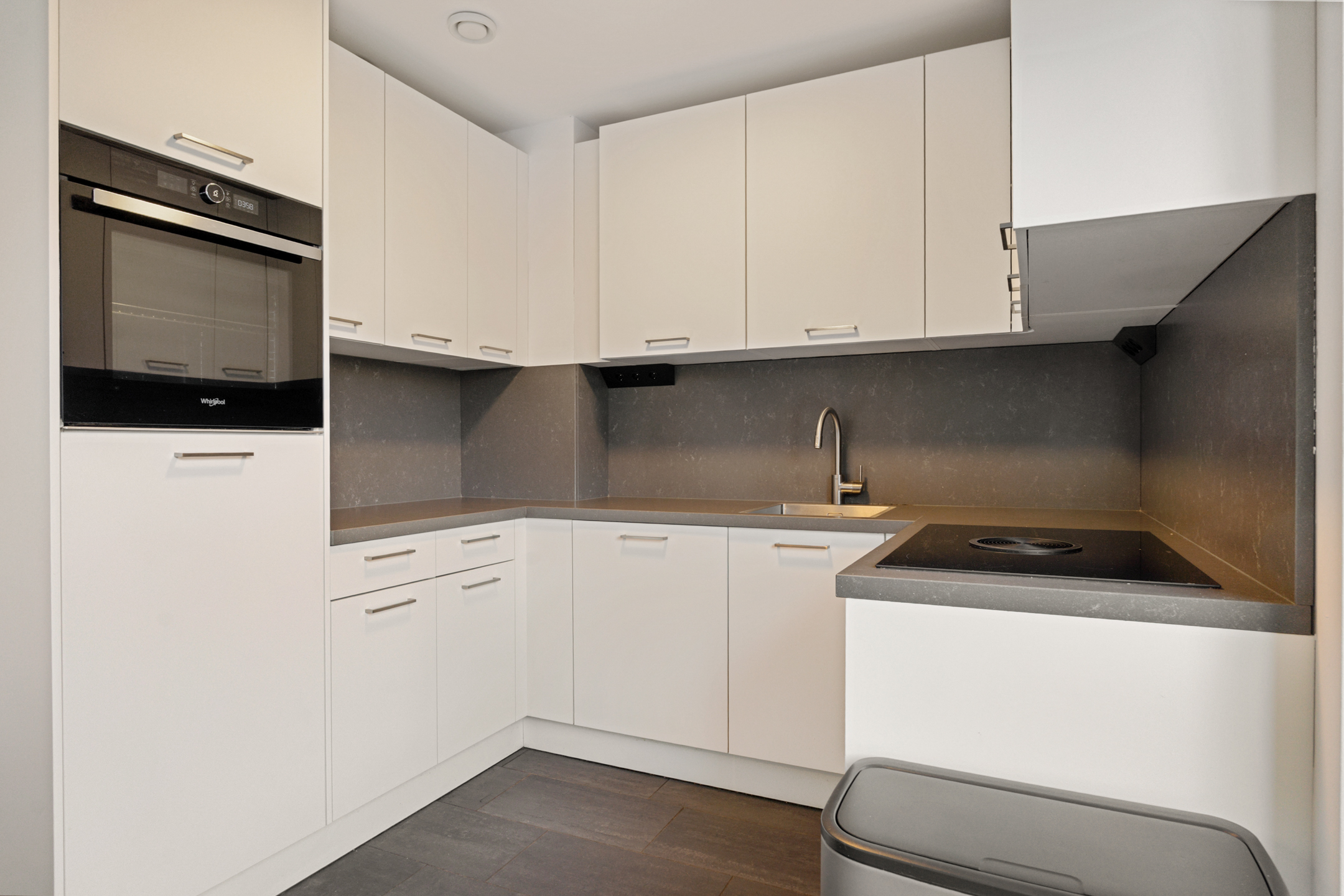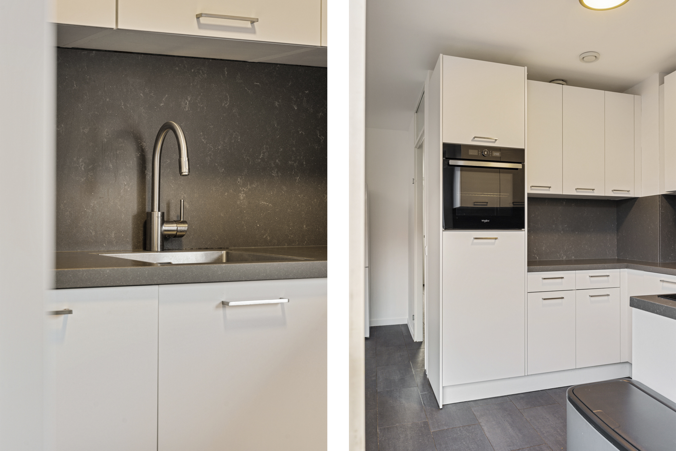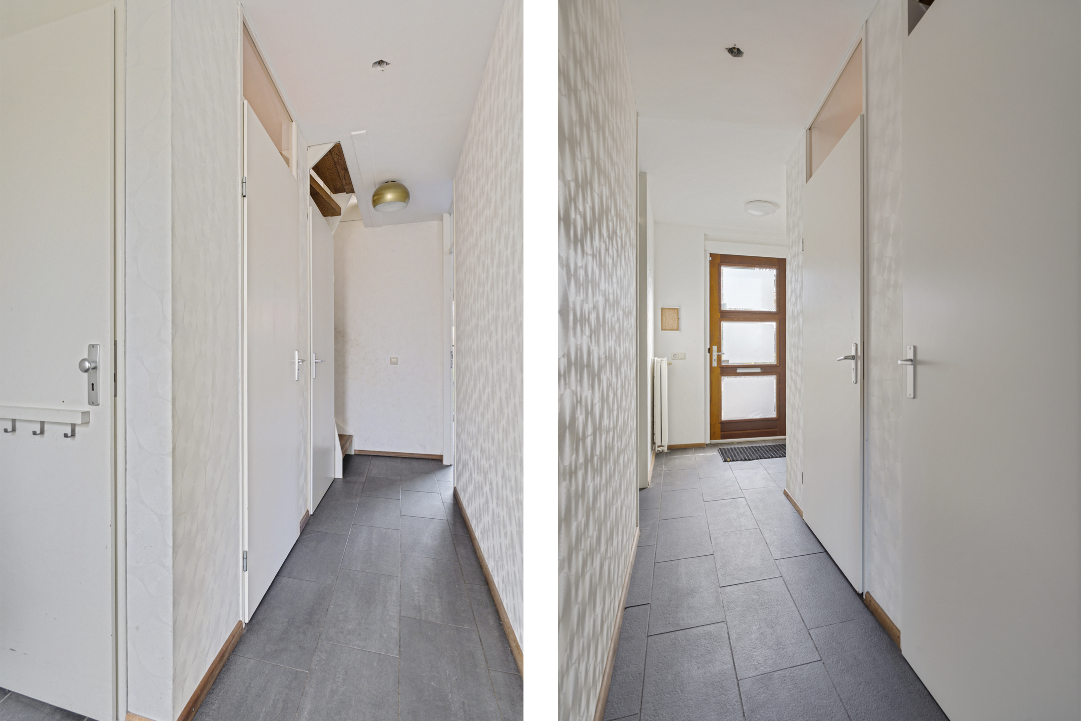 Via de beschutte voortuin bereik je de entree van de woning. De hal is voorzien van de meterkast (8 groepen) en een separaat toilet met fonteintje. Aan de voorzijde ligt een slaapkamer die ook uitstekend te gebruiken is als werk- of kantoorruimte. Aan de achterzijde bevindt zich de ruime woonkeuken in U-opstelling, uitgerust met een inductiekookplaat, afzuigkap, combimagnetron, vaatwasser en een losstaande koel-/vriescombinatie. Via de schuifpui stap je de meer dan 15 meter diepe achtertuin in, voorzien van een overkapping, berging en achterom.