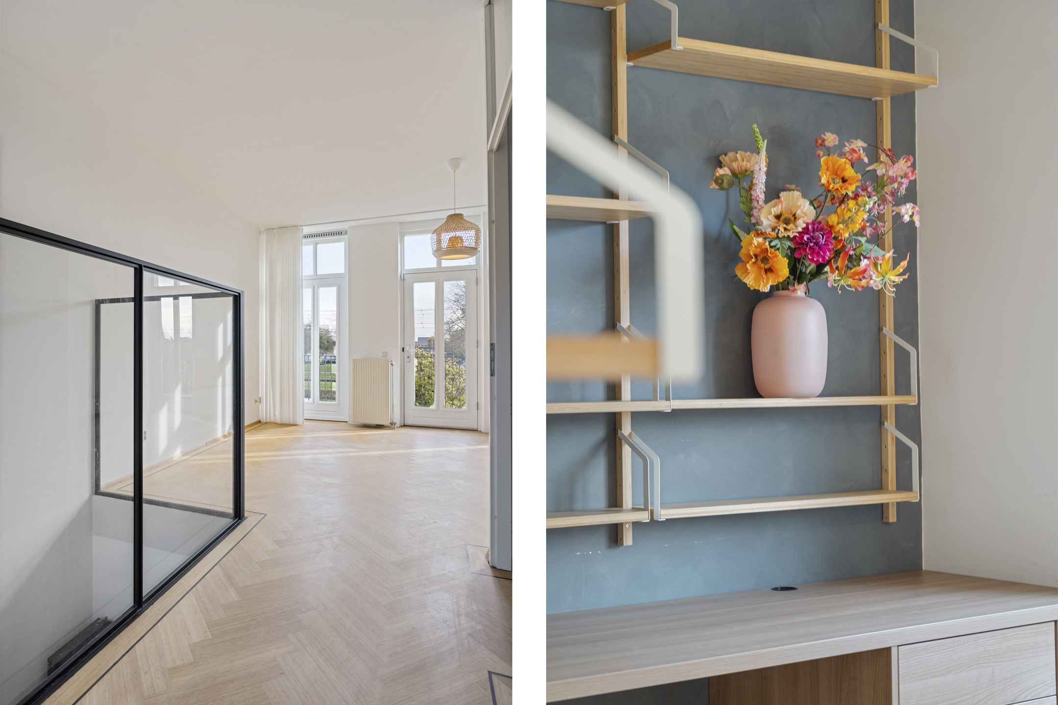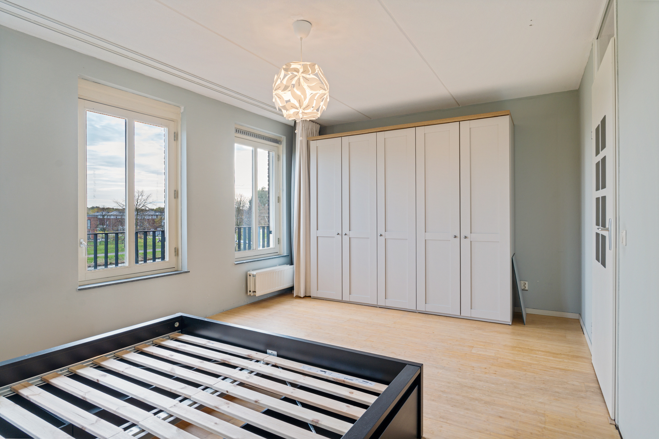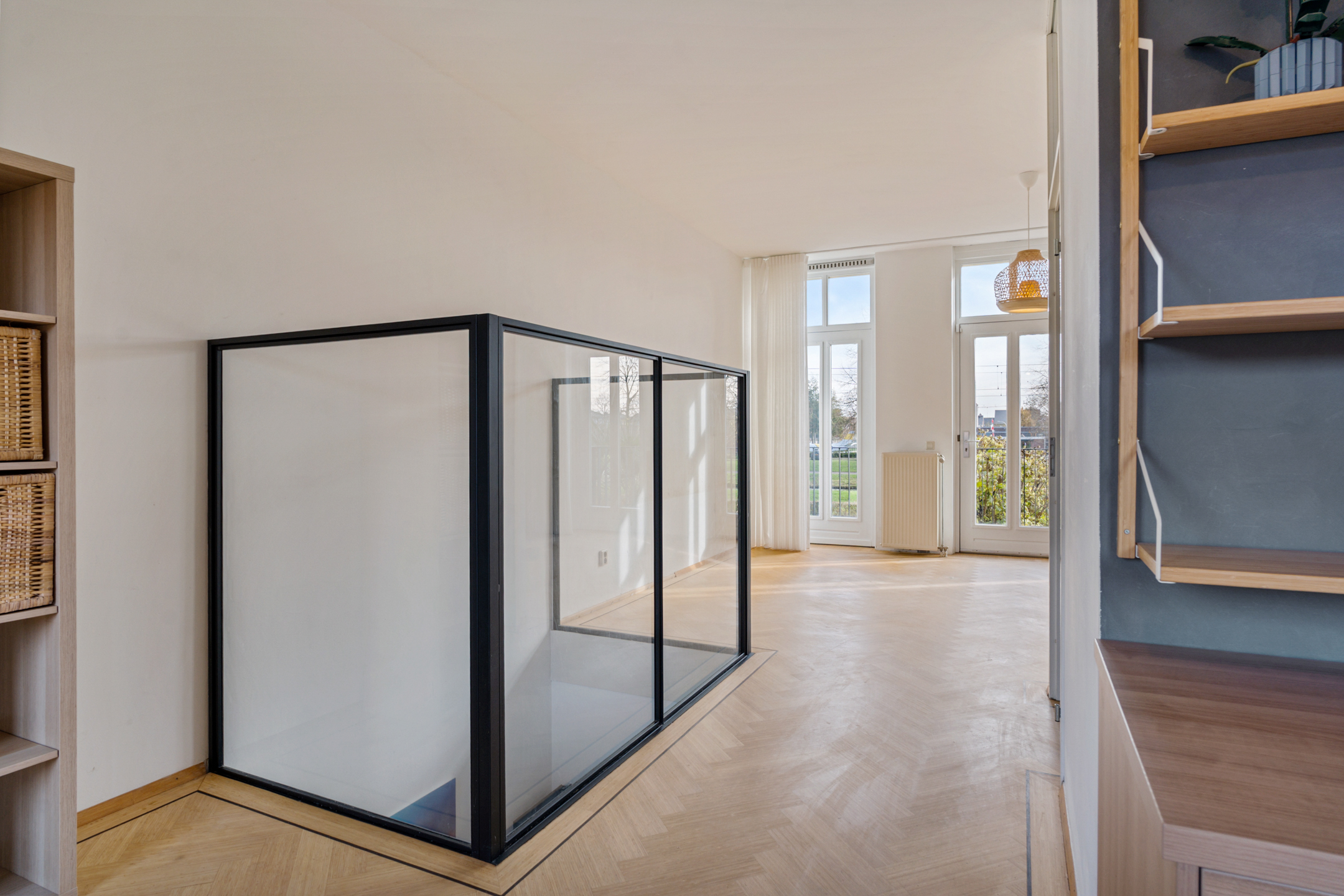 Het glas zorgt voor een open en ruimtelijk gevoel, terwijl het de verdieping een bijzonder karakter geeft. De houten visgraat vloer met band en bies versterkt de warme uitstraling van de kamer. Aan de voorzijde bevindt zich bovendien een compact balkon en geniet je van een vrij uitzicht.