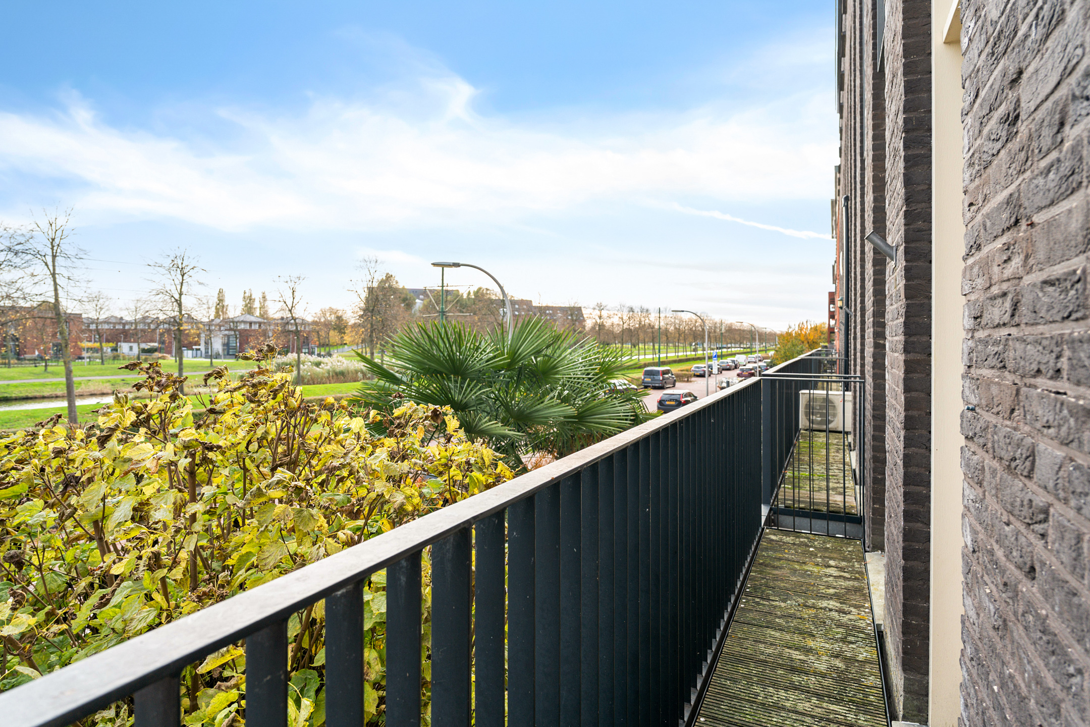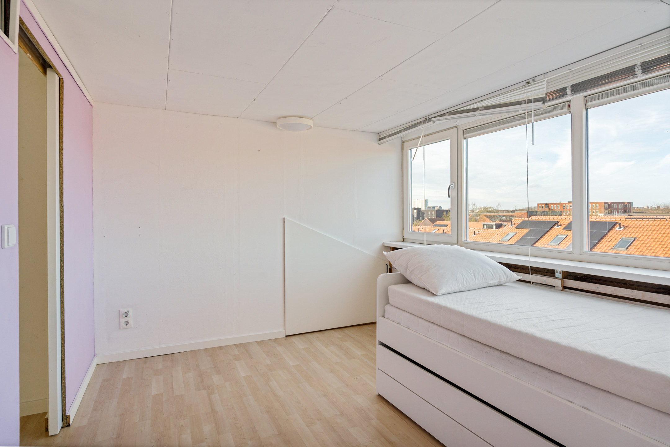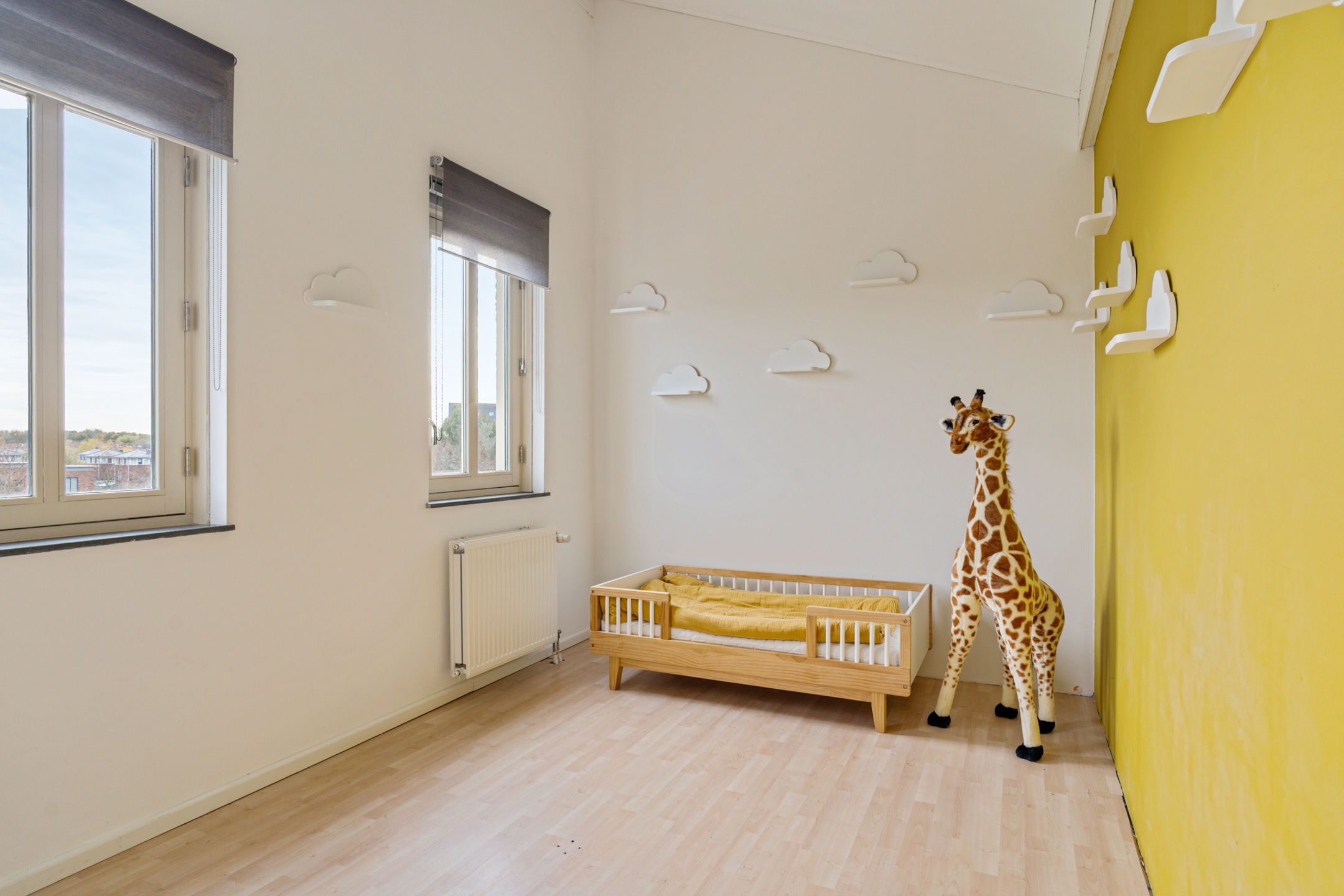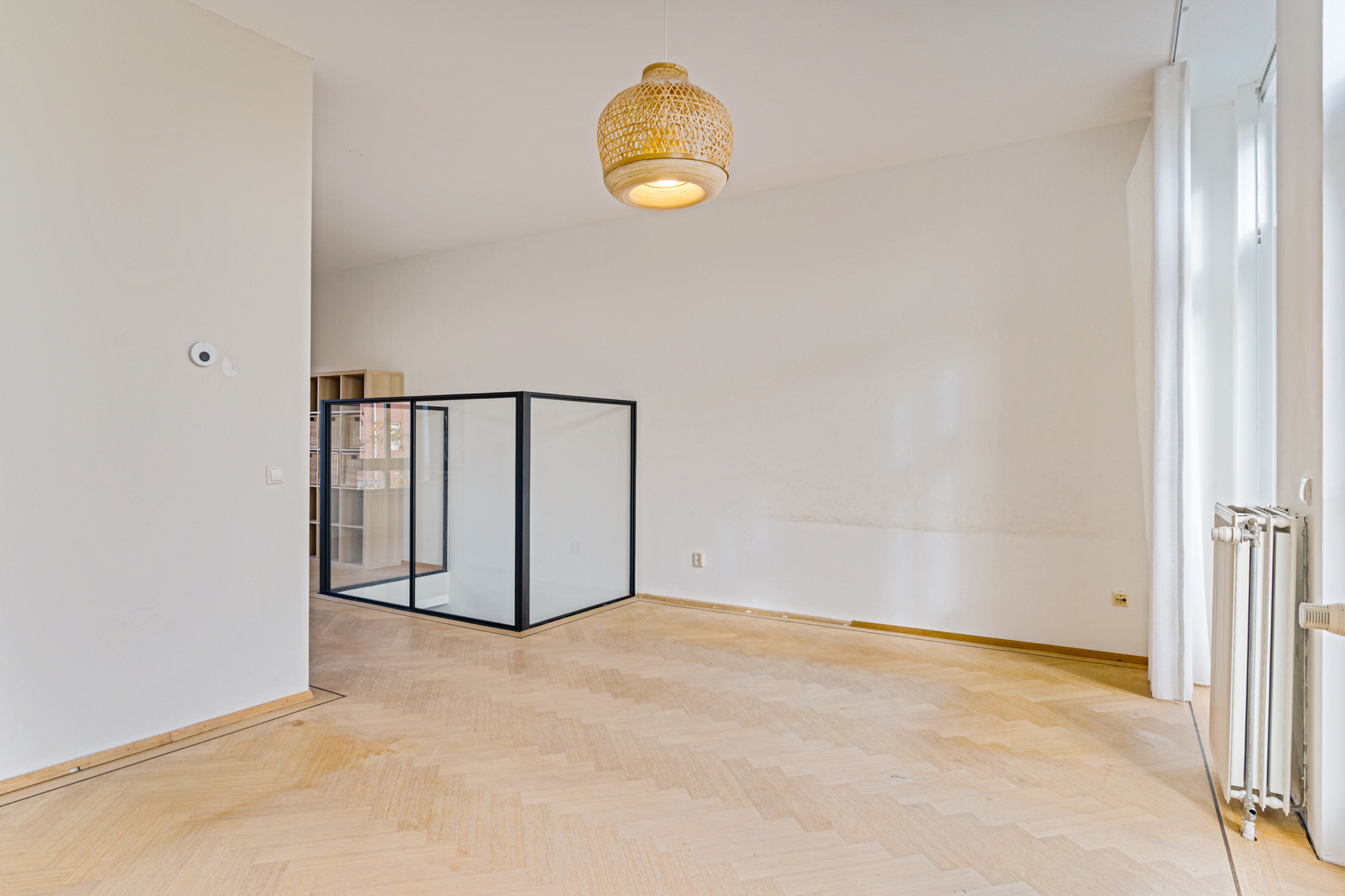 Het glas zorgt voor een open en ruimtelijk gevoel, terwijl het de verdieping een bijzonder karakter geeft. De houten visgraat vloer met band en bies versterkt de warme uitstraling van de kamer. Aan de voorzijde bevindt zich bovendien een compact balkon en geniet je van een vrij uitzicht.