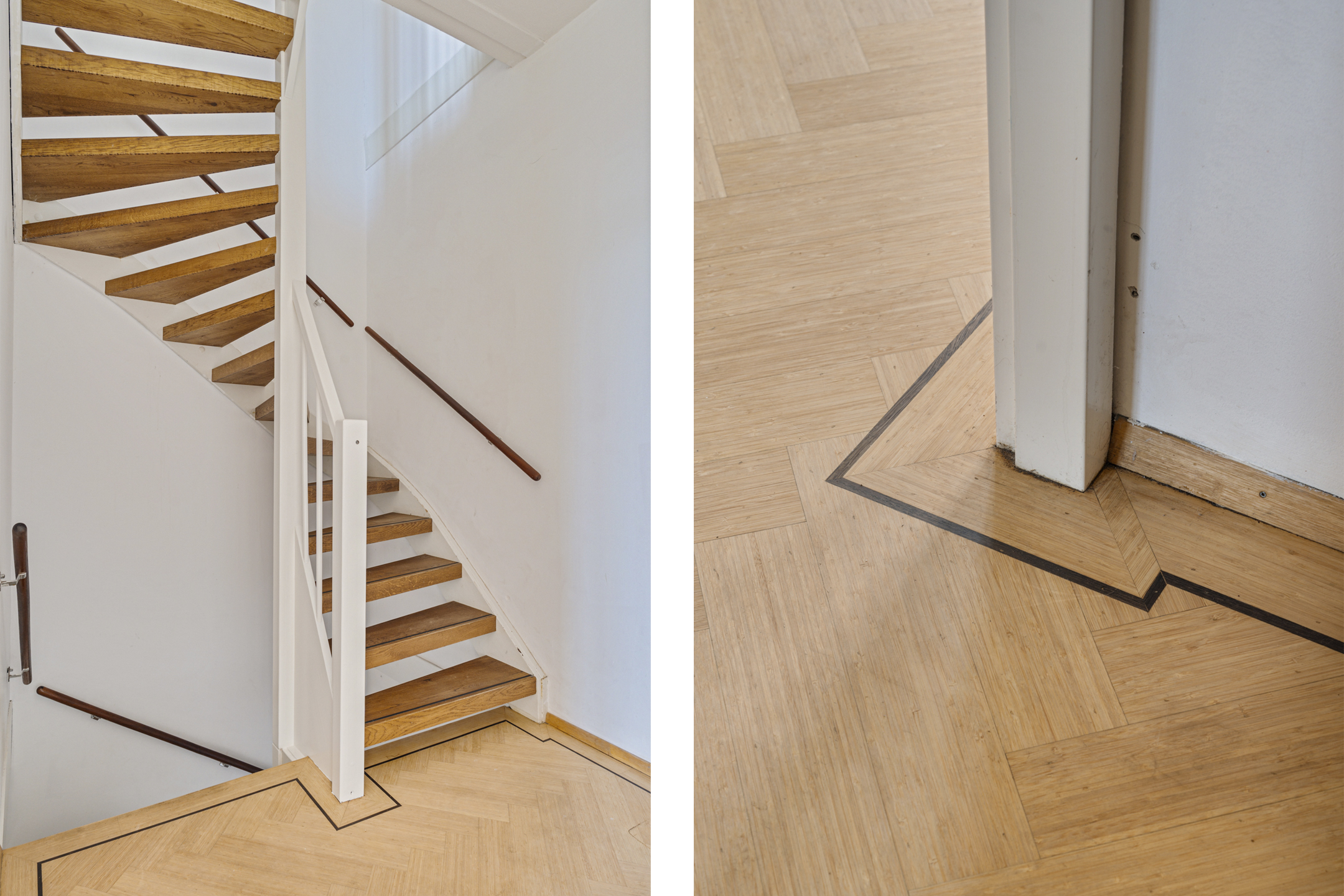 + In de woonkamer een houten visgraat vloer met band en bies