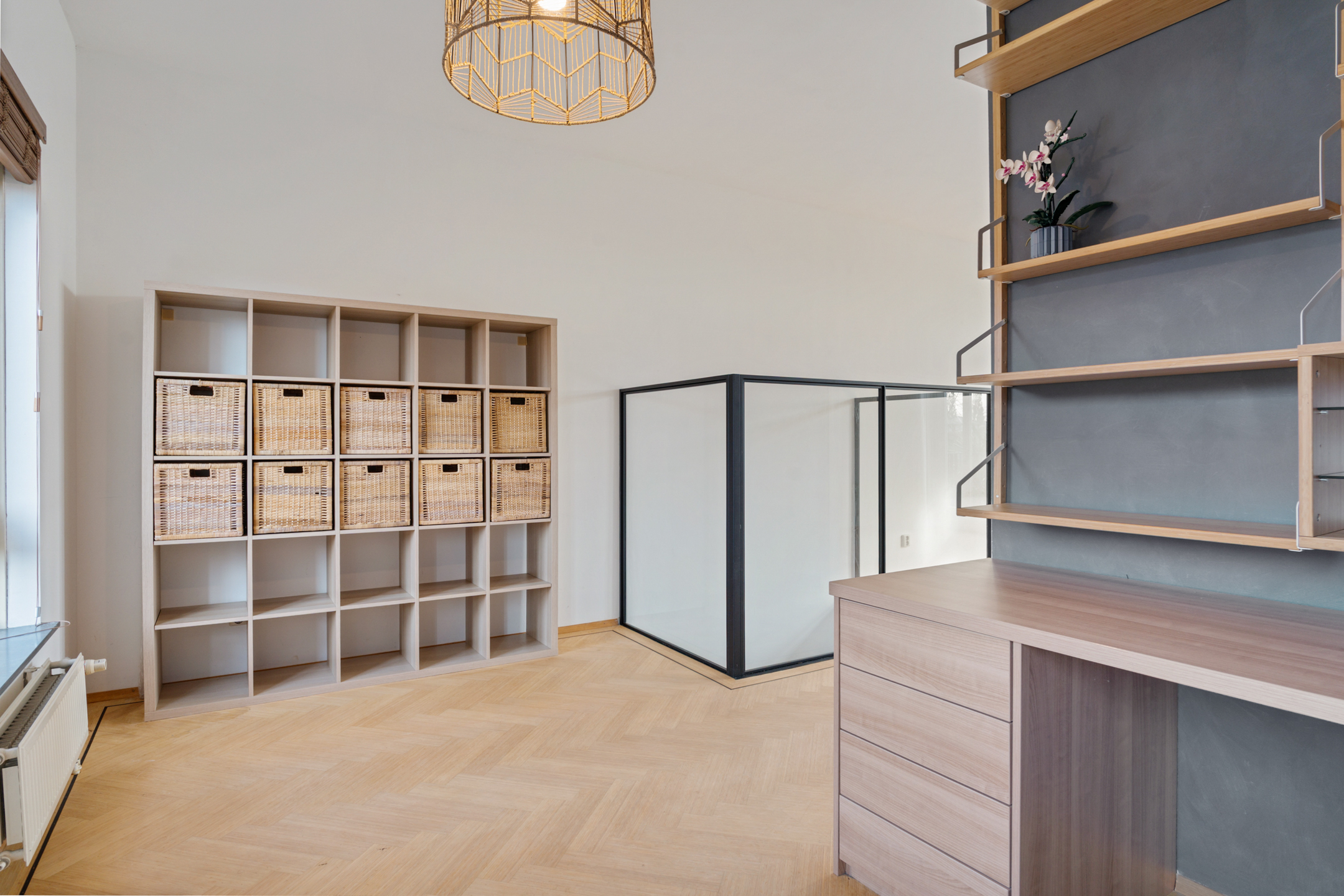 De overloop geeft toegang tot de woonkamer: een lichte en sfeervolle leefruimte met een centraal gelegen vide, volledig omringd door een glaswand. Dit architectonische element vormt een echte blikvanger en geeft een uniek zicht op de woonkeuken beneden.