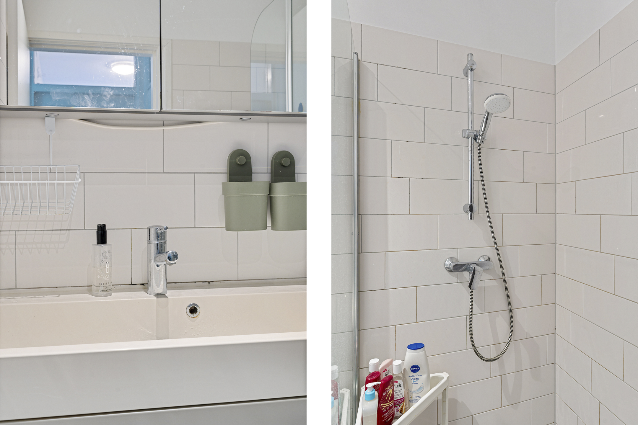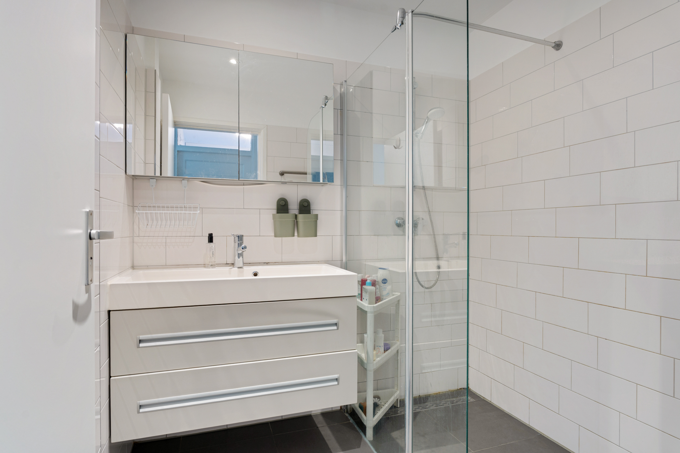 De badkamer is modern afgewerkt en voorzien van een inloopdouche met glazen wand, een wastafelmeubel met spiegelkast en een strakke tegelafwerking. Het separate toilet bevindt zich eveneens in de woning, wat bijdraagt aan extra comfort.