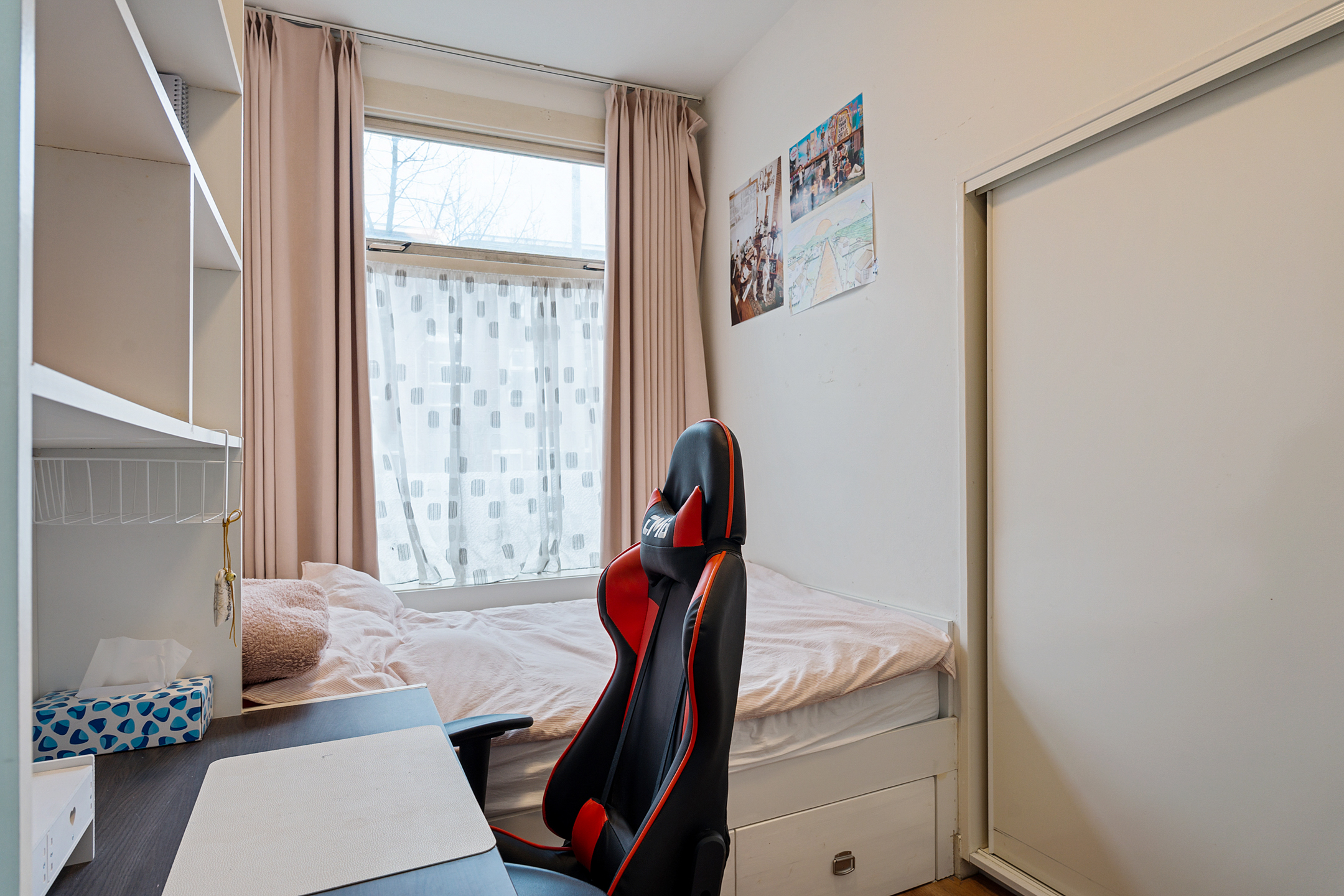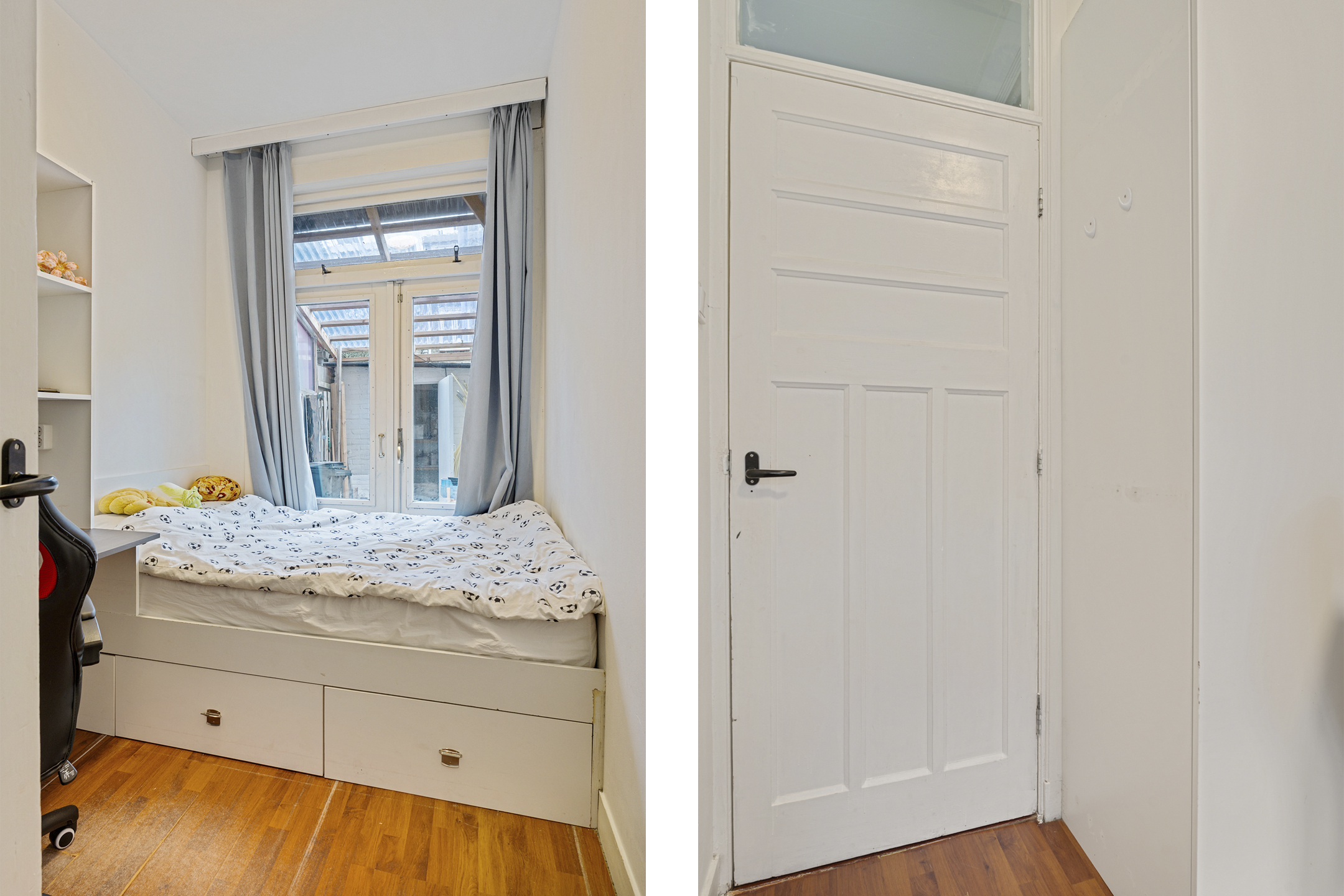 Aan de voorzijde bevinden zich twee slaapkamers. Dankzij de grote raampartijen profiteren deze kamers van prettige lichtinval. Ze zijn flexibel in te richten als hoofdslaapkamer, kinder-, werk- of logeerkamer.