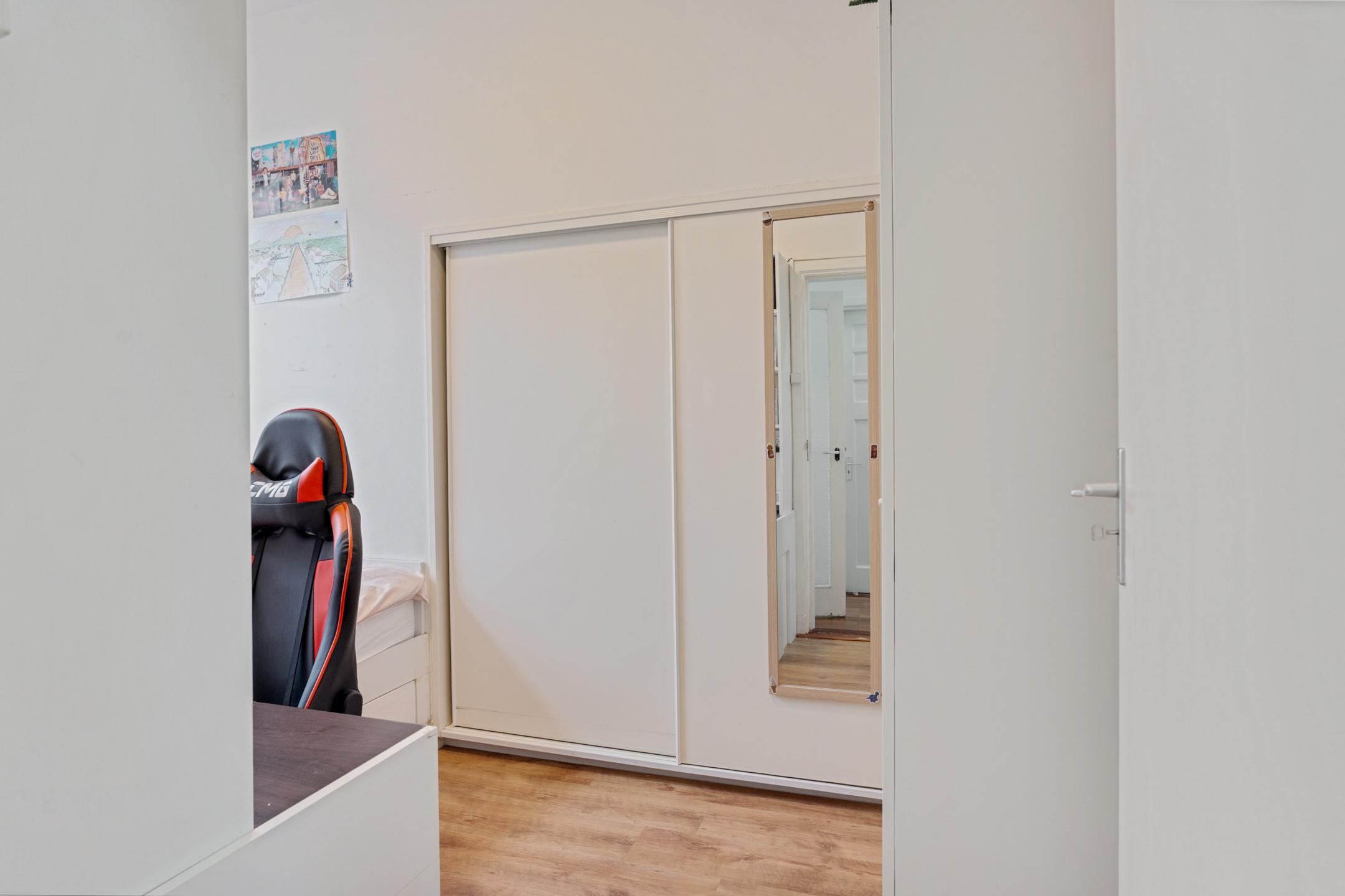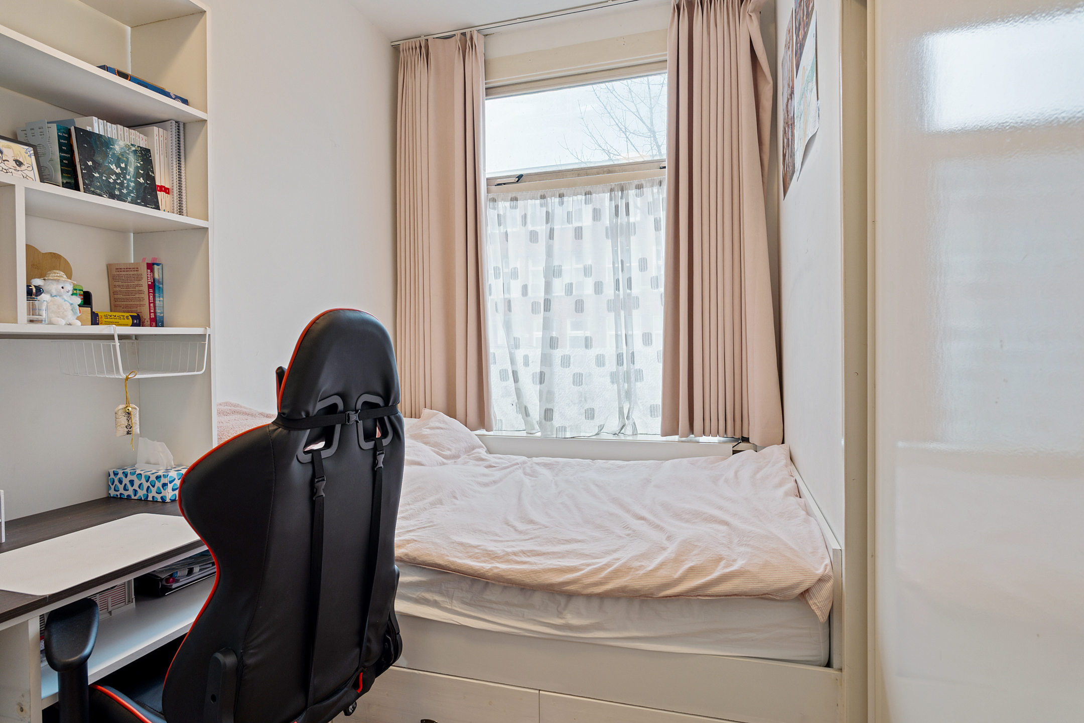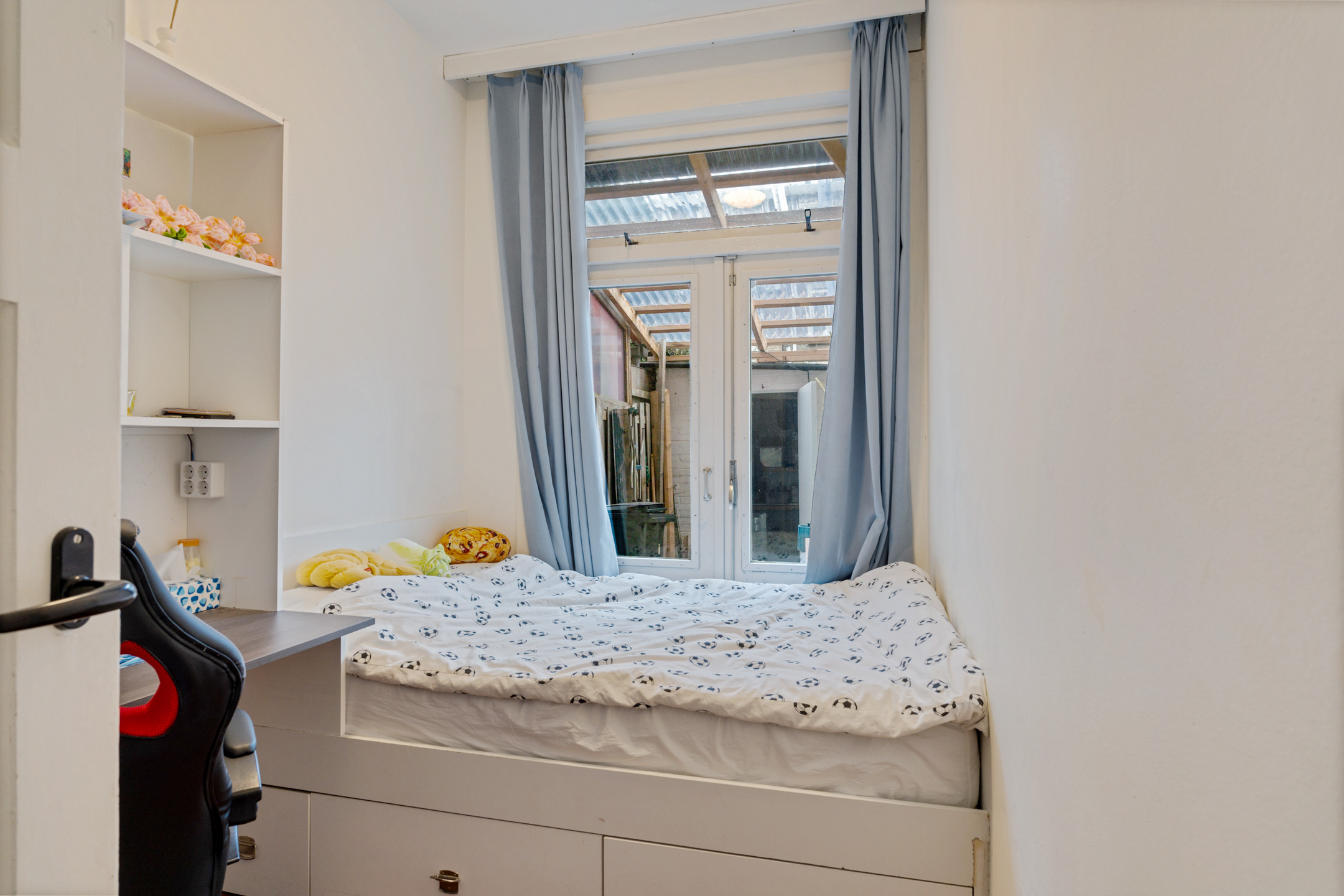 Naast het toilet bevindt zich aan de achterzijde de derde slaapkamer. Deze kamer is ideaal als rustige werkplek, extra slaapkamer of logeerruimte en ligt eveneens aan de tuinzijde.
