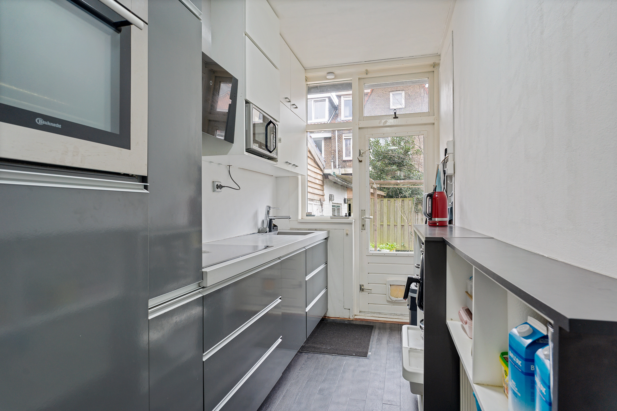 Aan de achterzijde ligt de lichte woonkamer met voldoende ruimte voor zowel een zit- als een eethoek. De openslaande deuren zorgen voor een fijne verbinding met de tuin en laten het daglicht rijkelijk binnenstromen. De keuken ligt ook aan de achterzijde en is praktisch ingericht met diverse inbouwapparatuur en volop werk- en kastruimte. Vanuit hier is er direct toegang tot de achtertuin.