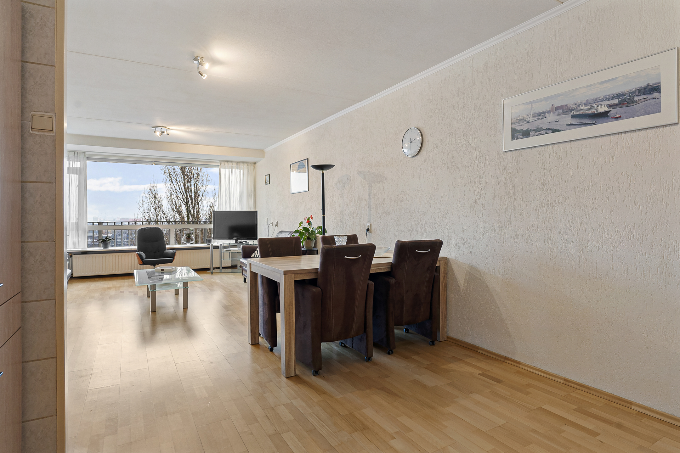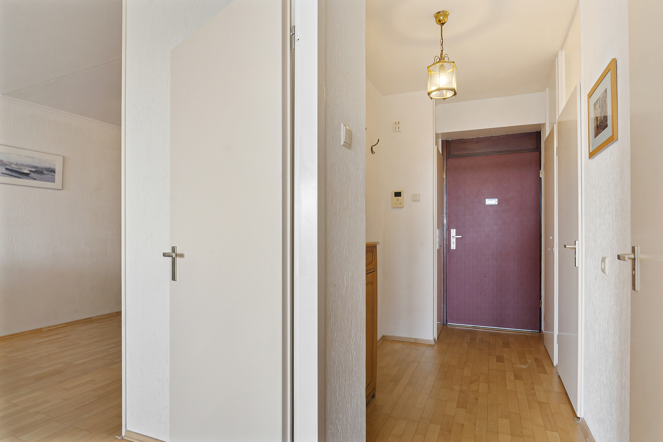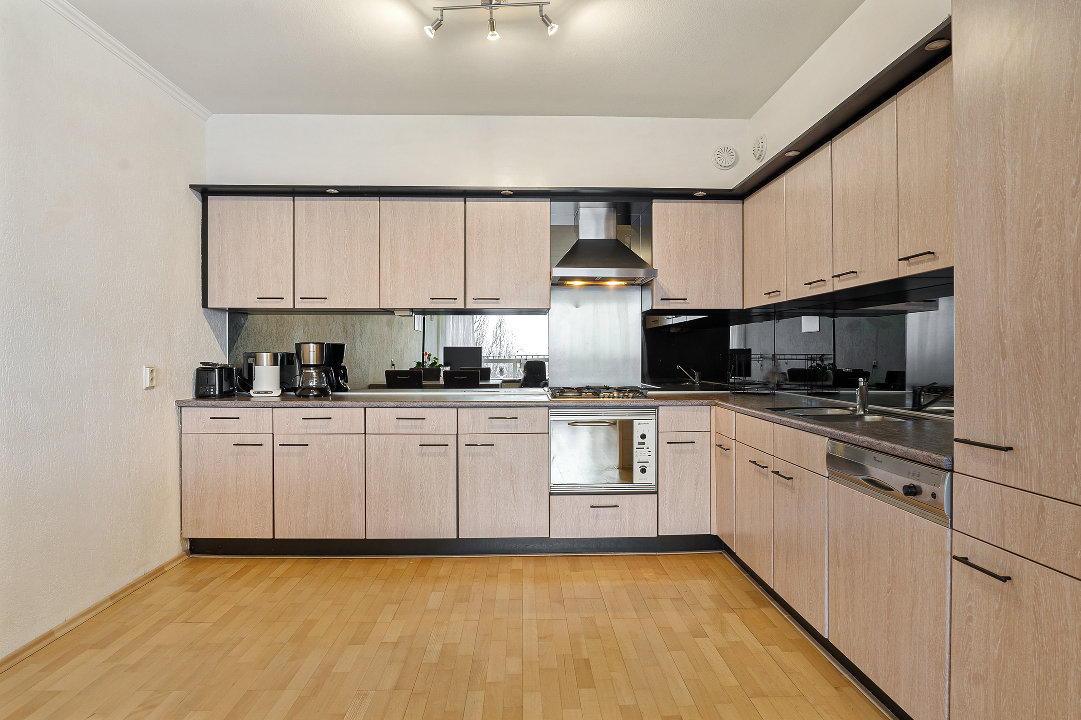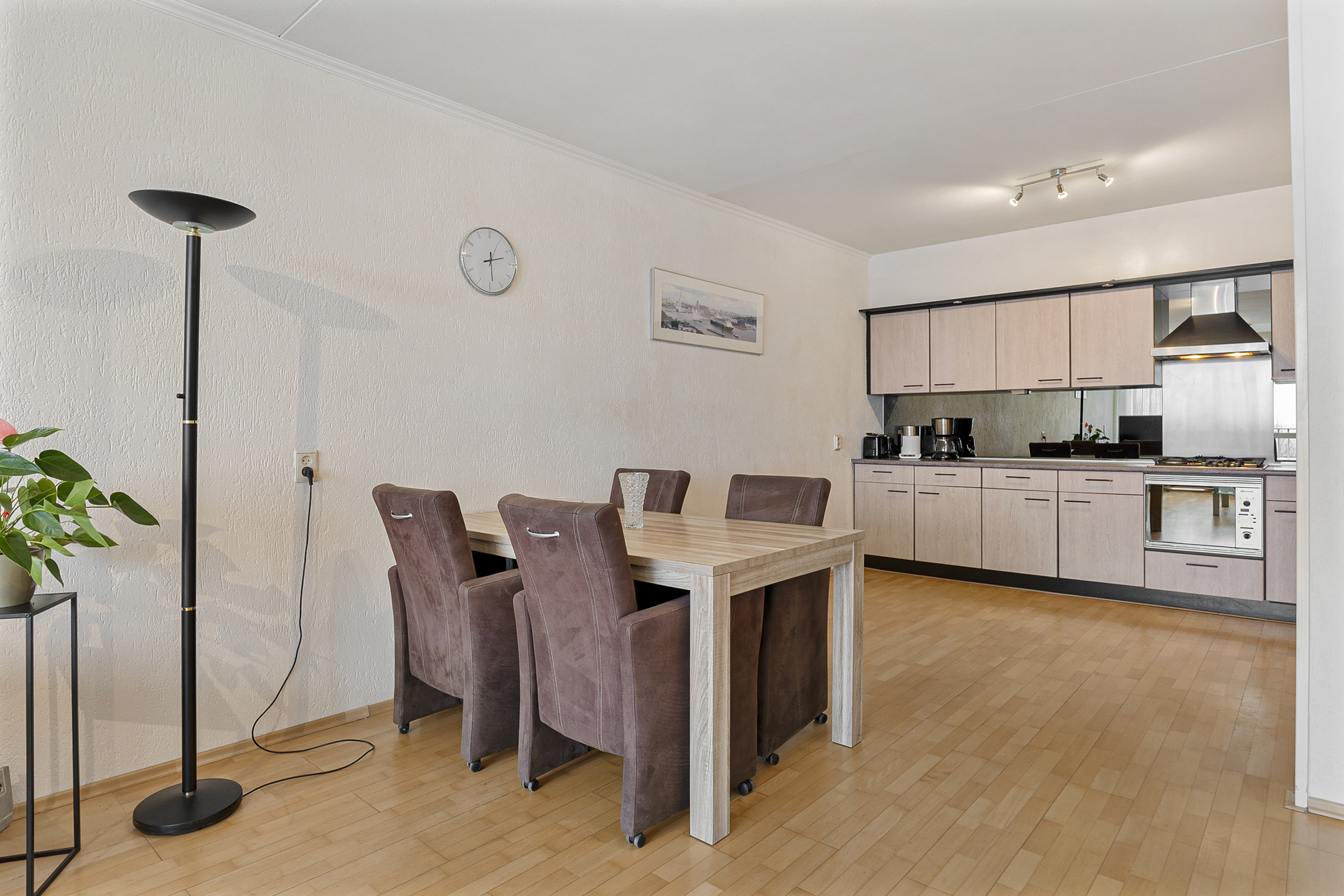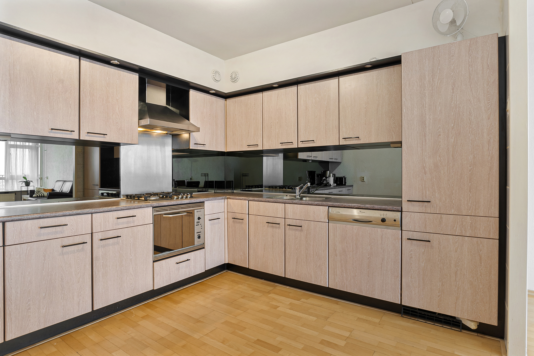 Via de hal van het appartement heb je toegang tot alle vertrekken. De woonkamer is ruim en biedt veel lichtinval en een mooi uitzicht. Aangrenzend vind je de ruime open hoekkeuken. Deze is praktisch ingedeeld en beschikt over veel werk- en opbergruimte. De keuken is uitgerust met diverse inbouwapparaten, zoals een koel-/vriescombinatie, combi-oven, een afzuigkap en een 4-pits gasfornuis. Dankzij de slimme indeling en het formaat is dit een ideale keuken voor wie graag kookt of extra ruimte waardeert.