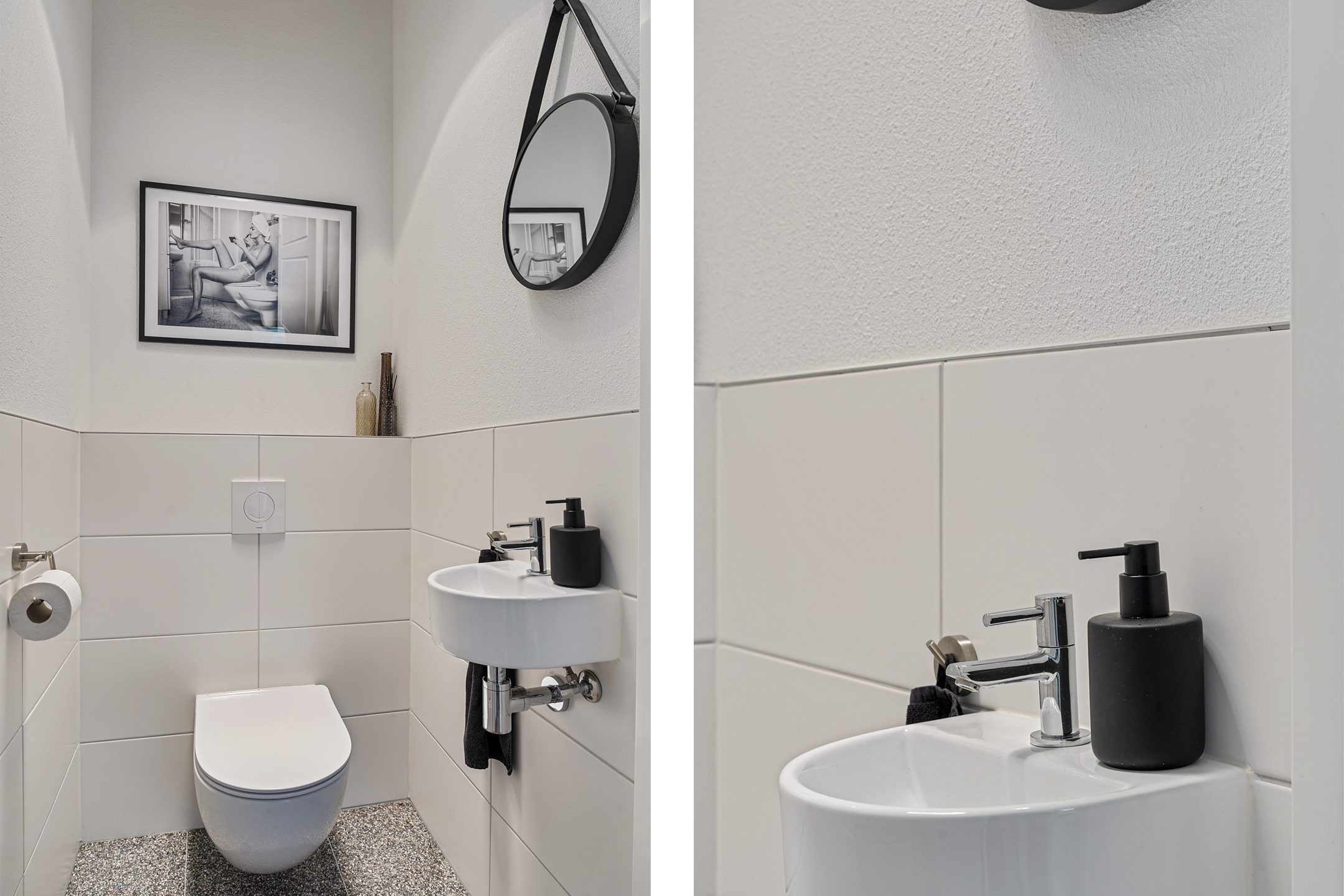 Je komt binnen in een ruime hal met meterkast, garderobe en toegang tot de inpandige berging waar je ook de aansluiting voor wasapparatuur vindt. Het separate toilet is modern afgewerkt met een wandcloset en fontein.