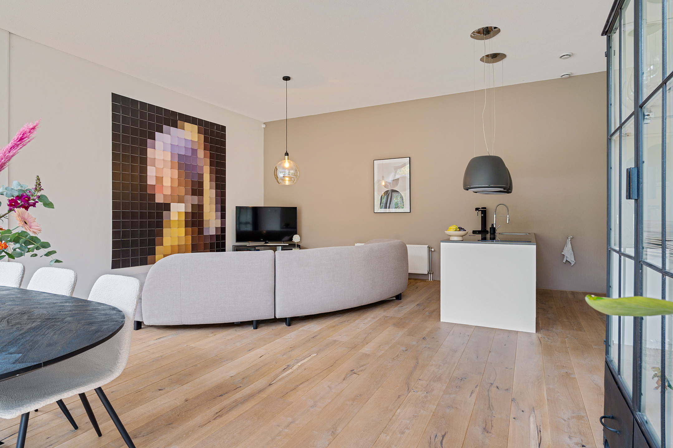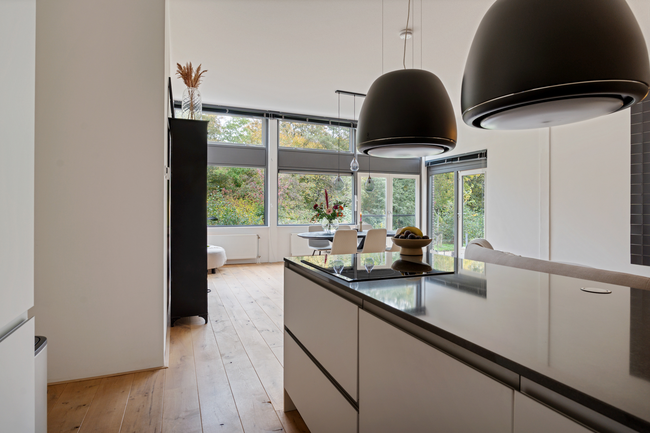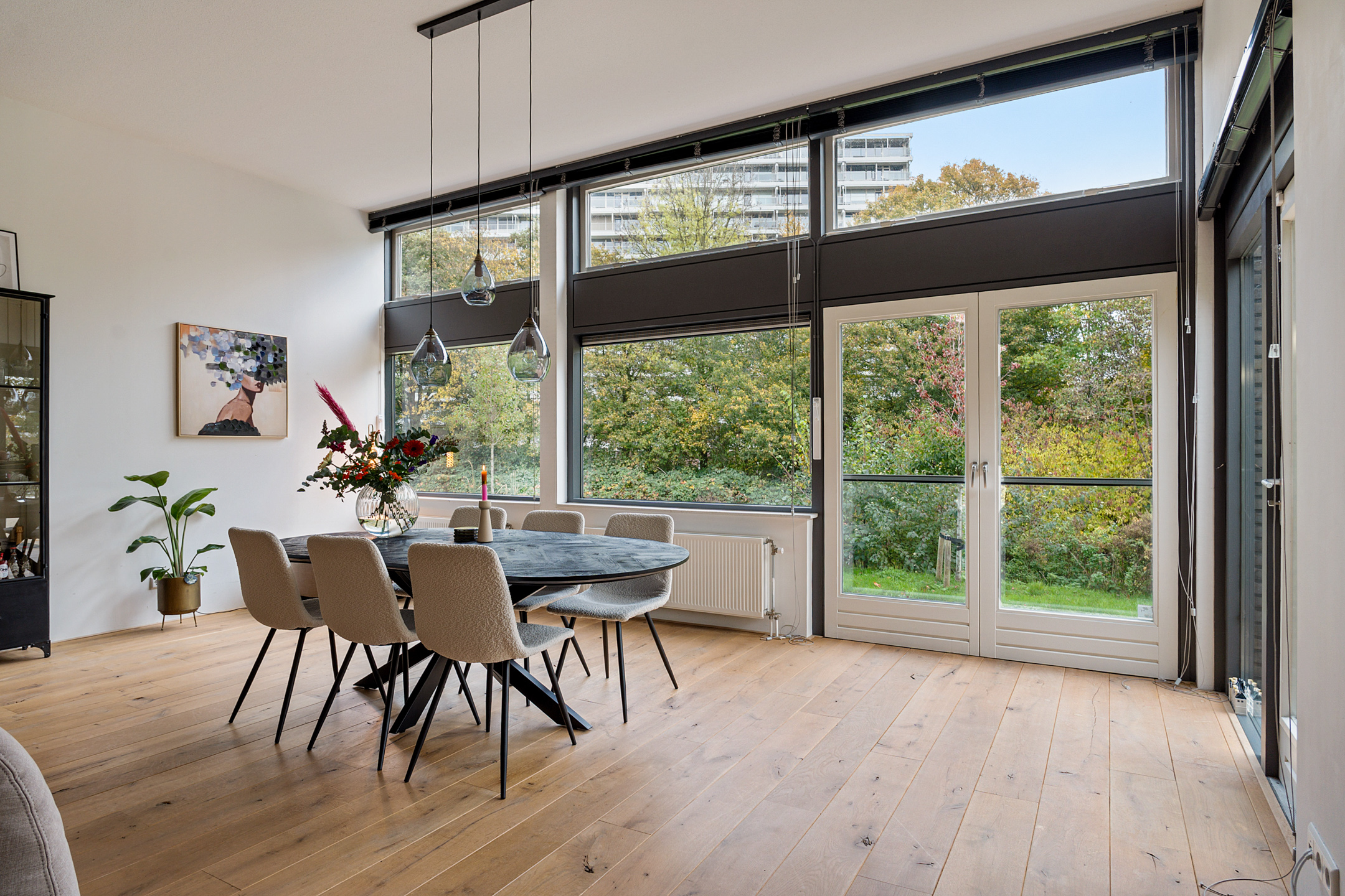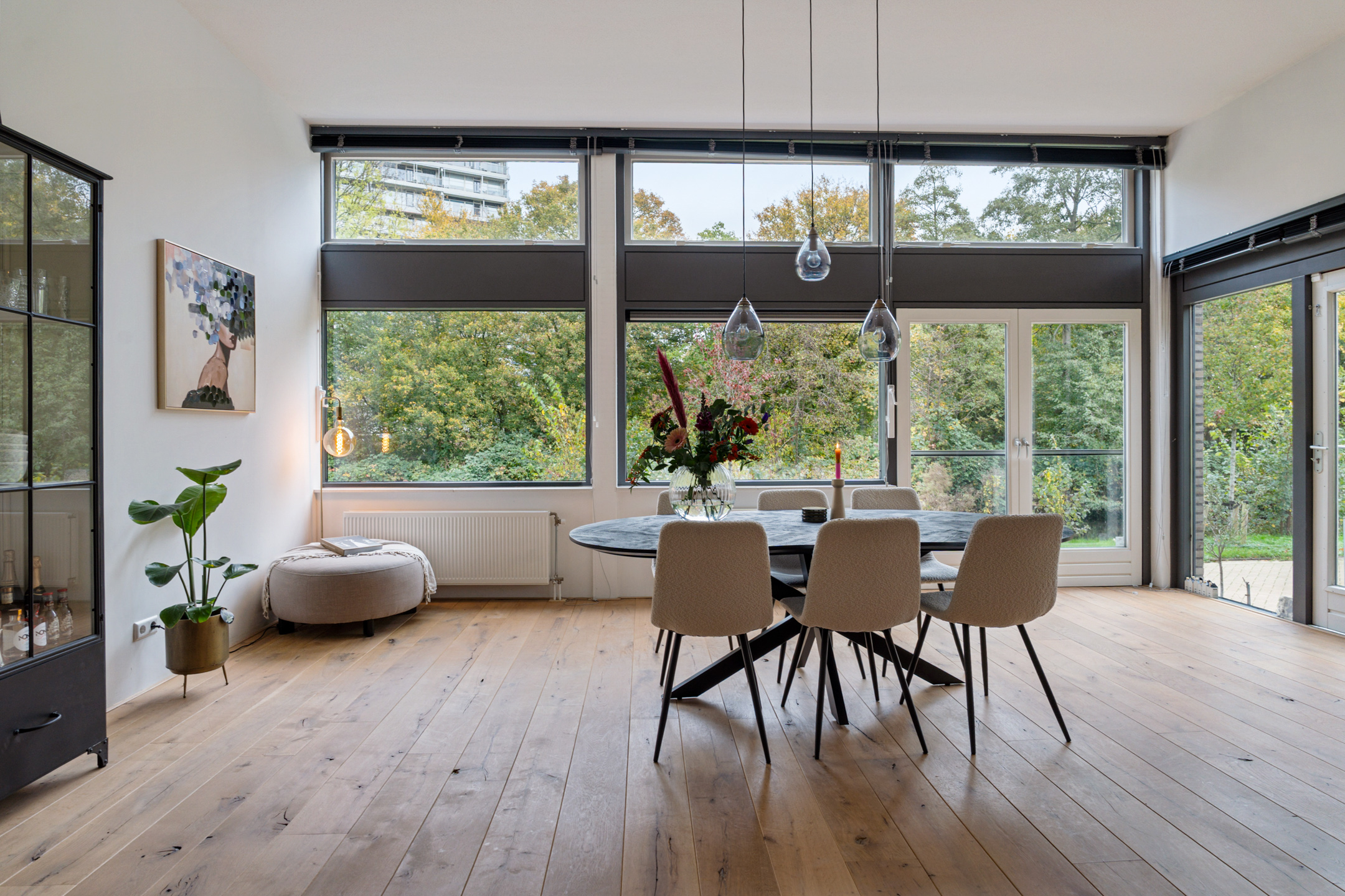 De woonkamer voelt direct ruim en licht door de grote ramen en het bijzondere hoge plafond. De houten vloer, strakke afwerking en het vrije zicht op het groen creëren een rustige en prettige leefruimte. Via de enkele openslaande deur loop je zo de achtertuin in, waar je in de ochtendzon kunt genieten tot ongeveer 15.00 uur.