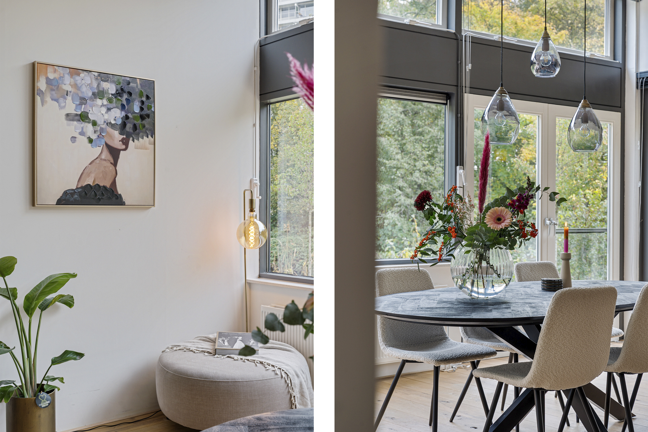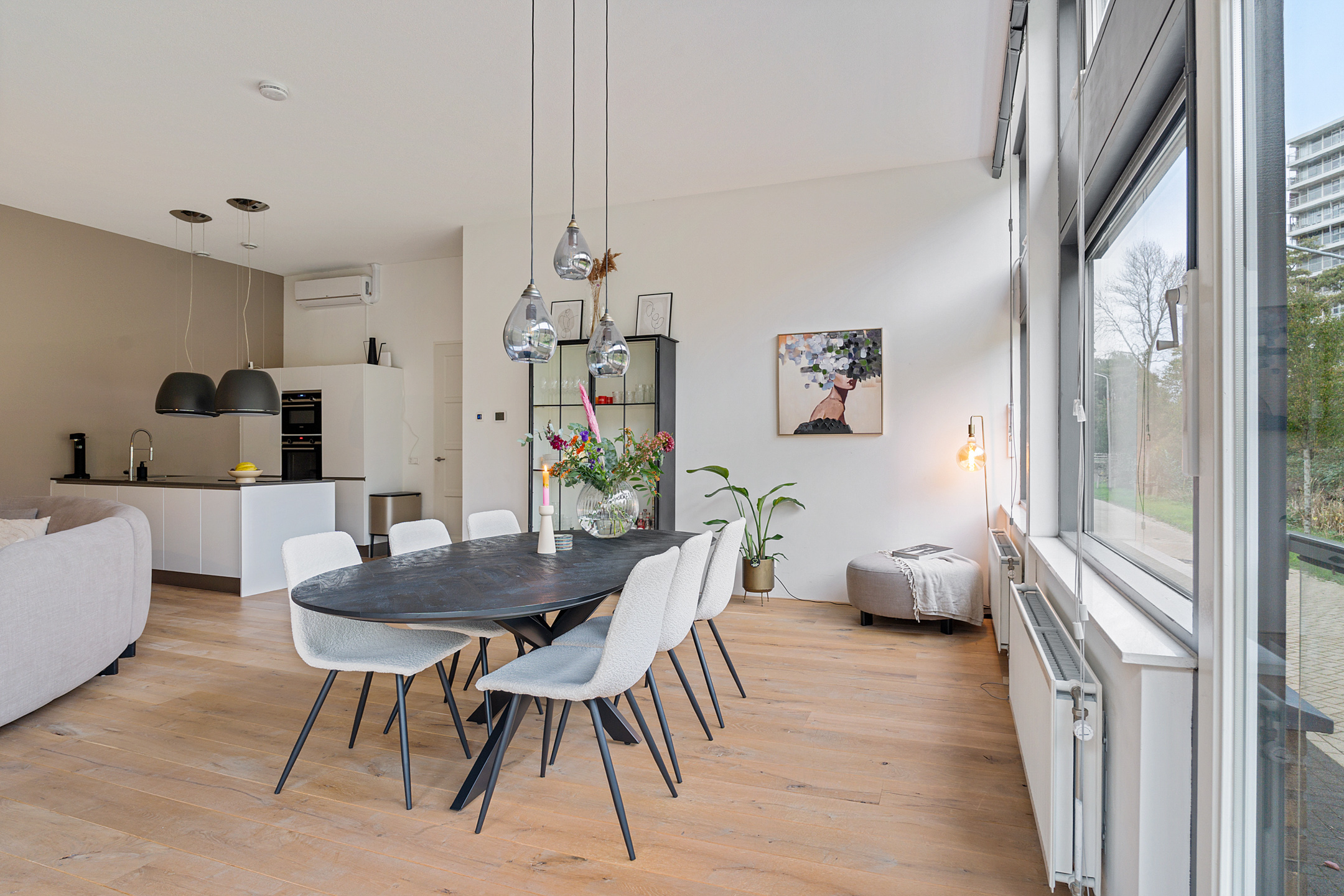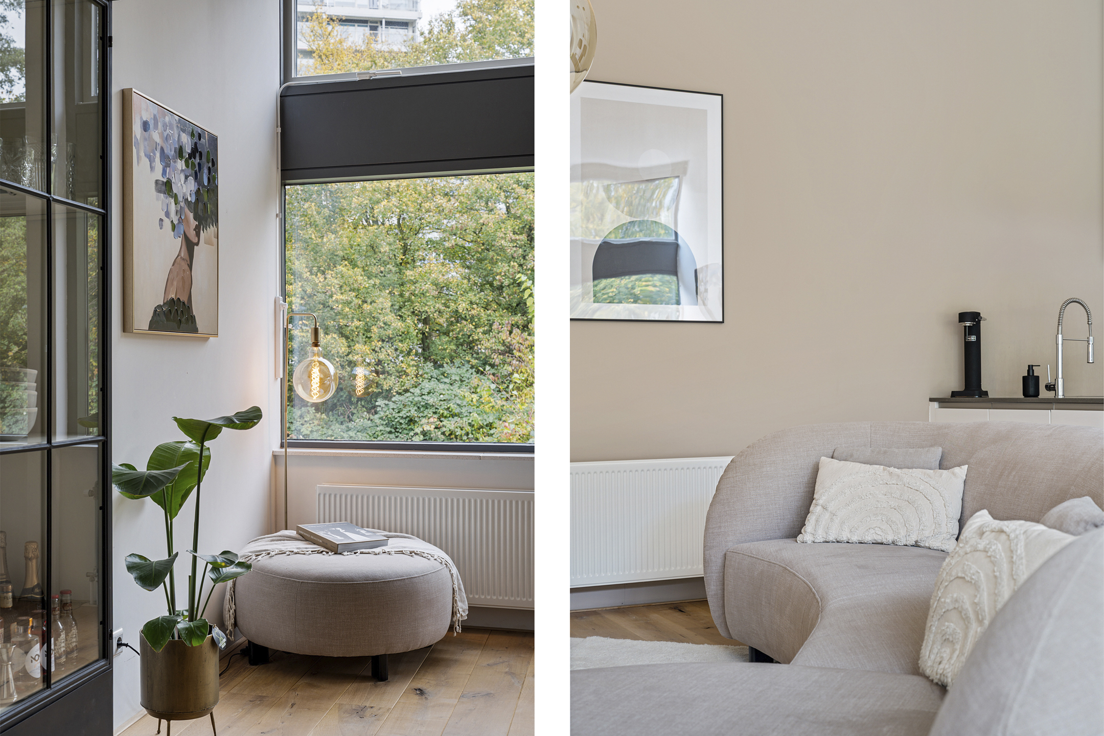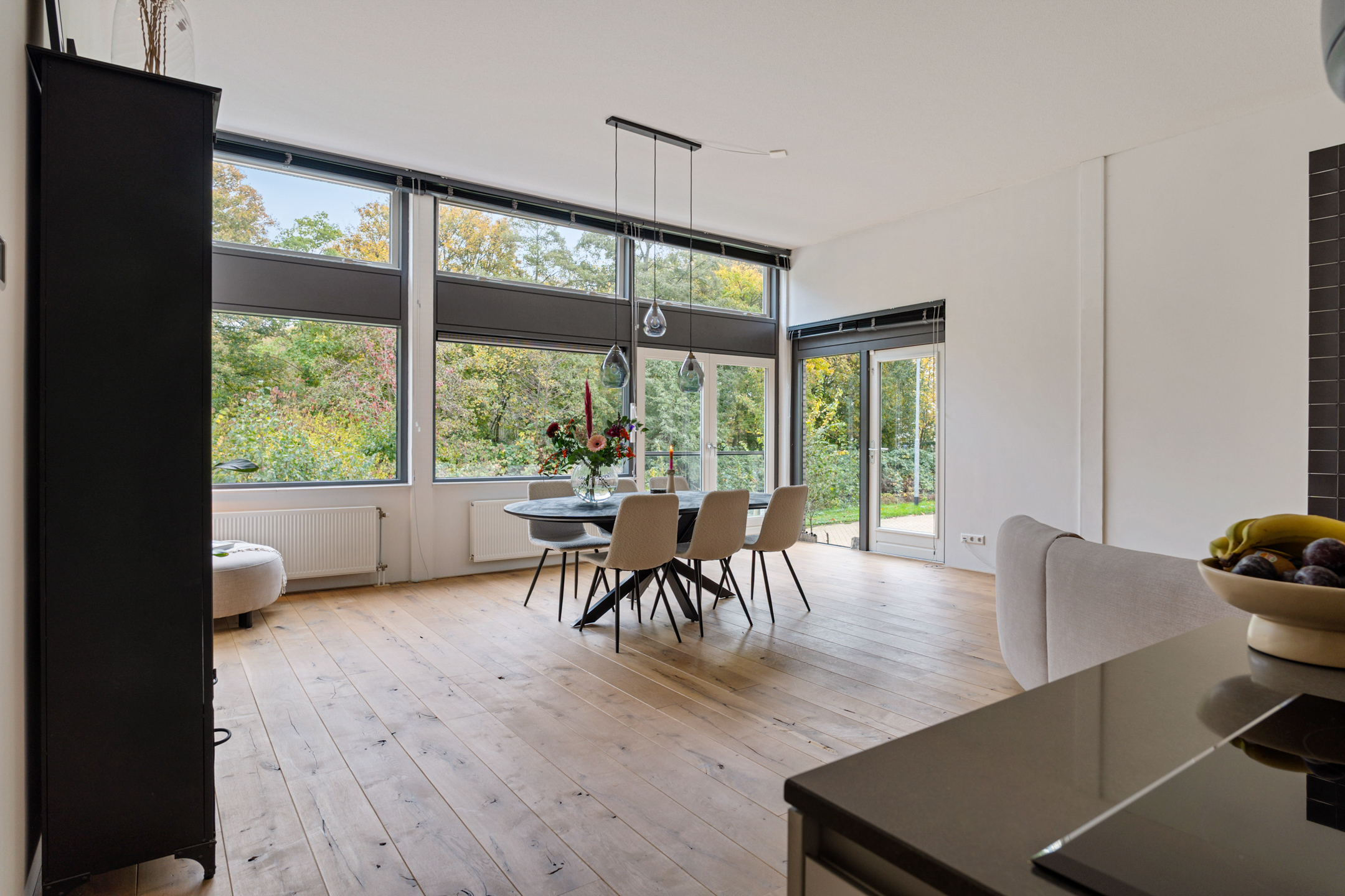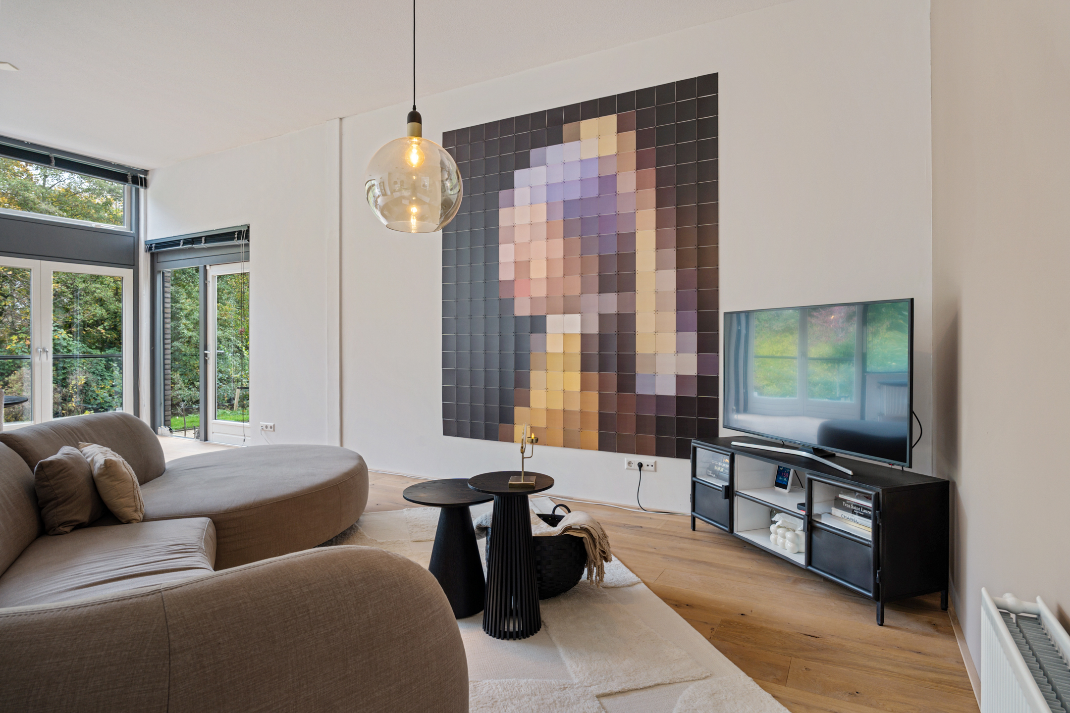 De woonkamer voelt direct ruim en licht door de grote ramen en het bijzondere hoge plafond. De houten vloer, strakke afwerking en het vrije zicht op het groen creëren een rustige en prettige leefruimte. Via de enkele openslaande deur loop je zo de achtertuin in, waar je in de ochtendzon kunt genieten tot ongeveer 15.00 uur.