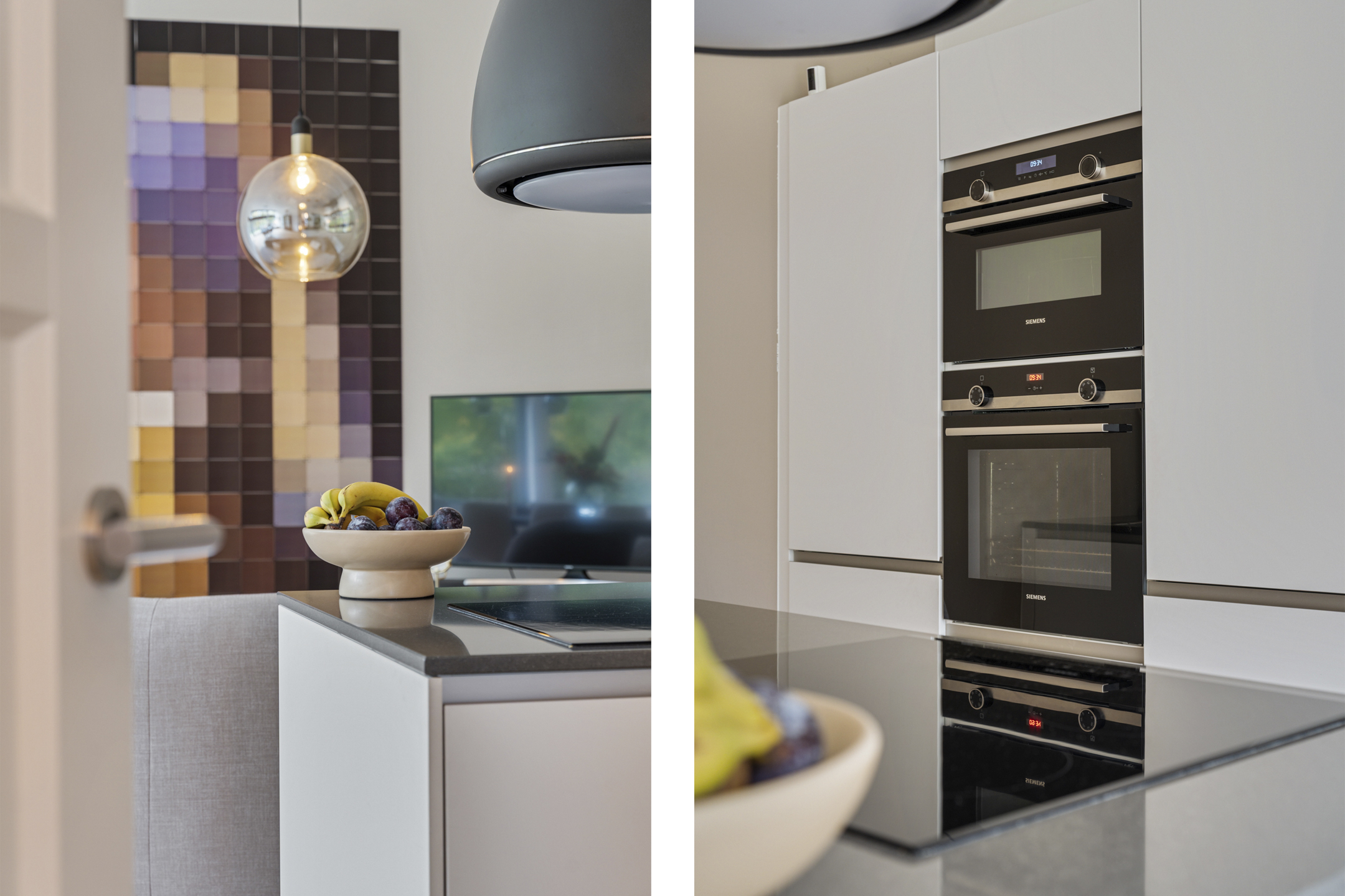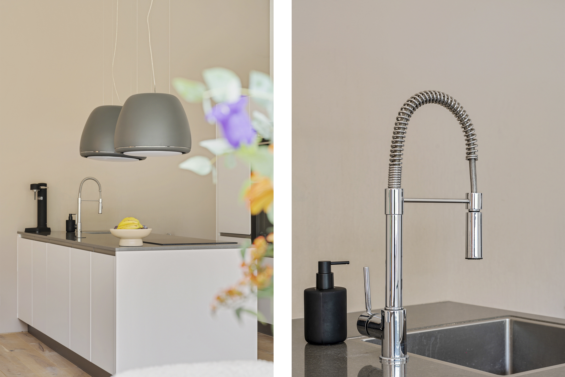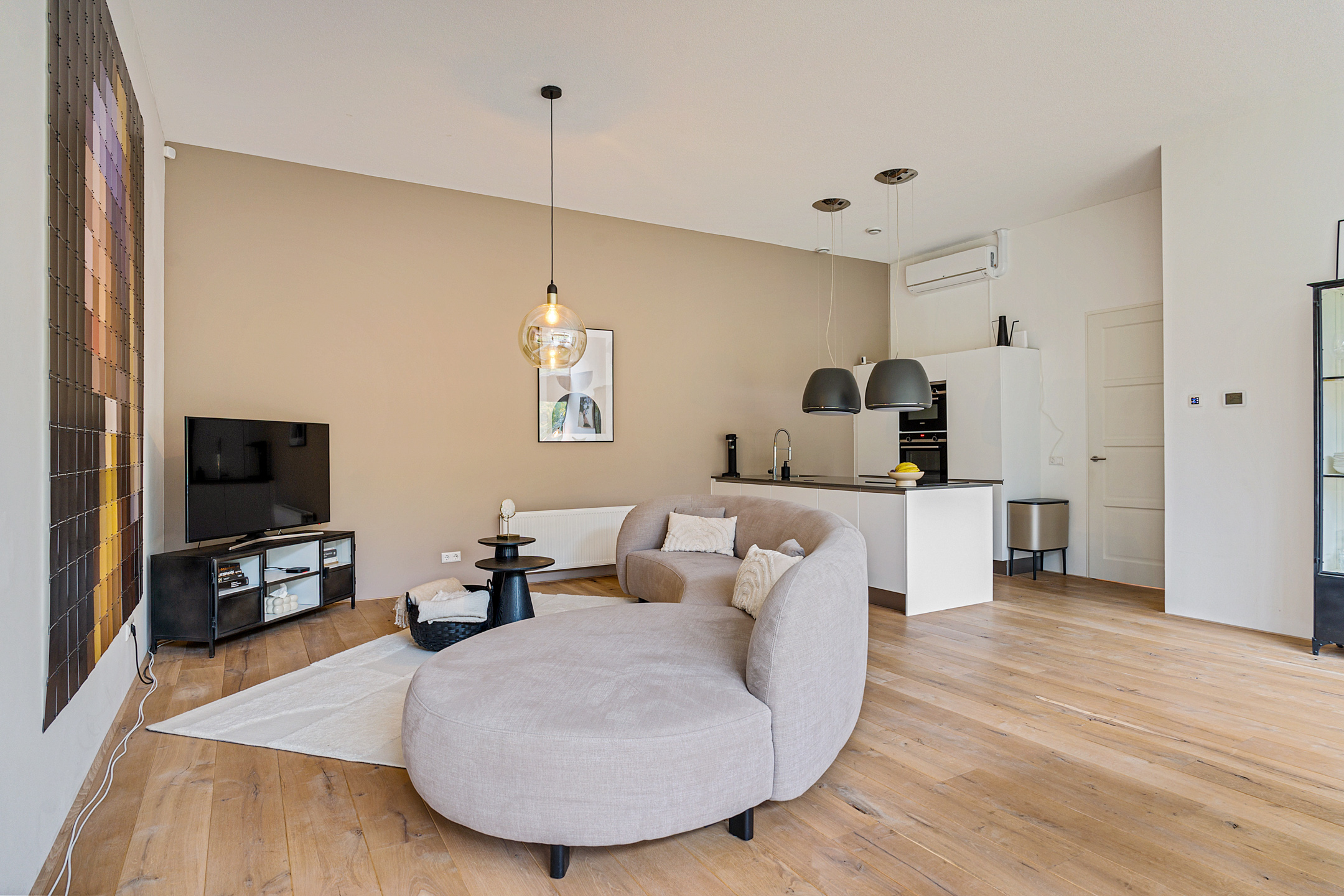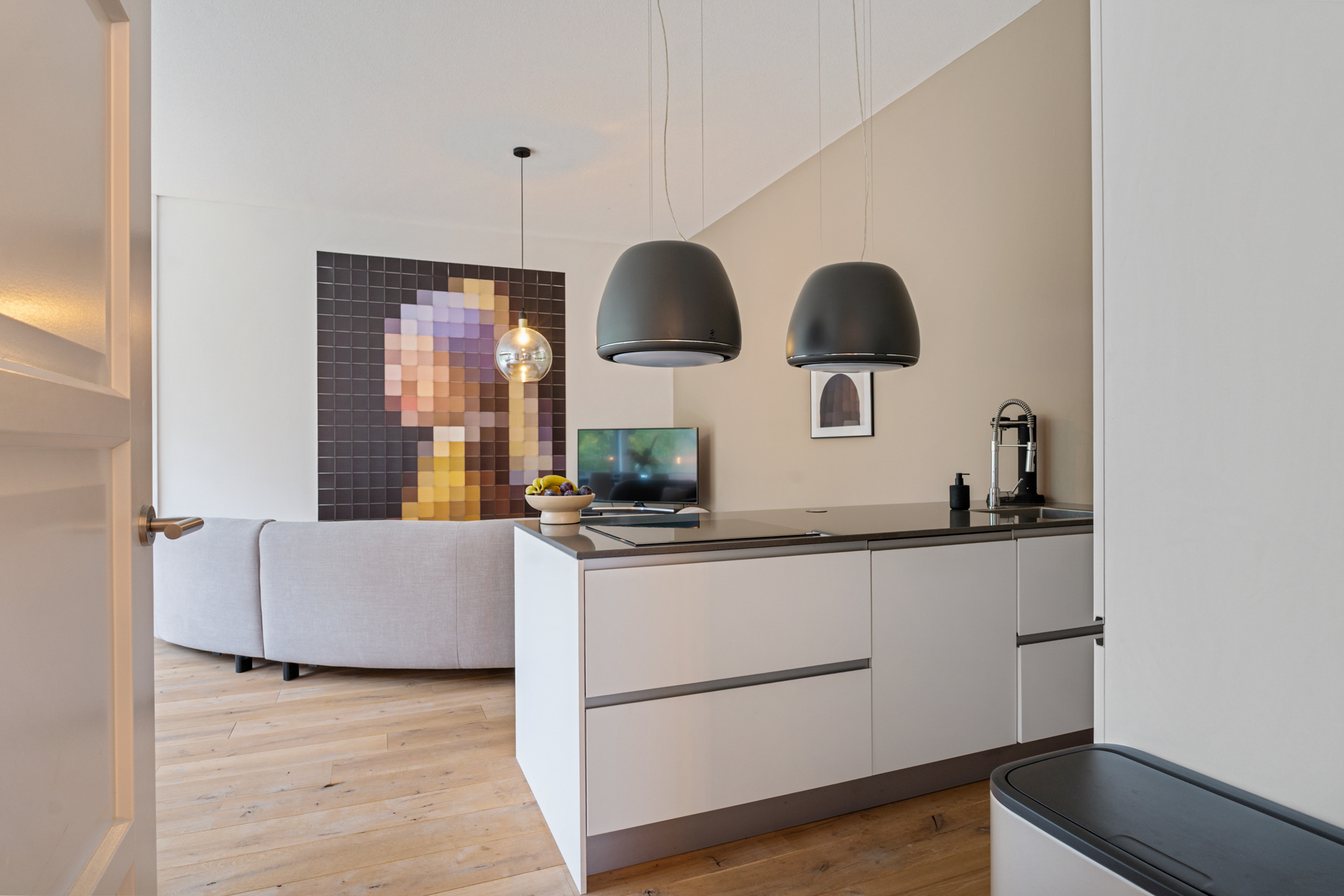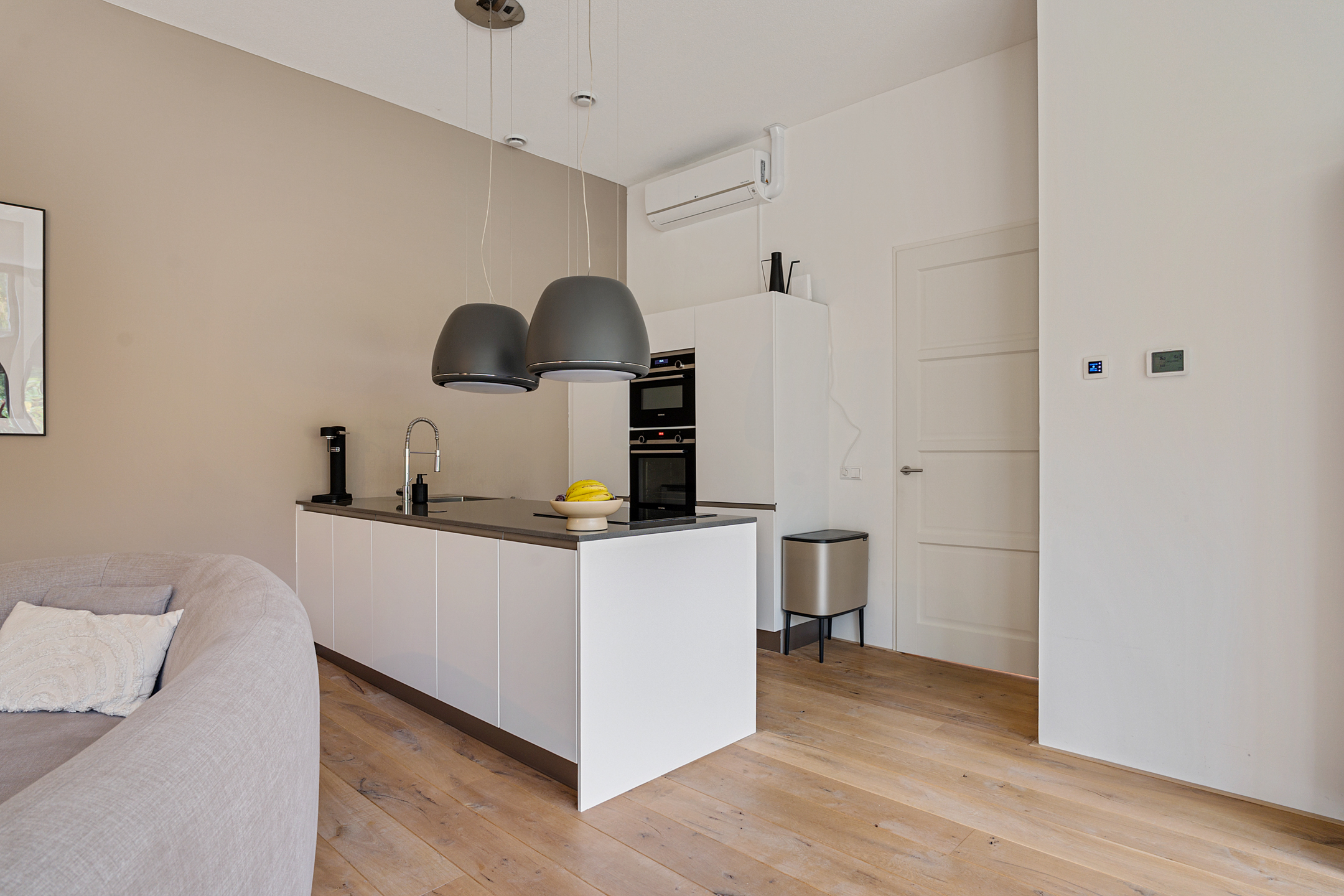 De voortuin biedt vanaf circa 17.00 uur zon, waardoor je op meerdere momenten van de dag buiten kunt zitten. De open keuken met kookeiland vormt het hart van de woonkamer. Deze moderne keuken is uitgerust met een inductiekookplaat, twee afzuigkappen die tevens als lamp functioneren en een echte eyecatcher vormen, combi-oven, oven, vaatwasser, koelkast en vriezer.
