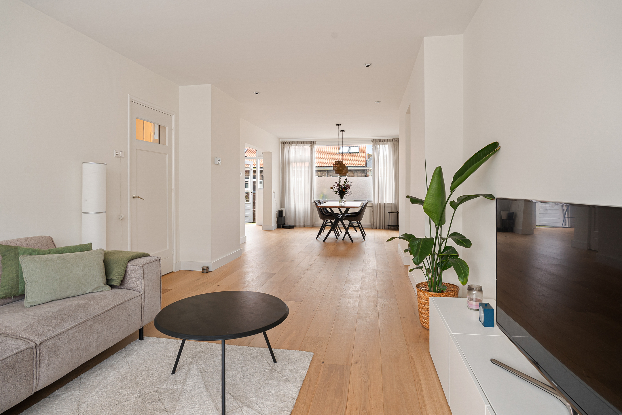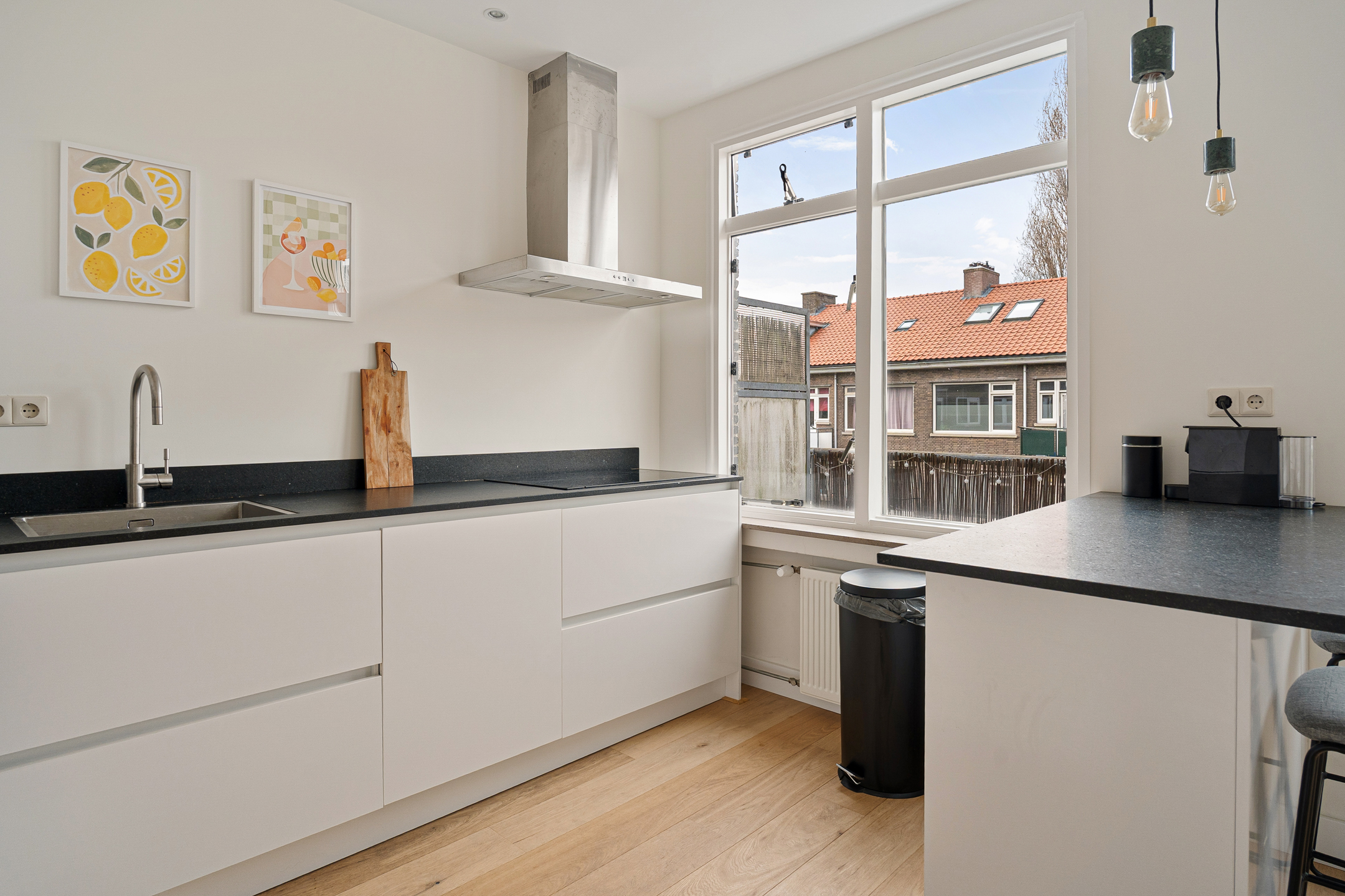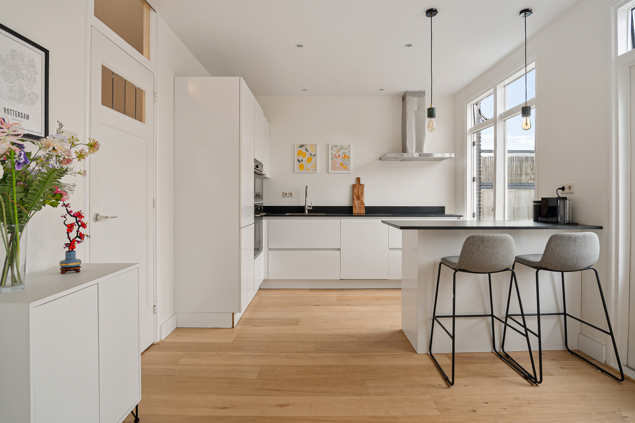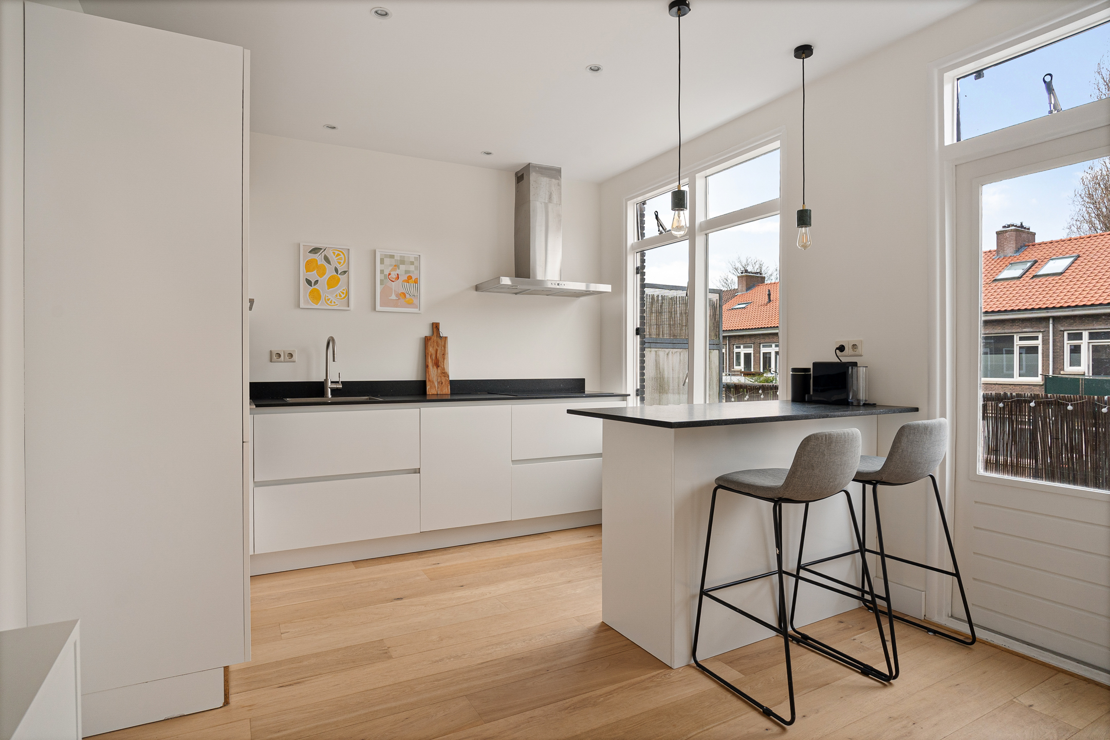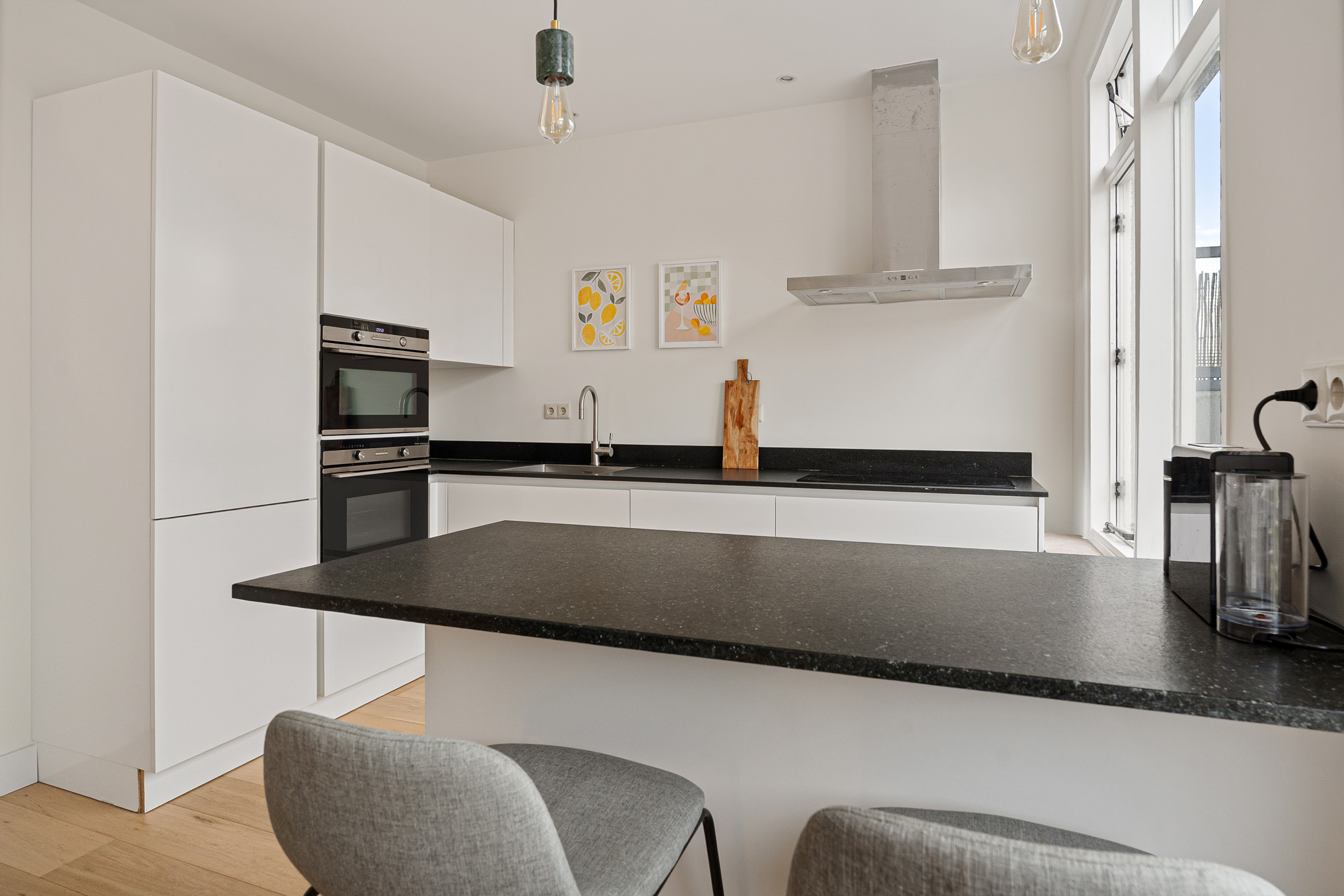 in de hal, waar zich een separaat toilet en praktische bergruimte bevinden. De lichte woonkamer valt direct op door de grote raampartijen en de prettige sfeer. De open keuken met eiland sluit mooi aan op het leefgedeelte en is van alle gemakken voorzien, zoals een ruime koelkast, vriezer, twee ovens en een inductiekookplaat.